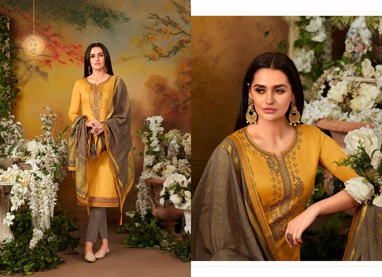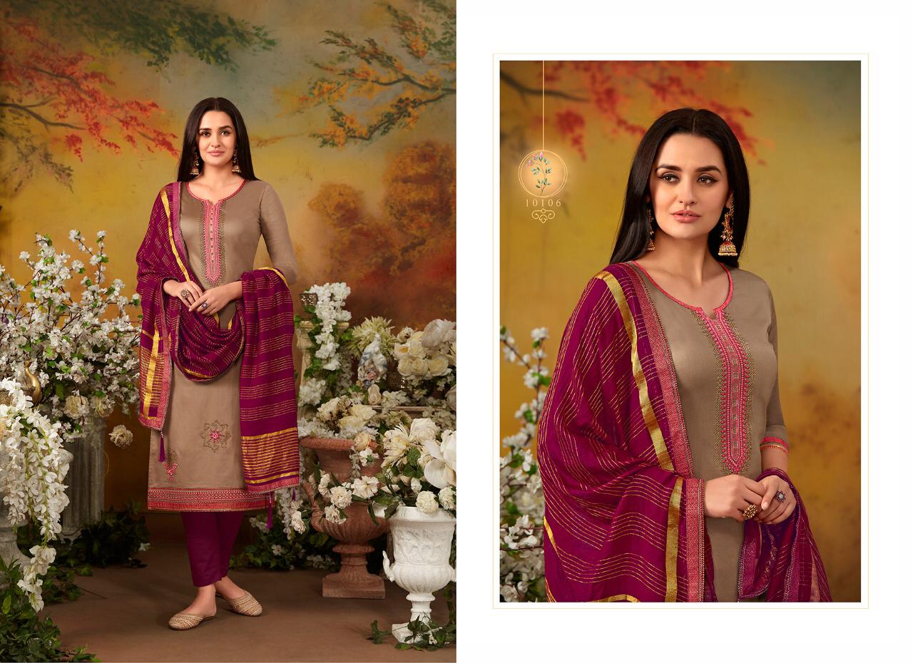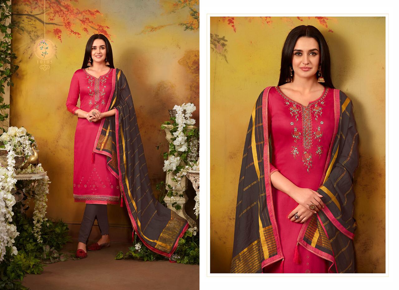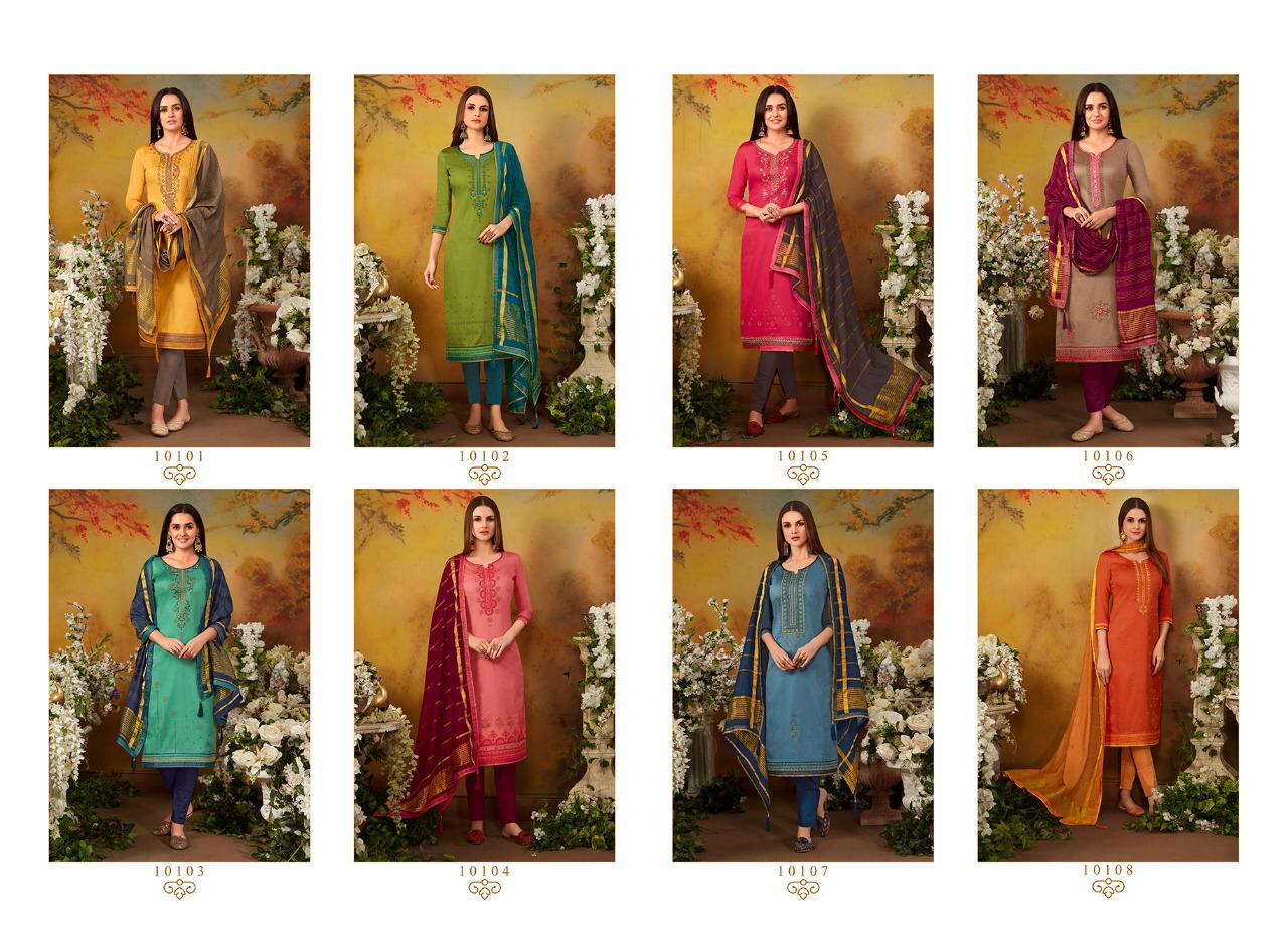 Ramaiya (Kessi Fabrics Pvt. Ltd.) has launched Catalog name : Zanzar Vol - 2 Fabric Details âªTop:- JAM SILK WITH SWAROVSKI DIAMOND WORK WITH EMBROIDERY WORK âªBottom:- Cotton âªDupatta:- COTTON SILK WITH FANCY BORDER âªTotal Design:- 8 Rate - 799/- Set to set . GST 5 Percent Extra â°Dispatching 5 to 6 days later |