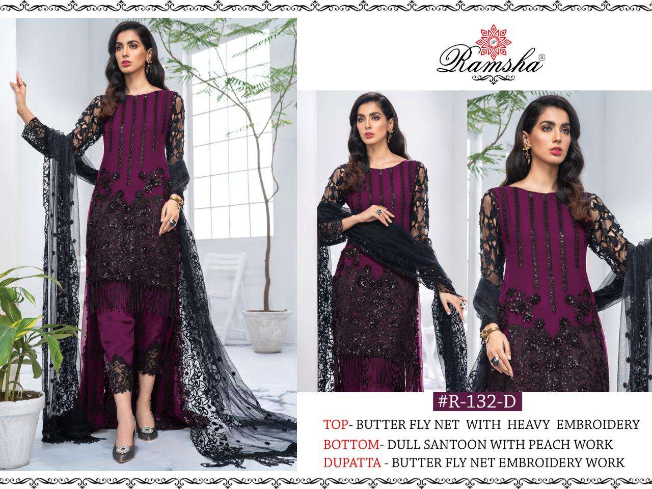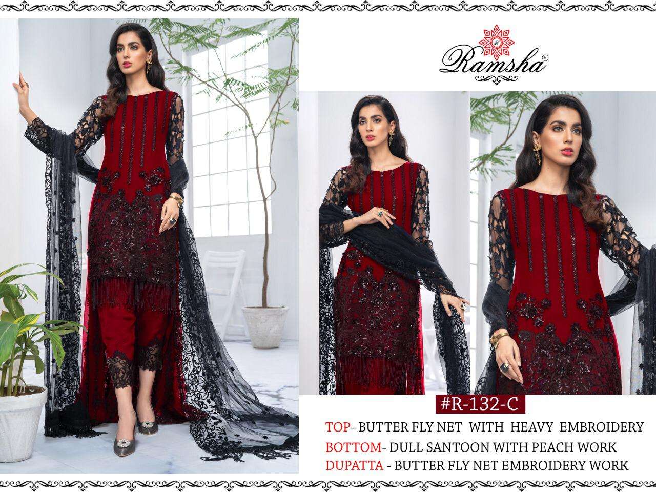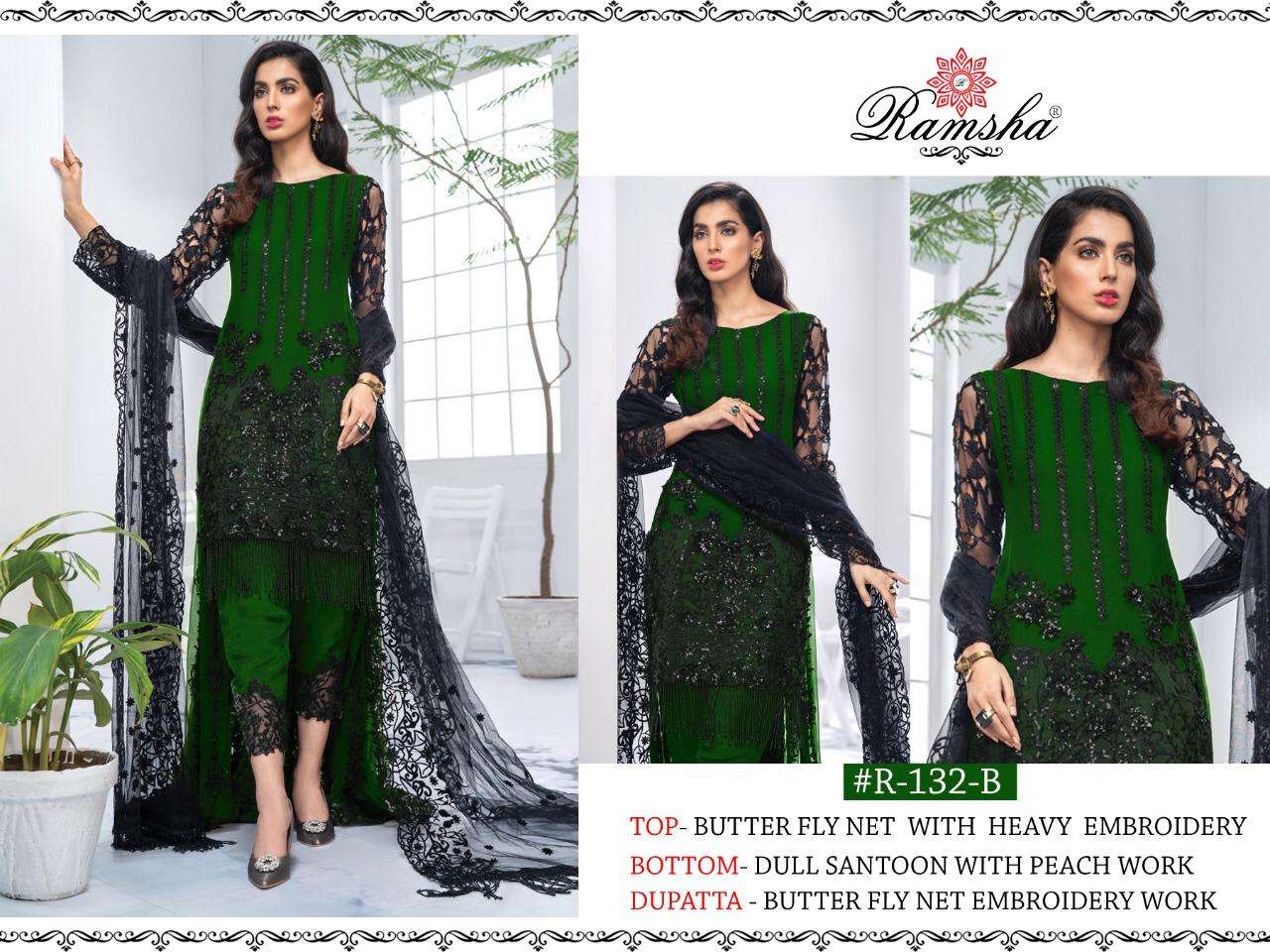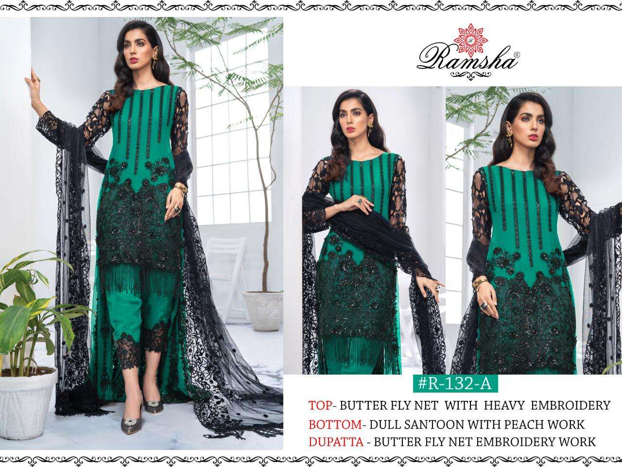 RAMSHA..PRESENT #R-132 nx RATE Â - 1251+GST FABRICS DETAIL:- TOP:- BUTTERFLY NET WITH HEAVY EMBROIDERY BOTTOM:- DULL SANTOON DUPPTA:- NET HEAVY EMBROIDERY Â |