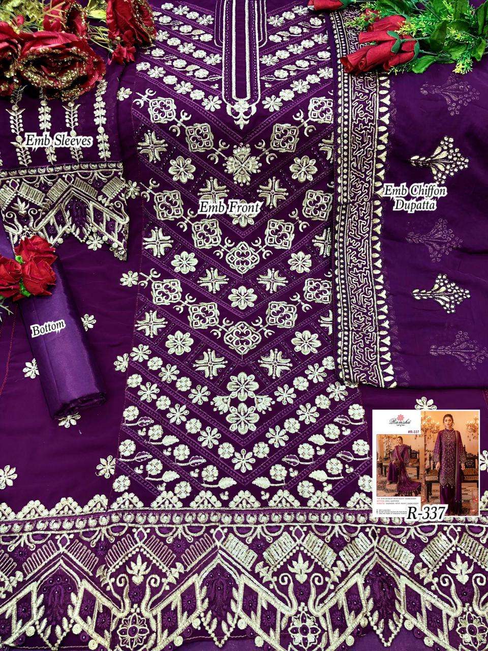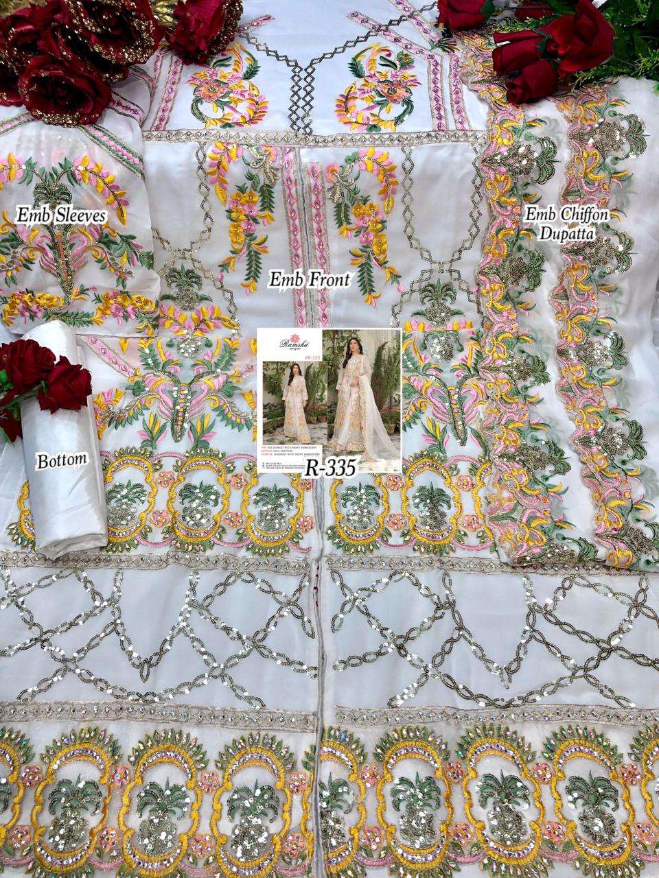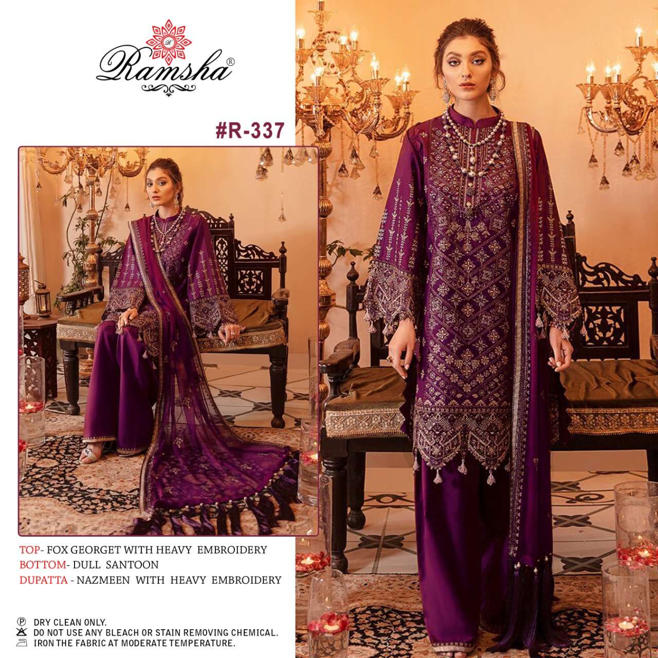 RAMSHA..PRESENT* #R-335 #R-336 #R-337 #R-338 VOL-18 RATE Â - 1251+GST FABRICS DETAIL:- TOP:- GEORGET WITH HEAVY EMBROIDERY BOTTOM:- DULL SANTOON DUPPTA:- NAZMEEN & NET EMBROIDERED Â |