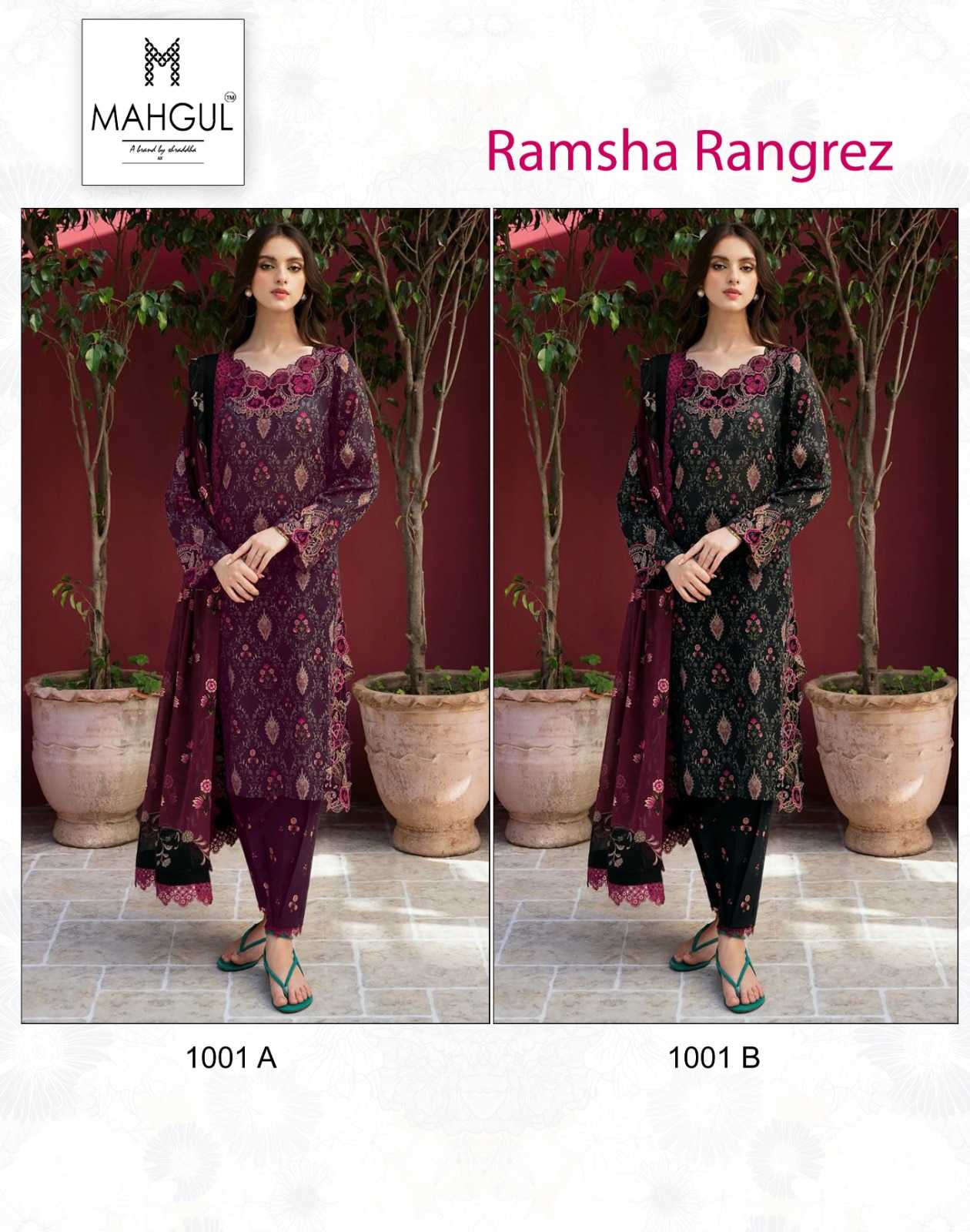 RAMSHA RANGREZ lawn by MAHGULSUITS HIT DESIGN 1001 AB Top -Pure cotton with heavy embroidery (3 patches ) Bot - cotton print / cotton solid Dup - Cotton print SINGLE RATE :- 575/- (CHIFFON DUPPTA) SINGLE RATE :- 625/- (COTTON DUPPTA) Gst extra |