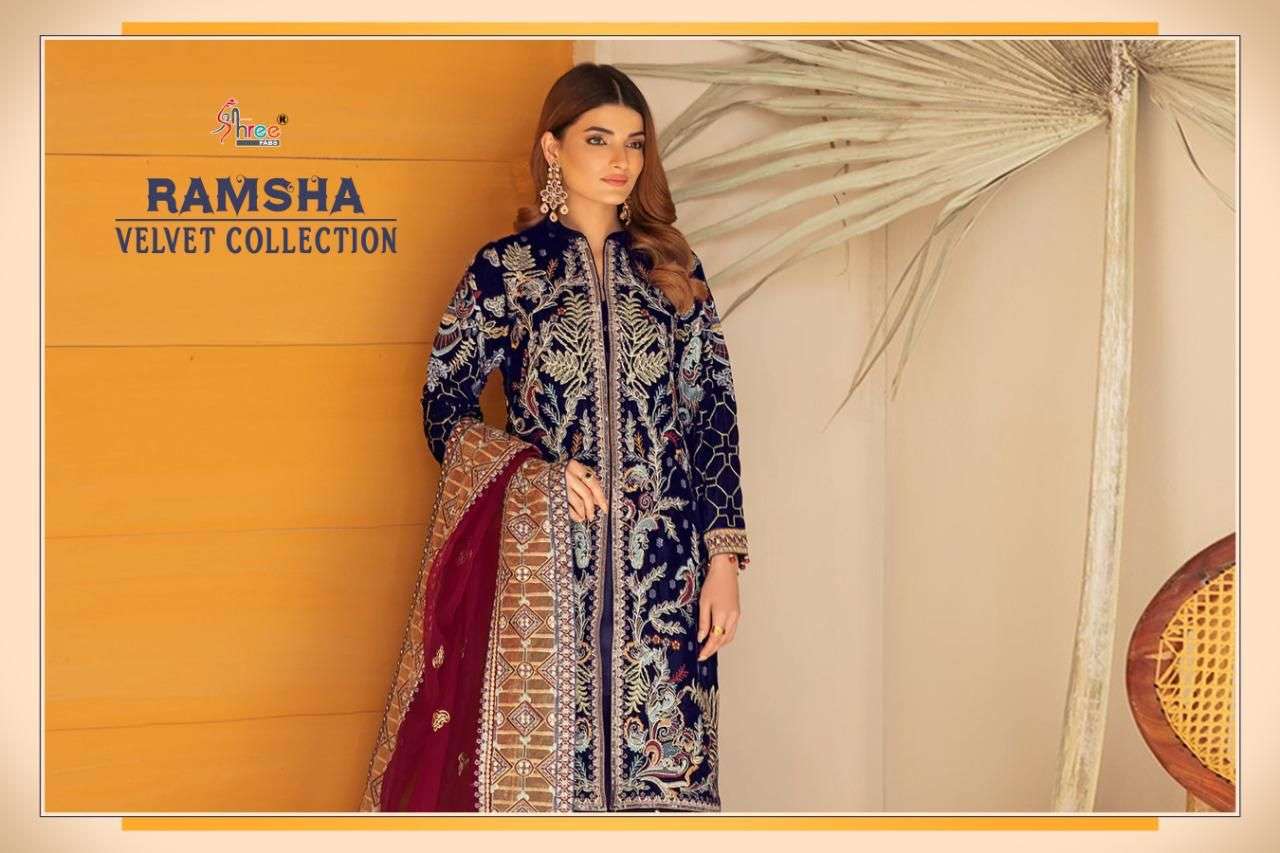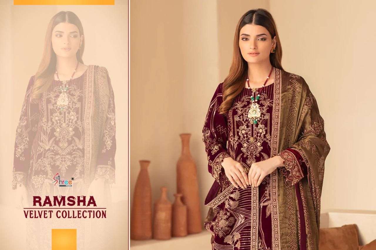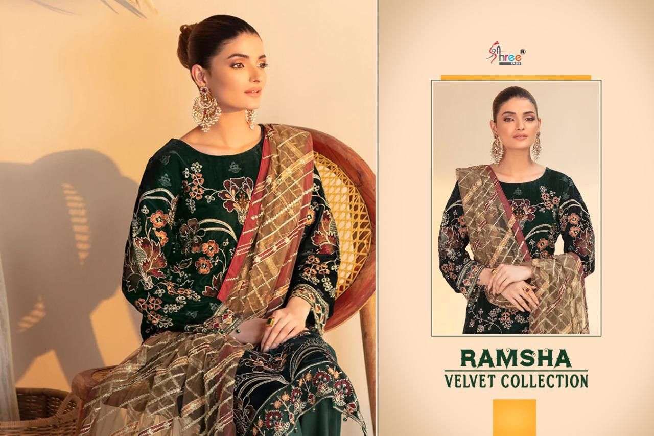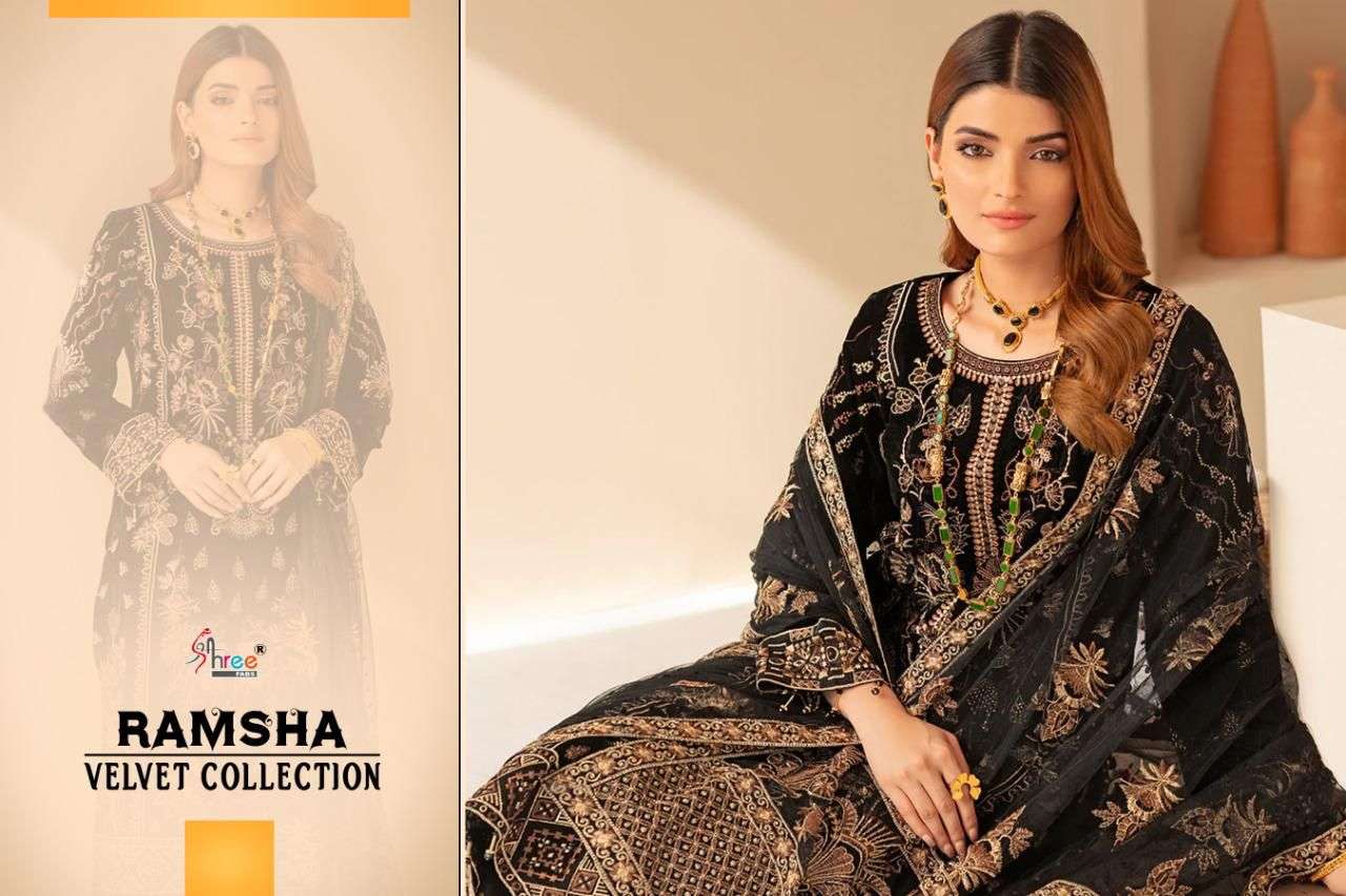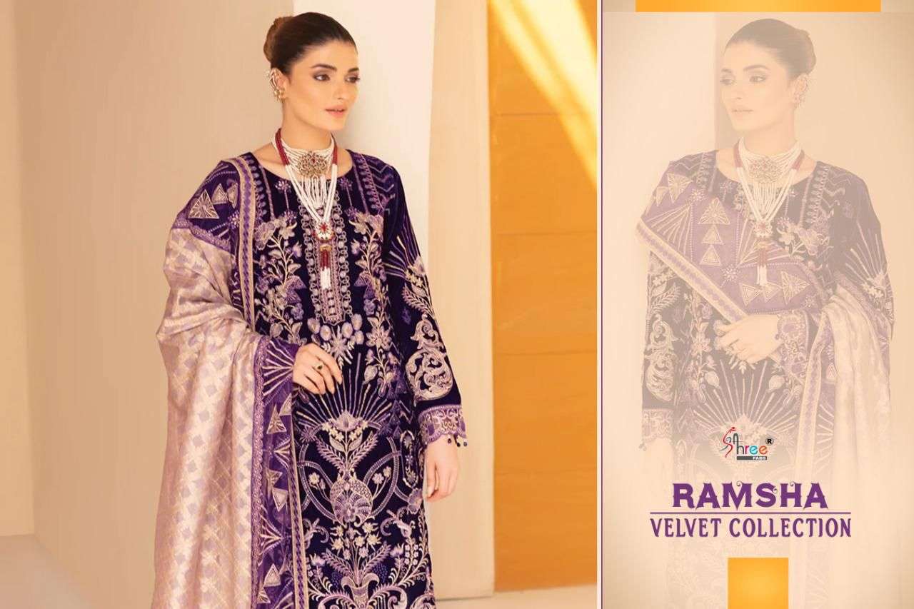 RAMSHA VELVET COLLECTION TOP PURE 9000 VELVAT WITH HEAVY EMBROIDERY BOTTOM PASMINA DUPPTA EMBROIDERED NET DESIGNS 5 RATE 1399+ GST SHREE FABS SURAT®️ |