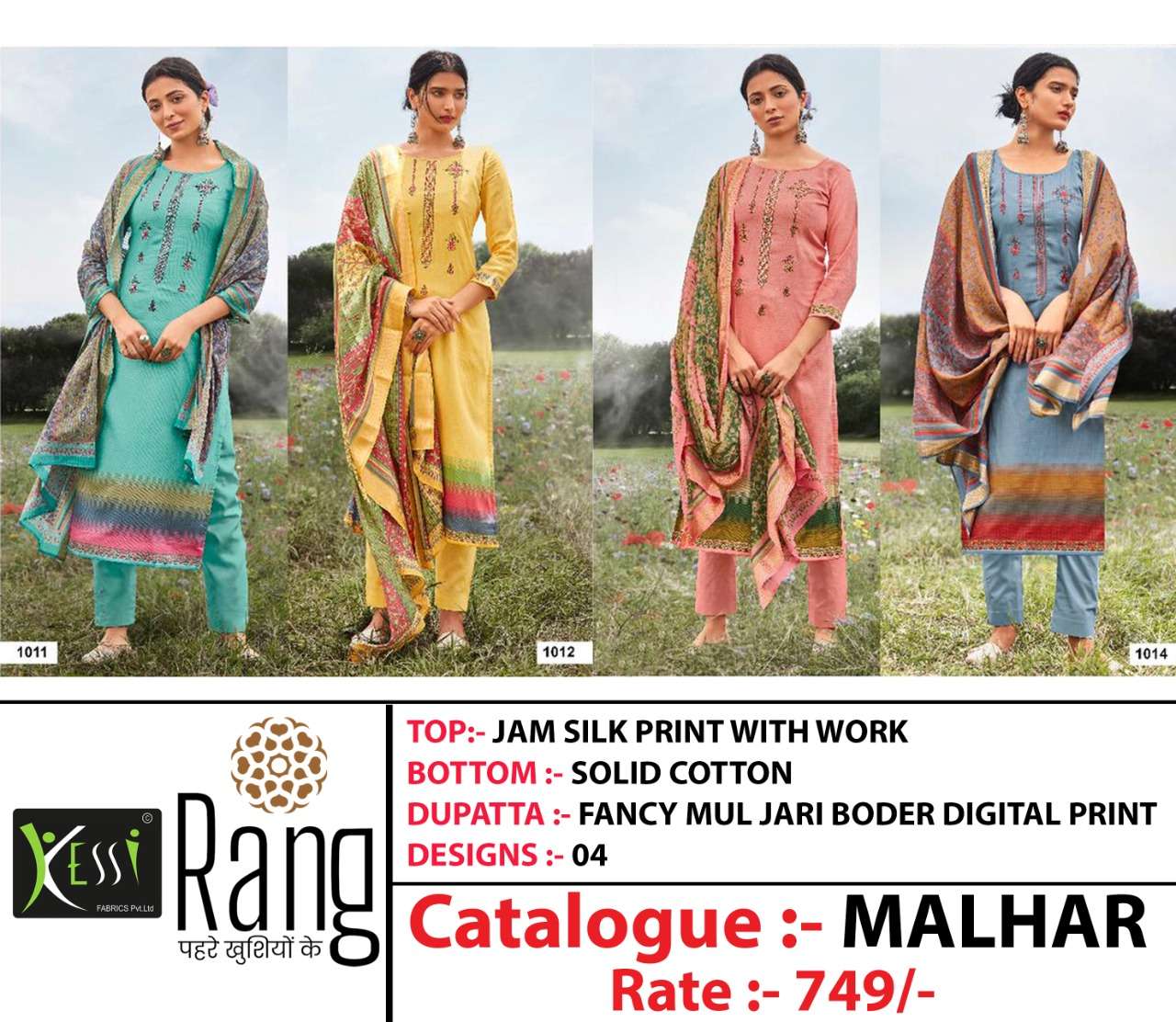RANG (kessi fabrics)  has launched New  Catalog Name:  MALHAR Fabric Details Top:- Jam Silk Print With Work Bottom:- Solid Cottan Dupatta:-Fancy Mul Jari Boder Digital Print Total Design:- 4 Rate -: 749/-  Set to set Dispatching - Today |