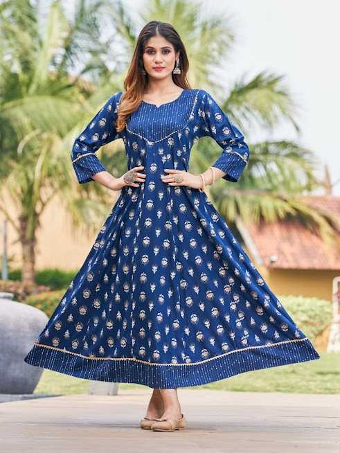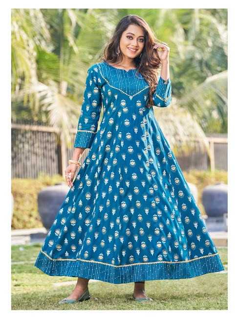 Rangjyot 🎗️ Launching Fancy Anarkali Flair Kurti Catalogue name : ANKITA 🌼 👗 Fabrics - Heavy Finest Quality Of Pure Reyon 14 Kg Gold Foil Print With Lace 🎗️Size - M(19) L(20) XL(21) XXL(22) 3XL(23) 4XL(24) 5XL(25) ☣ Designs - 06 pcs Rate - M TO 3XL - 565/- GST EXTRA |