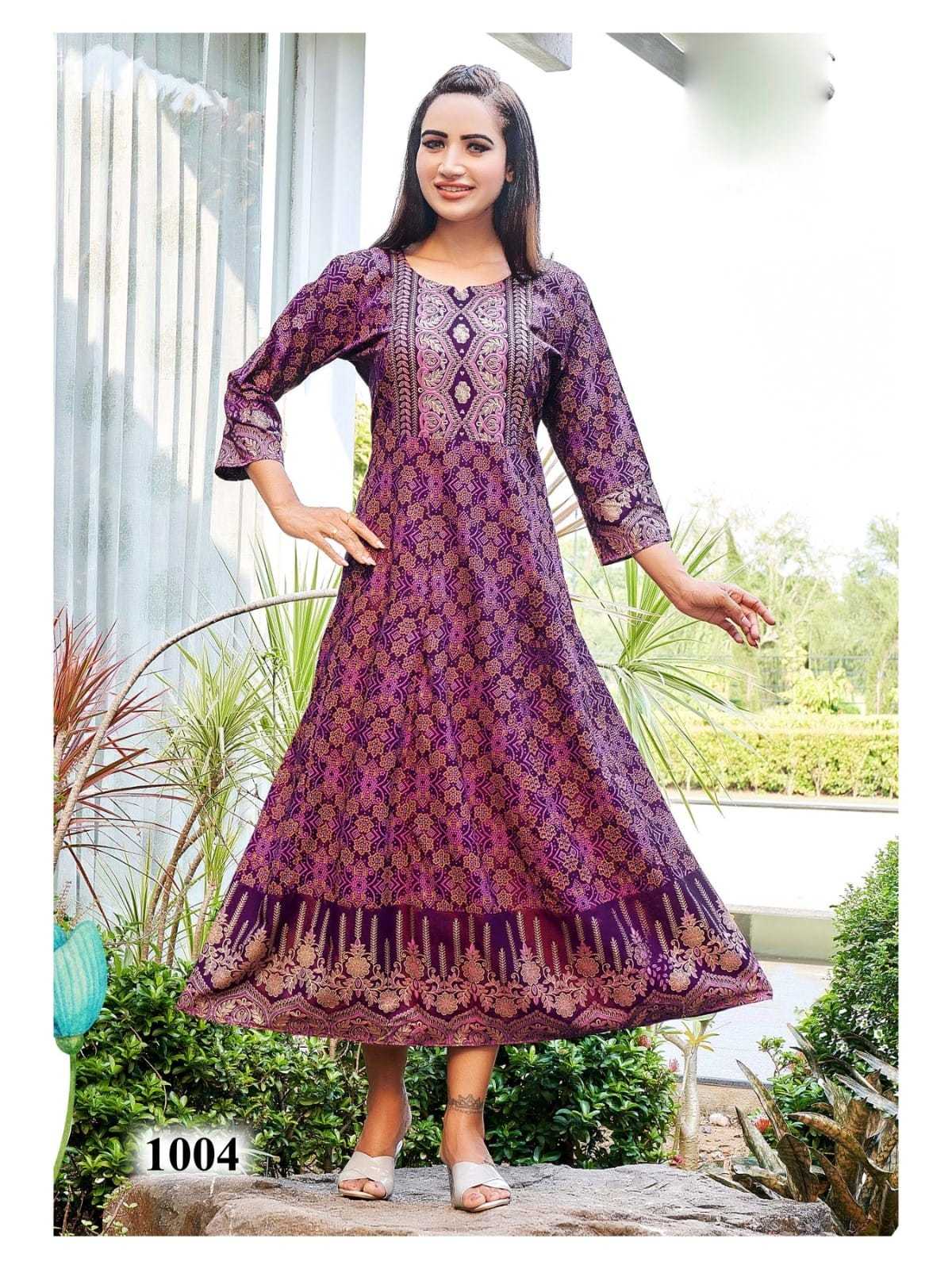rangjyot namrata trending gold print a line kurti in plus sizes