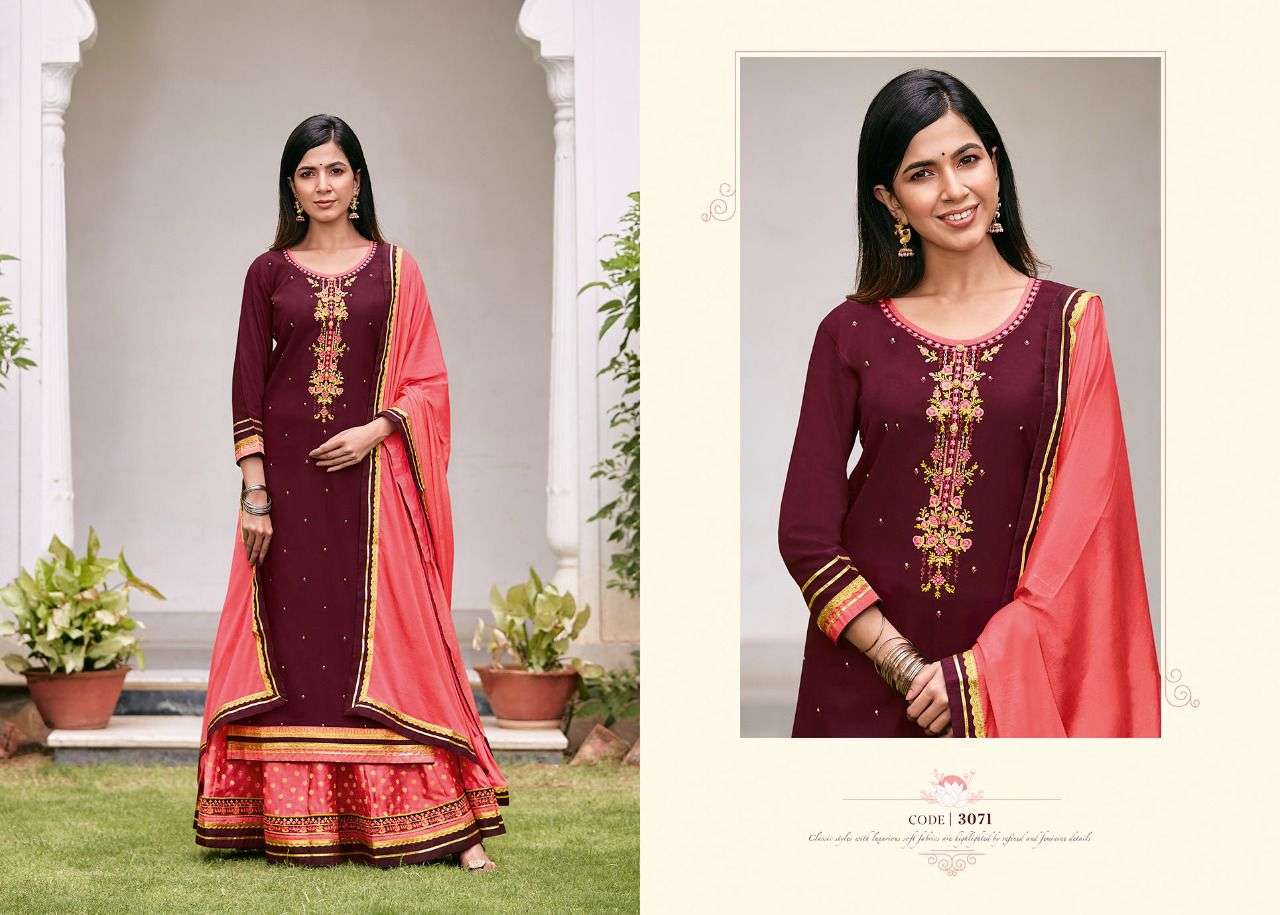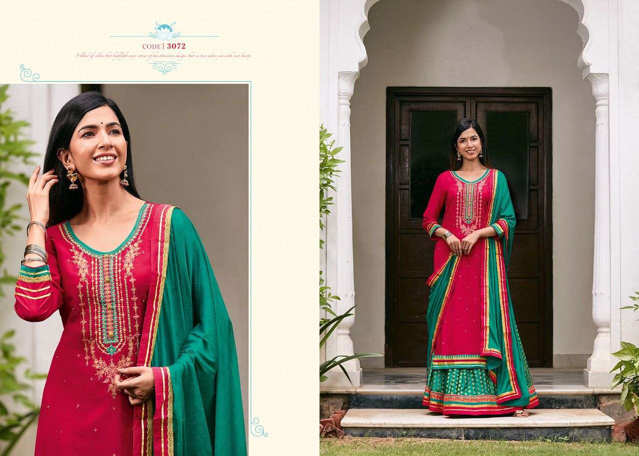 Rangoon ( Kessi Group ) hitting market with exclusively trending series of Catalogs               APSARA VOL - 05 Fabric Details Top:- Heavy Rayon with Embroidery Work. Bottom:- Pure Viscose Jacquard Silk Butti          with Embroidery Lace Work Dupatta:- Chinon with Four Side Border Total Design:- 06 Size:- M, L, XL, XXL, 3XL Rate,  1199/- Set to set Dispatching 5 to 6 days later |
