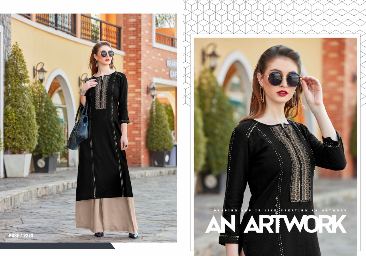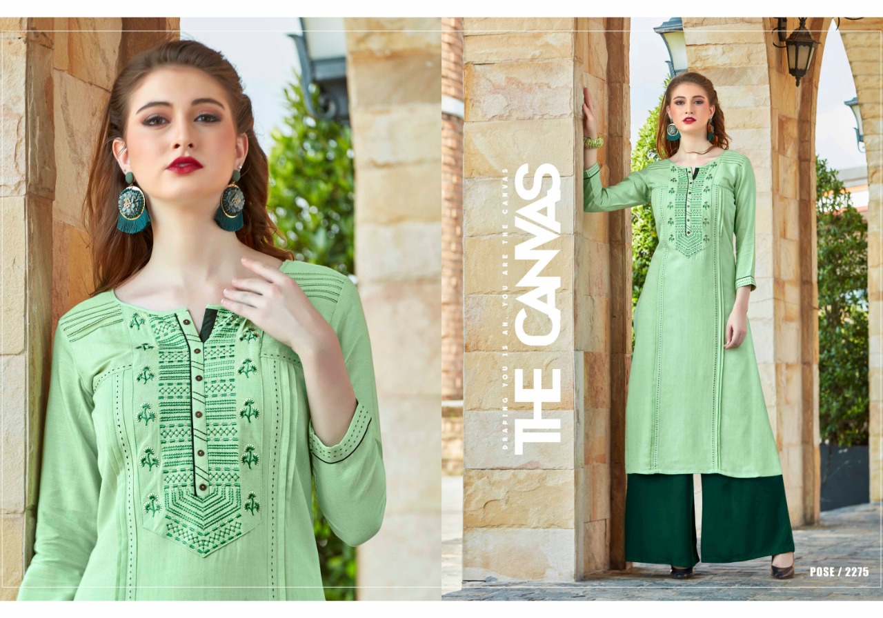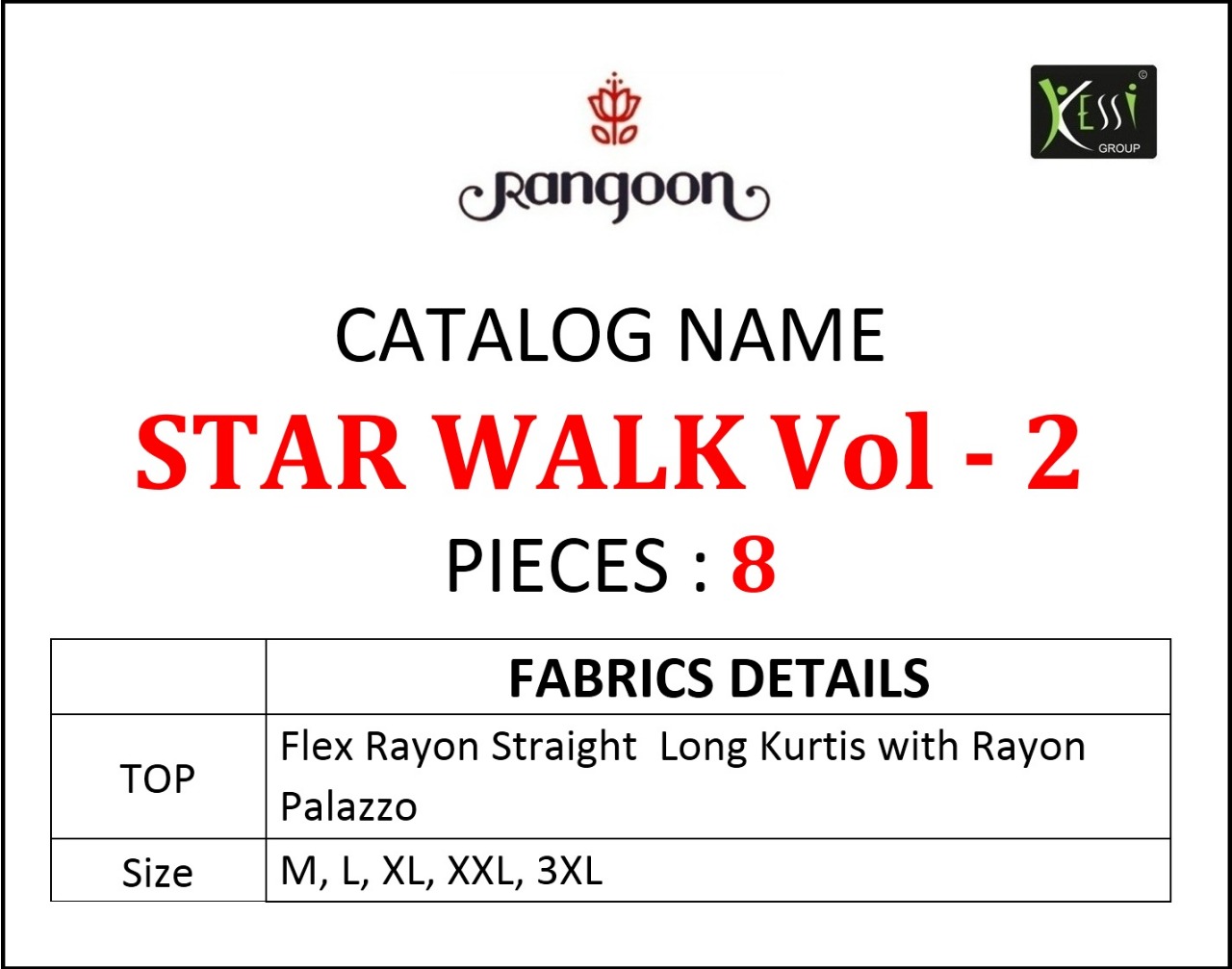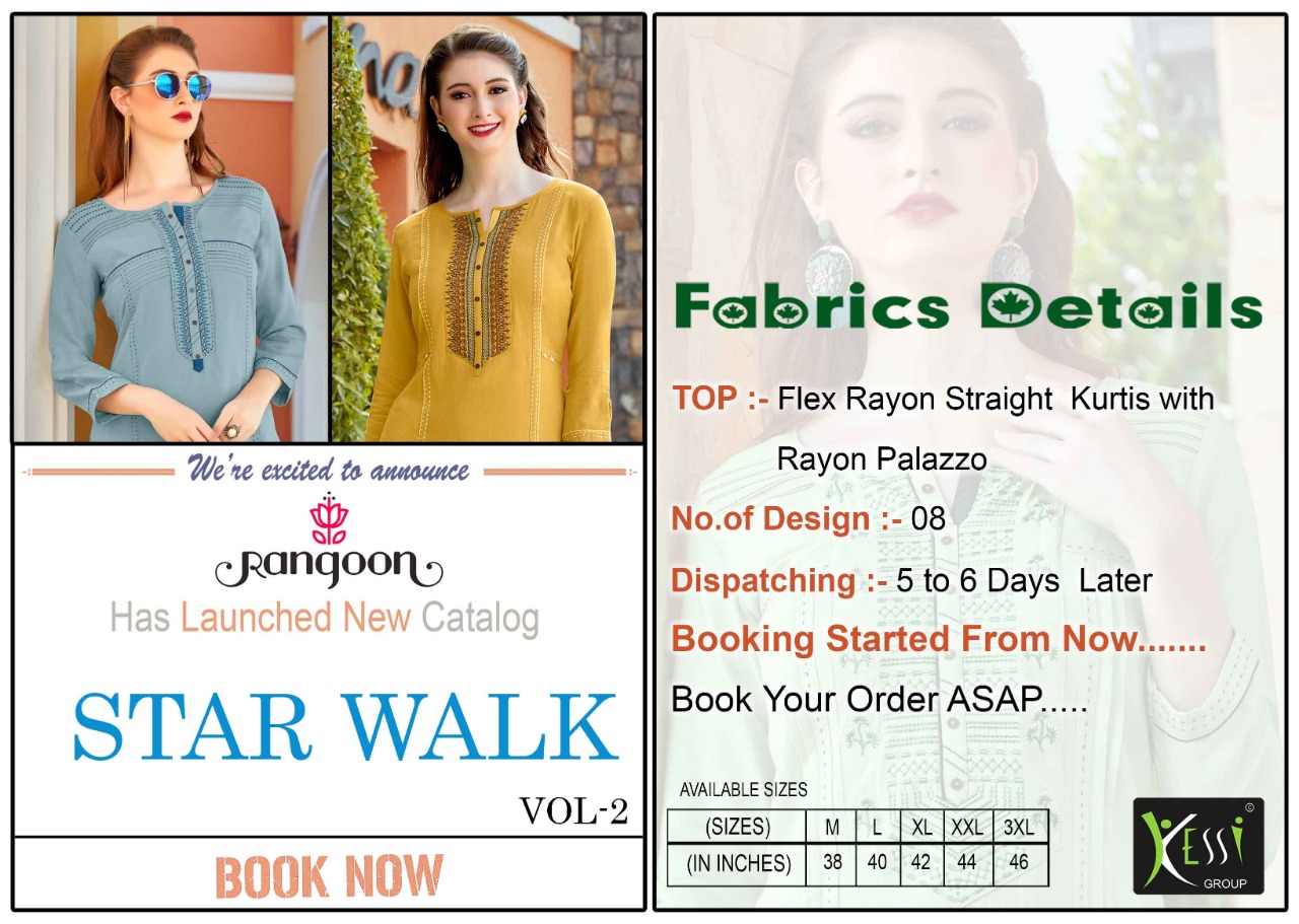 Rangoon (Kessi Fabrics Pvt. Ltd.) has launched Catalog name : Star Walk Vol - 2 Fabric Details âªTop:- Flex Rayon Straight Long Kurtis with Rayon Plazzo âªTotal Design:- 8 âªSize;- M, L, XL, XXL, 3XL â°Dispatching 5 to 6 days later Booking started from now. Rate 699 |