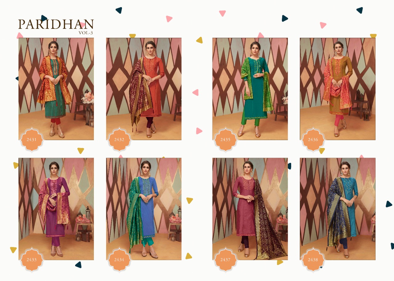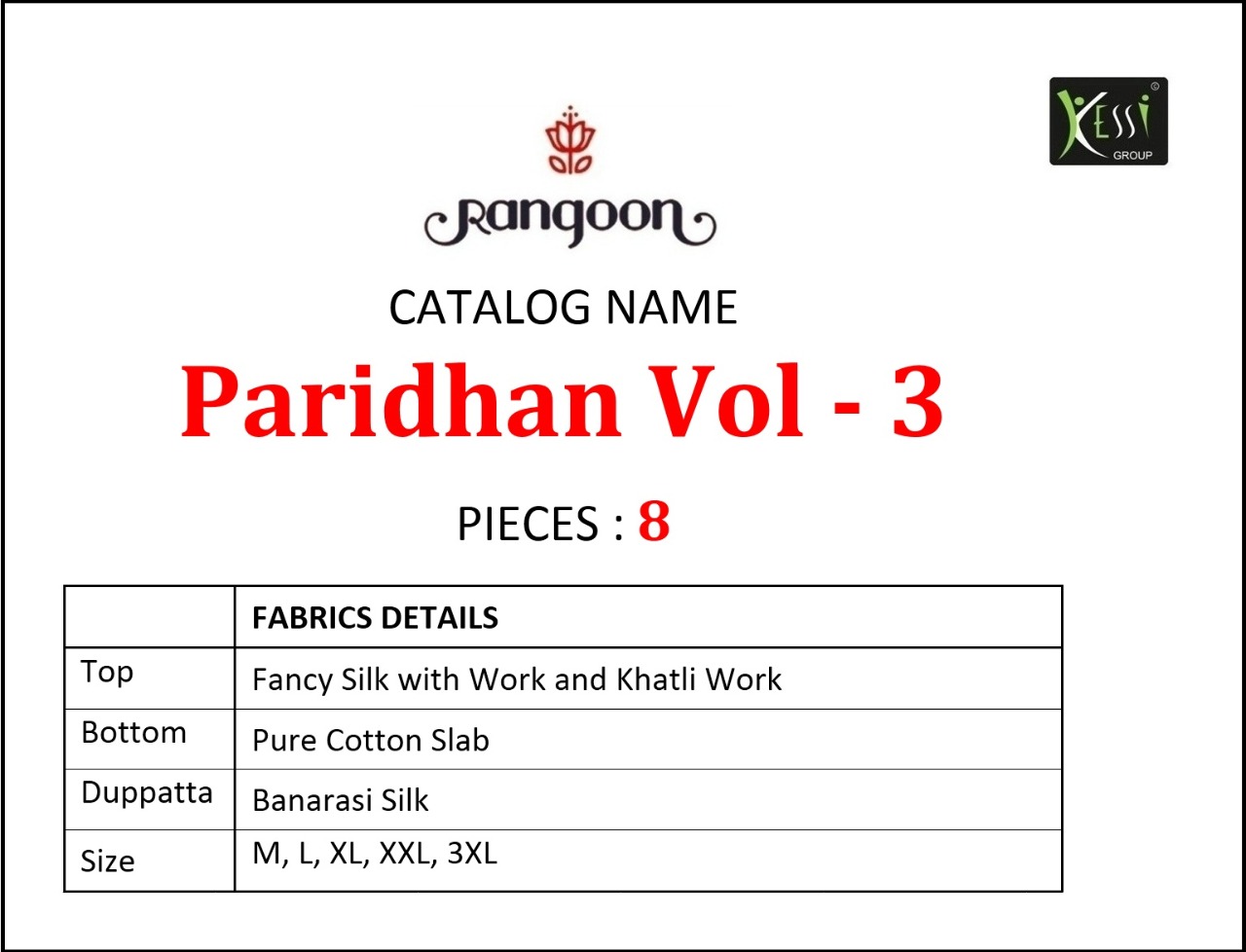 Rangoon (Kessi Fabrics Pvt. Ltd.) has launched Catalog name: Paridhan Vol - 3 Fabric Details ▪Top:- Fancy Silk with Work and Khatli Work ▪Bottom:- Pure Cotton Slab ▪Dupatta:- Banarasi Silk ▪Total Design:- 8 ▪Size;- M, L, XL, XXL, 3XL Rate 1099/- |