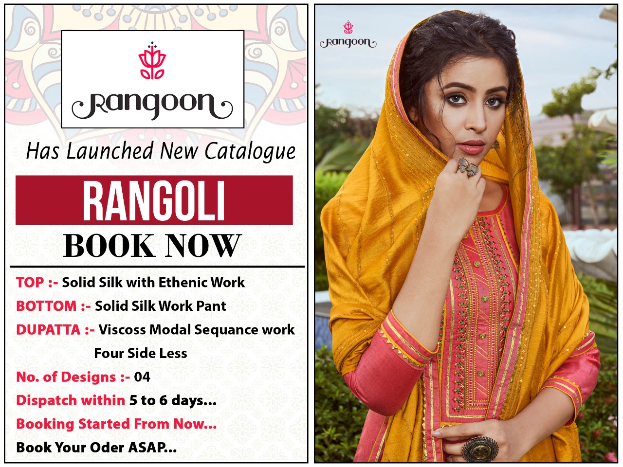Catalog Name: Rangoli 🔸 Fabric Details 🔸 ▪Top:- Solid Silk with Ethnic Work ▪Bottom:- Solid Silk Work Pant ▪Dupatta:- Viscos Modal Sequence work Four Side Less ▪Total Design:- 4 ▪Size:- M-38, L-40, XL-42, XXL-44, 3XL-46 Rate, 1099/- Set to set ⏰Dispatching 5 to 6 days later |