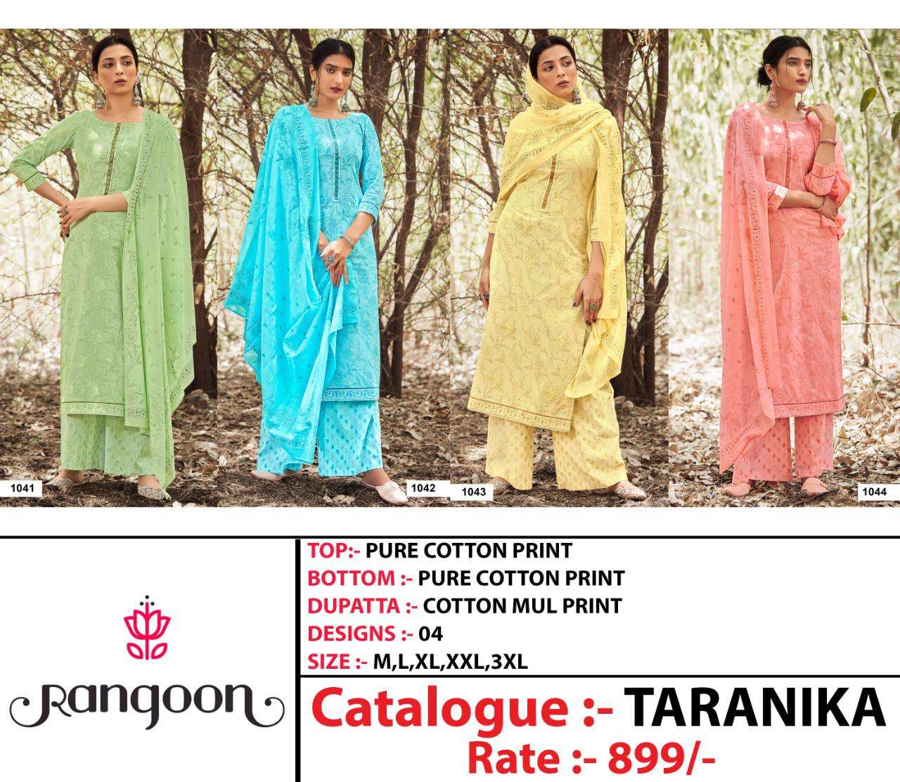 Rangoon ( Kessi Group ) hitting market with exclusively trending series of Catalogs              TARANIKA             Fabric details Top:- Pure Cotton Print Bottom:- Pure Cotton Print Dupatta:- Cotton Mal Print No. of Design:- 4 Price : 949/-+ *GST Set to set |