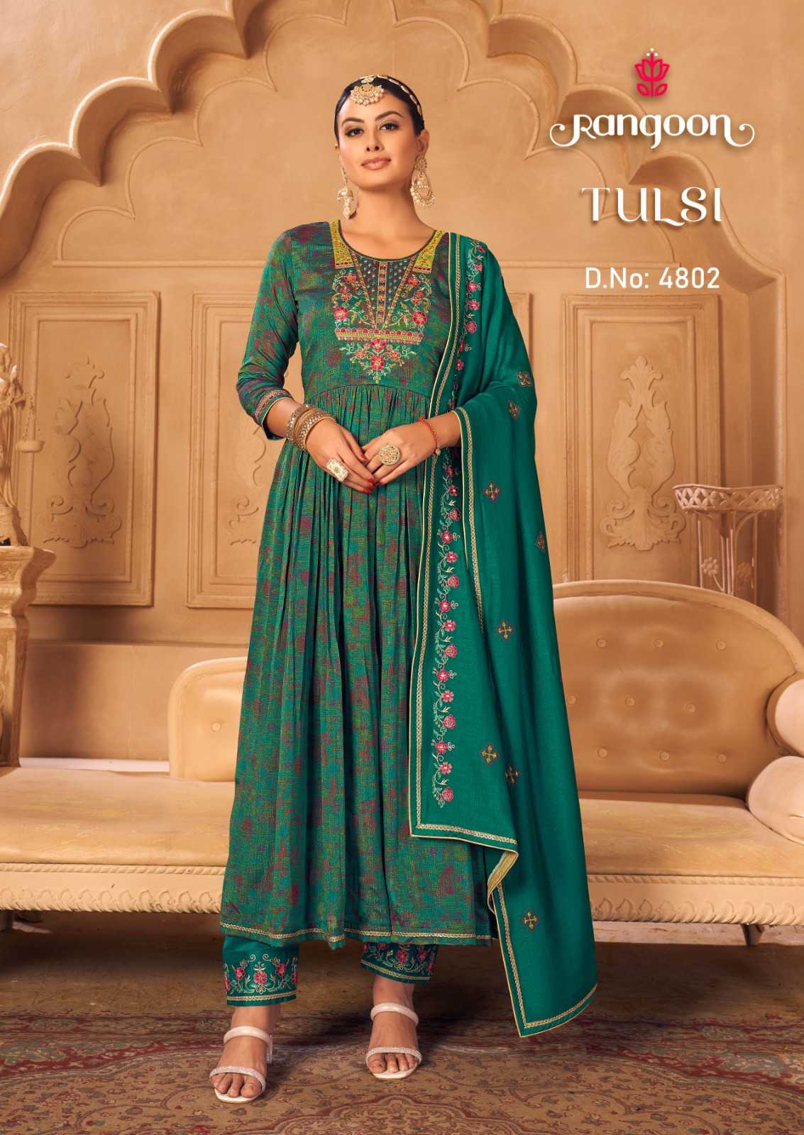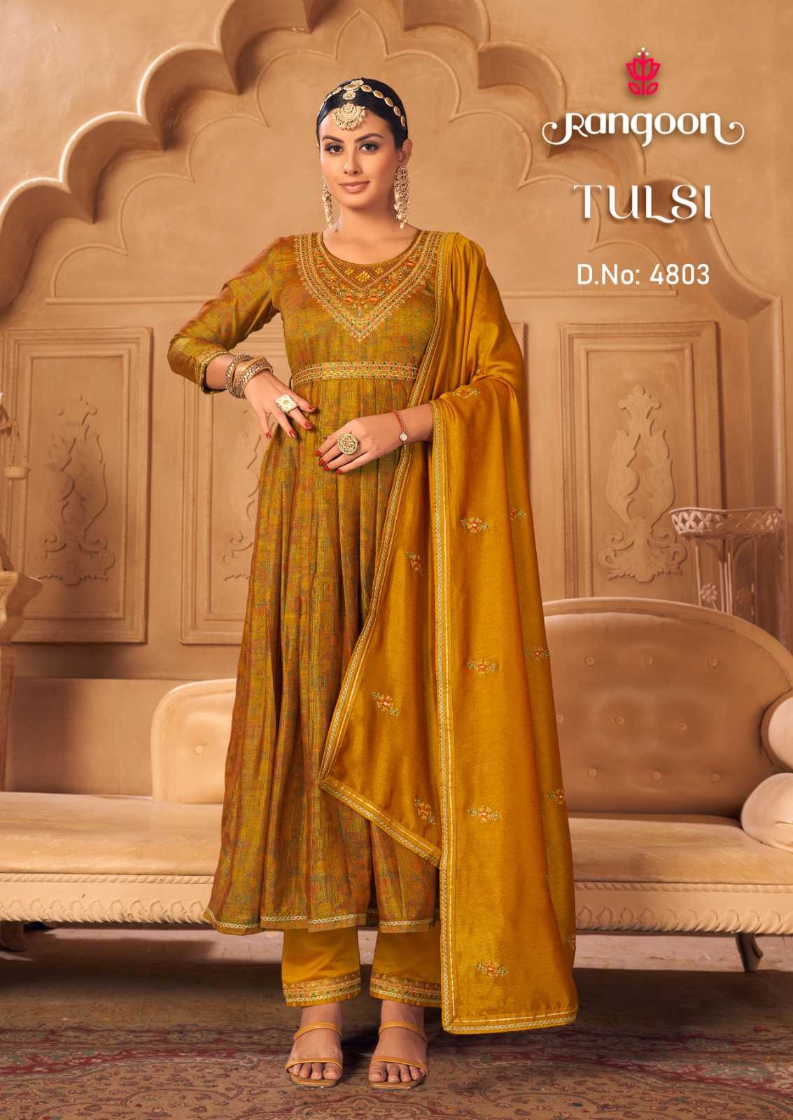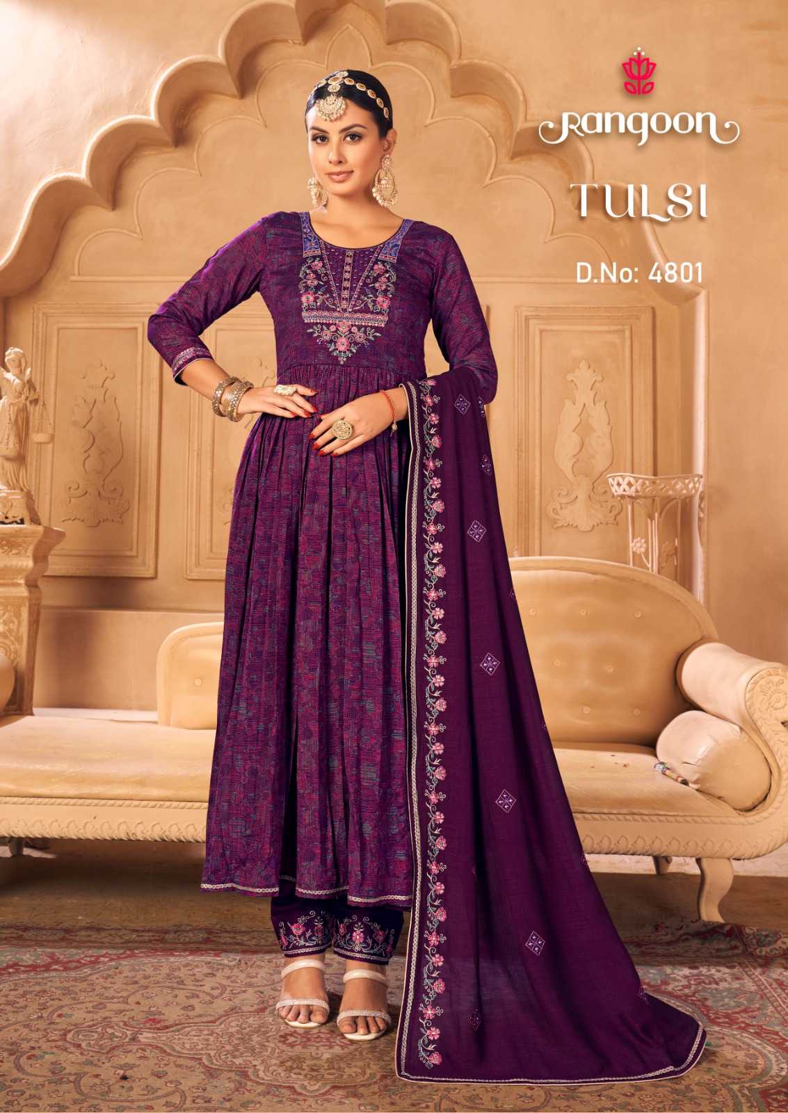 rangoon tulsi 4801-4804 elegant traditional occasion wear flair kurti pant dupatta readymade set