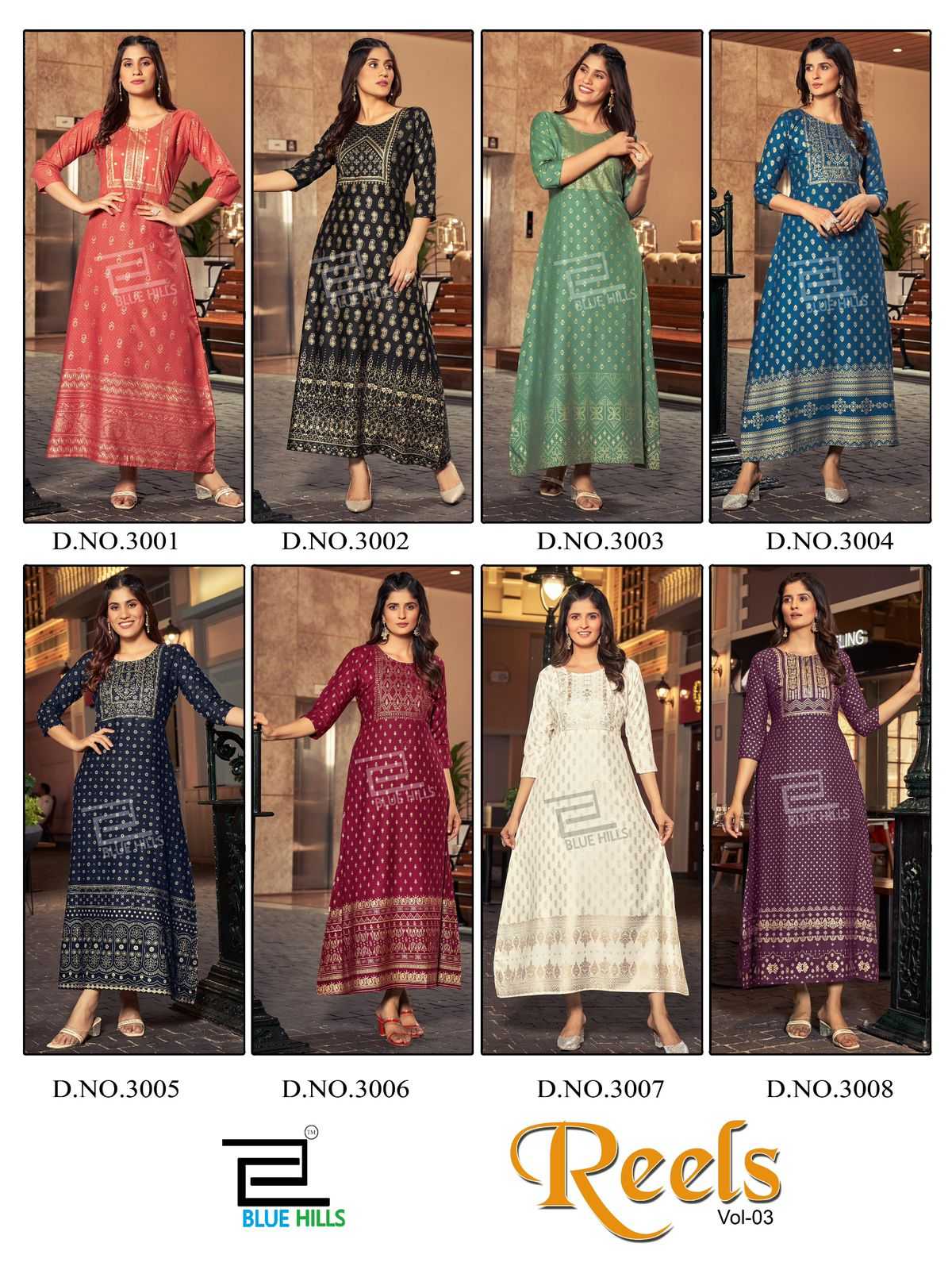 reels vol 3 by blue hills stylish full stitch rayon long kurti collection