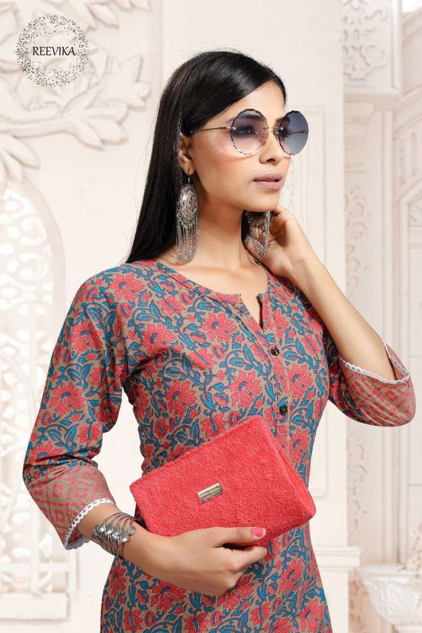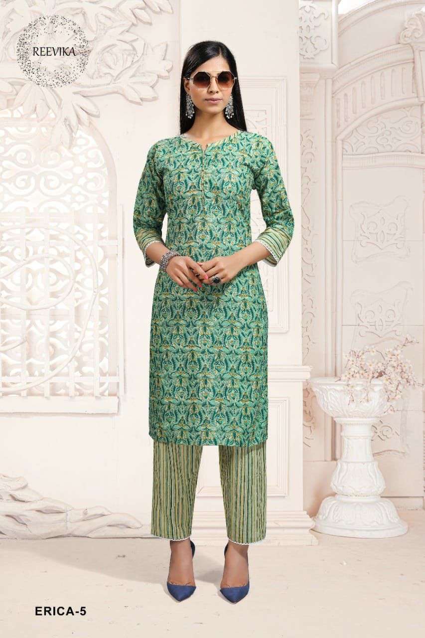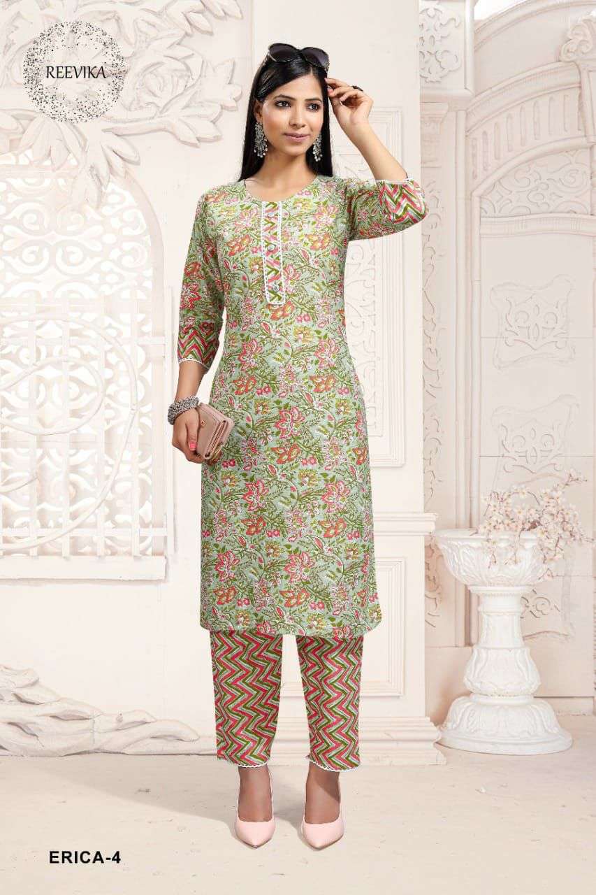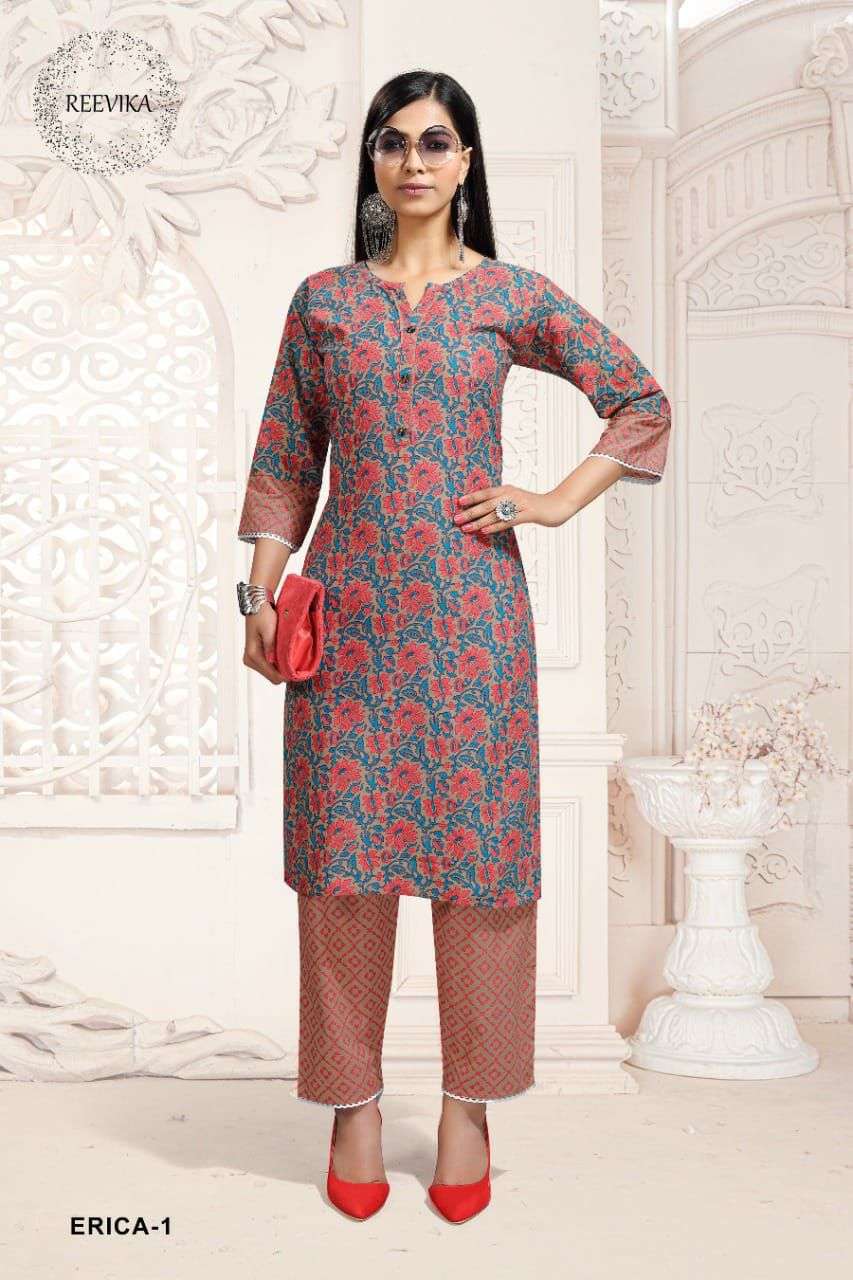 reevika erica cotton print kurti with pant set