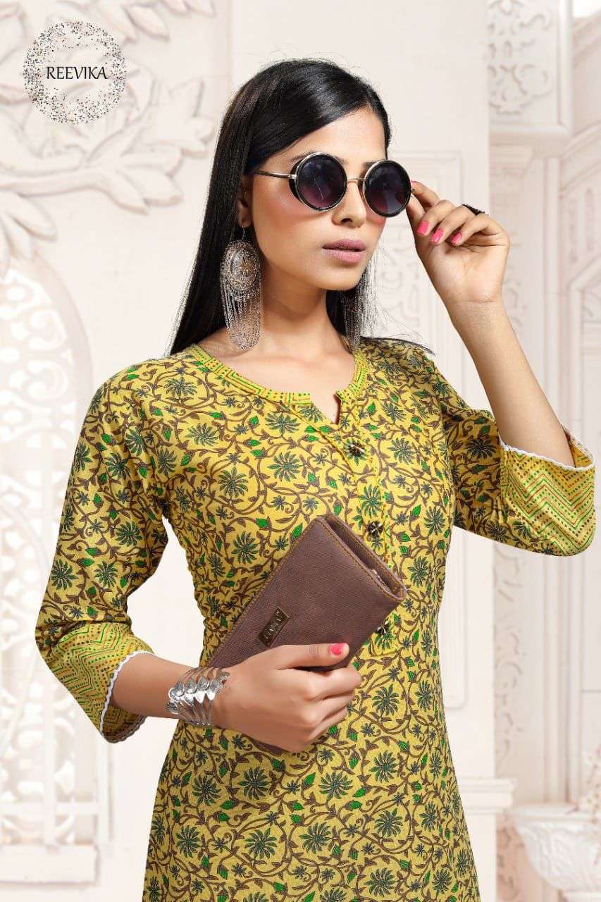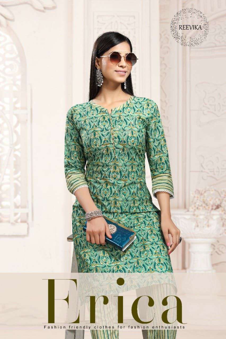 Reevika Presents Catalog name :- "Erica" Catalogue, it's Kurti with Pant Made of Jaipuri Print Cotton Fabric with lace Detailing..... Brand: Reevika Catalog: Erica Type: Kurti + Pant Fabric : Cotton Print Designs: 6 Size :- L XL XXL Rate: Rs.450/- + Gst Dispatch: 3 to 4 Days |