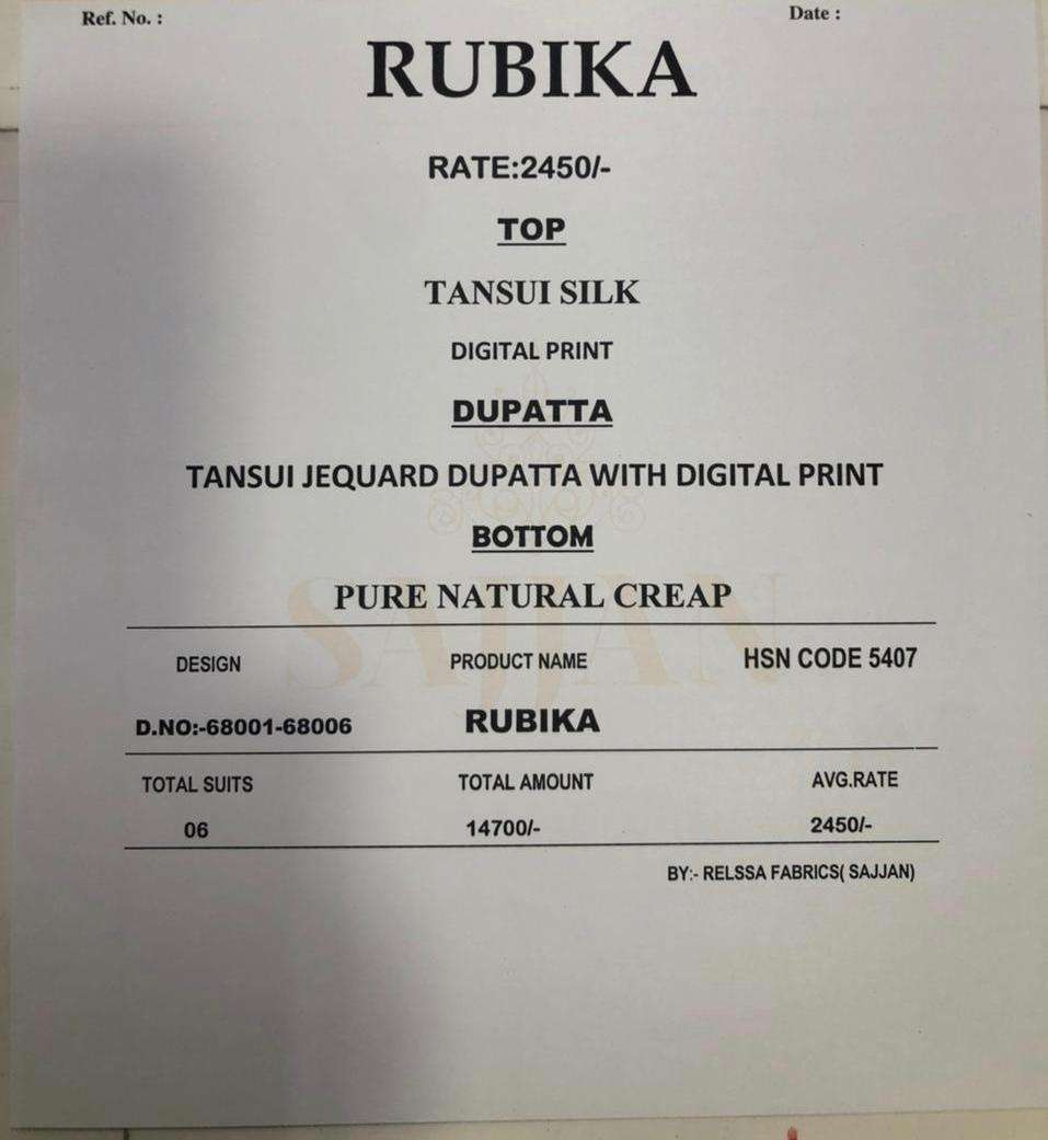 Relssa Fabrics Presents Latest Collection Launched on 13-02-2021. Presenting Beautiful collection of 6 PCS with Unstitched .
