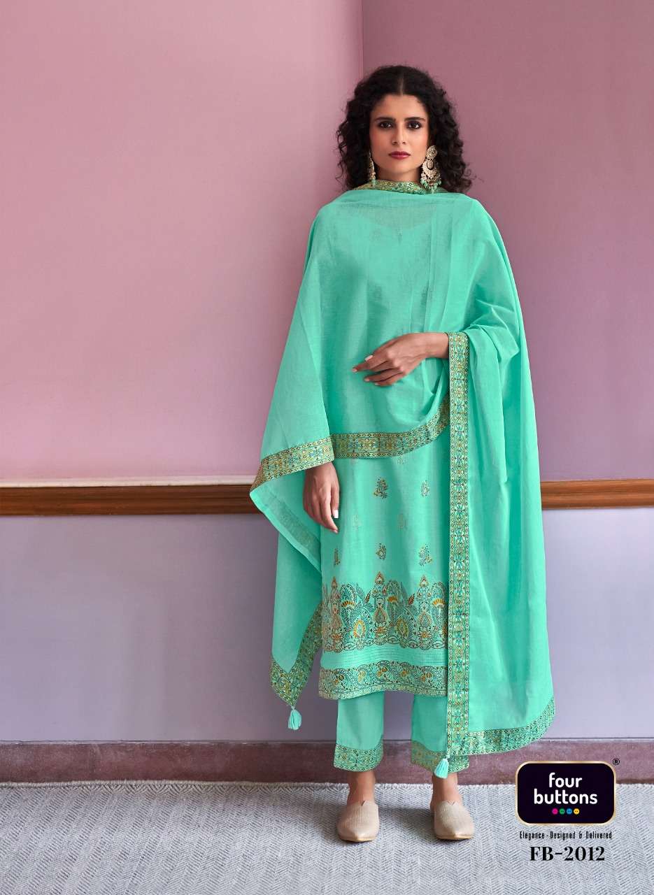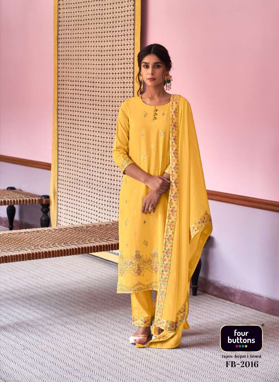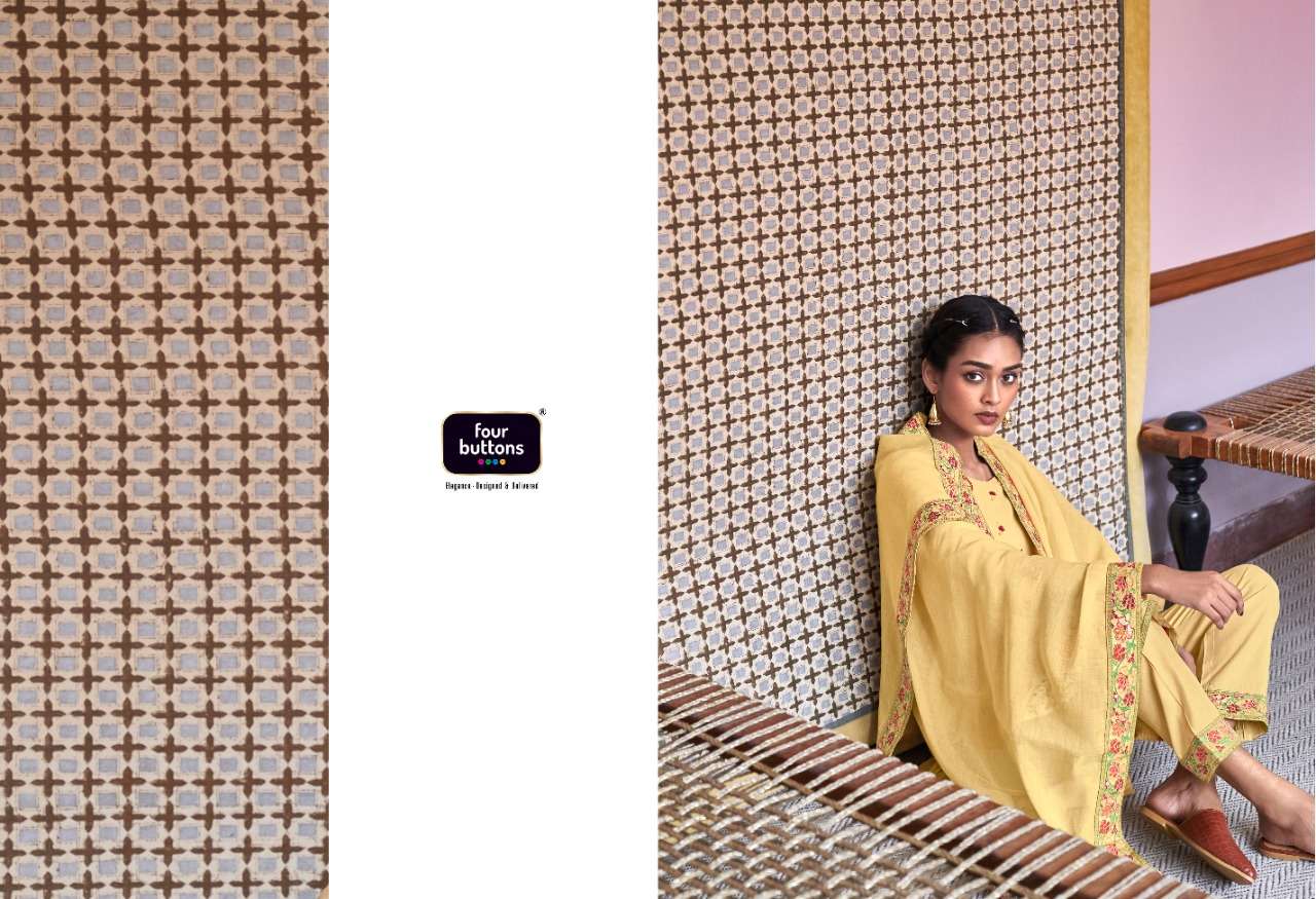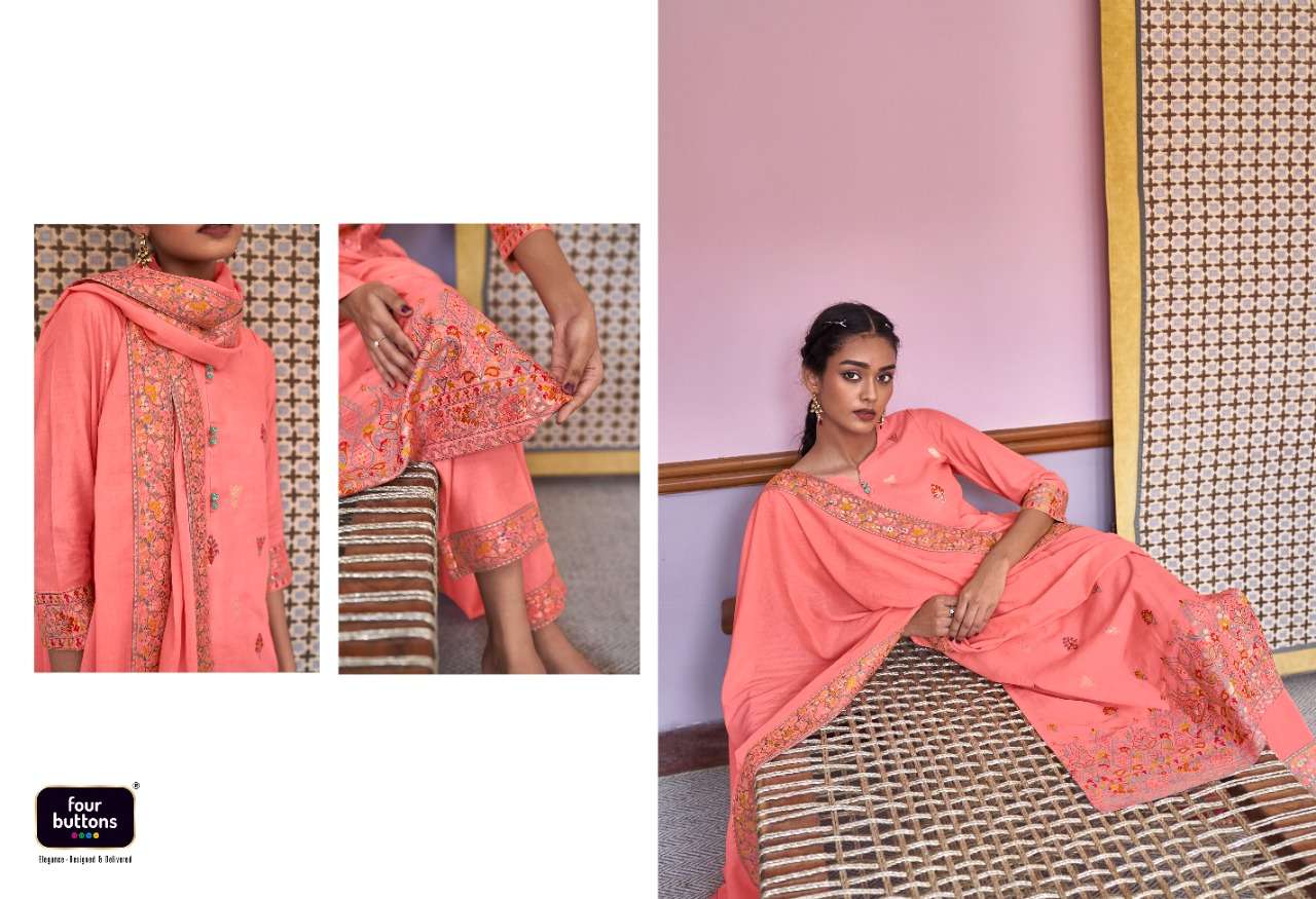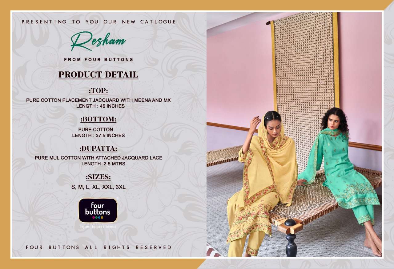FOUR BUTTONS proudly launches its NEW collection 2022 "RESHAM" FABRIC KURTI - PURE COTTON PLACEMENT JACQUARD WITH MEENA AND MX BOTTOM - PURE COTTON DUPATTA- PURE MUL COTTON WITH ATTACHED JACQUARD LACE RATE- Rs. 1499/- SIZES - S, M, L, XL, XXL, 3XL |