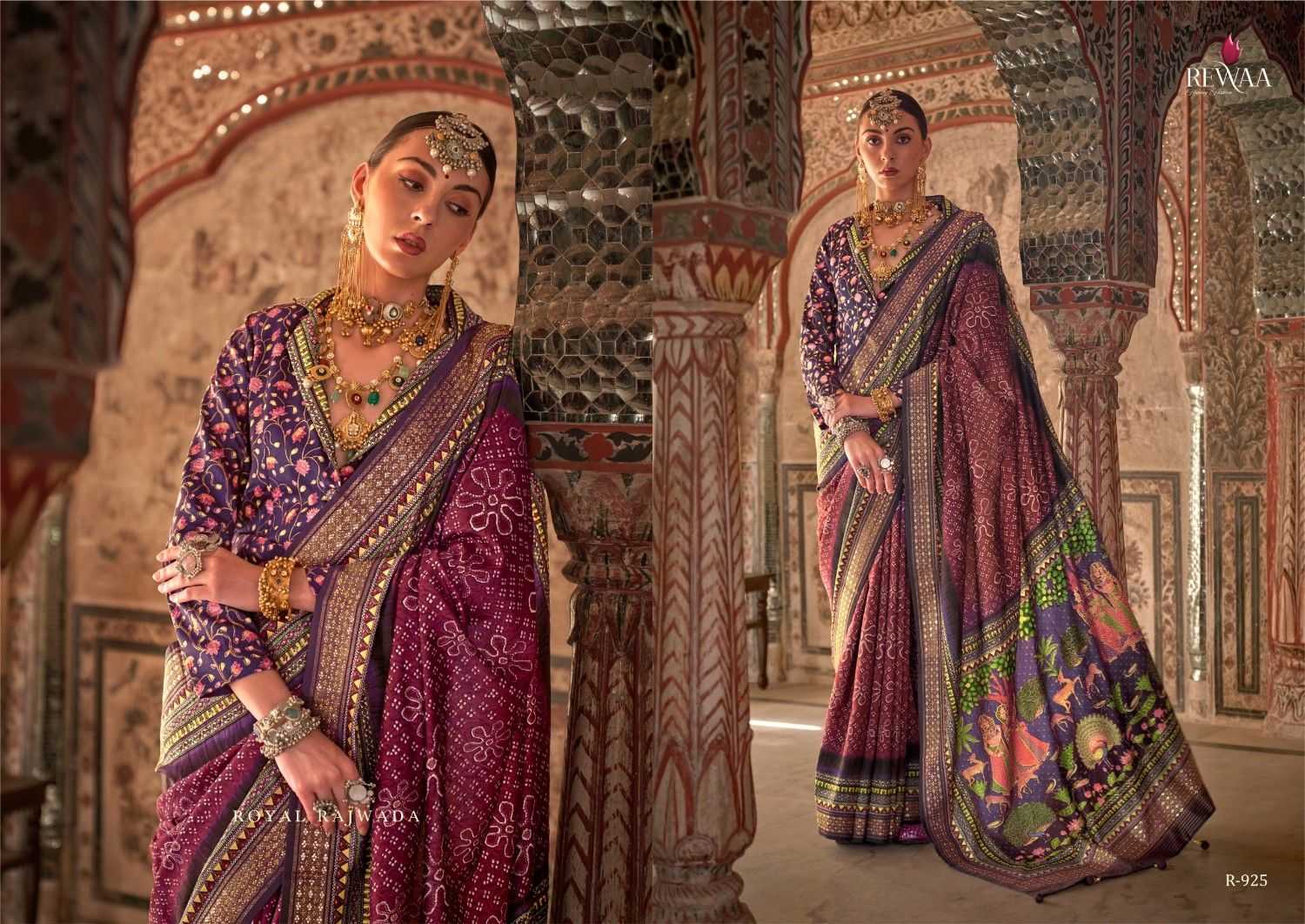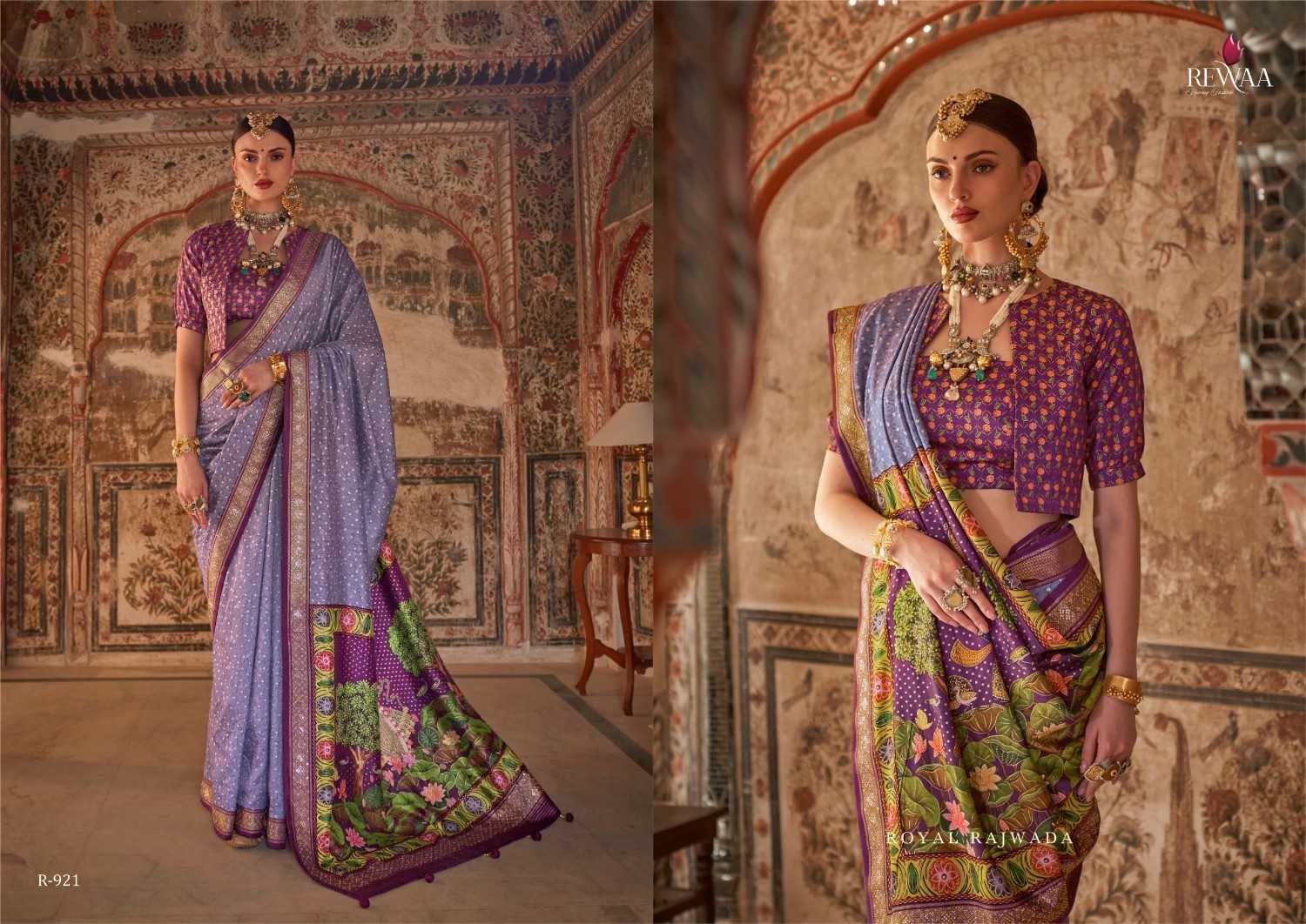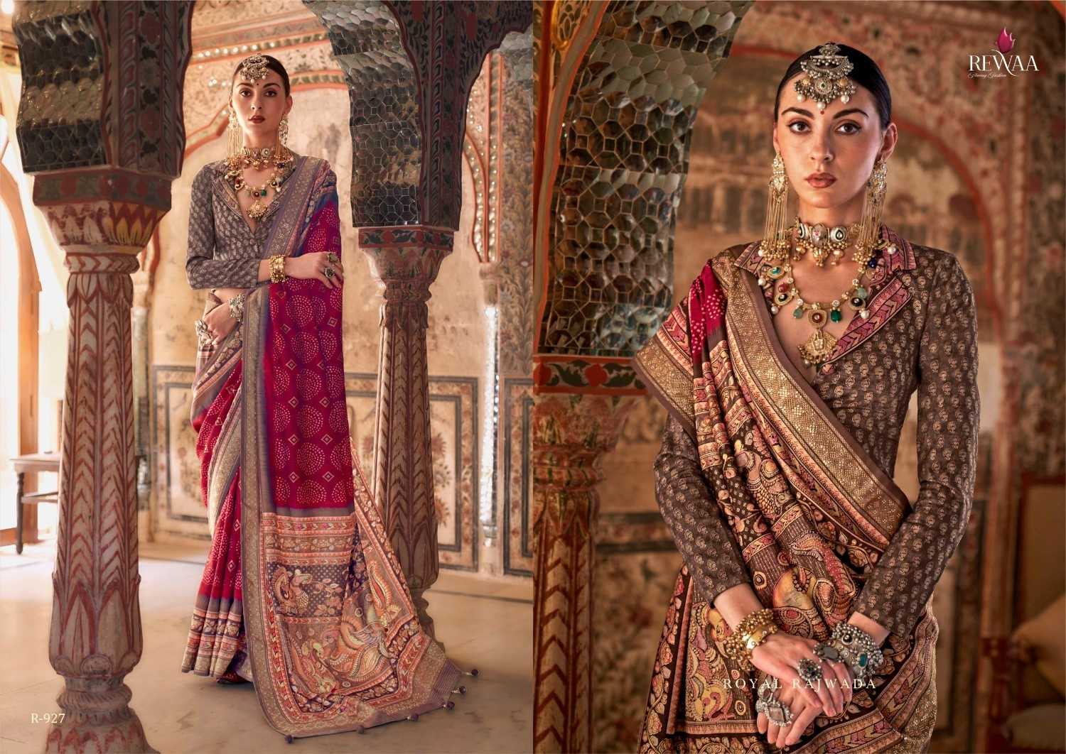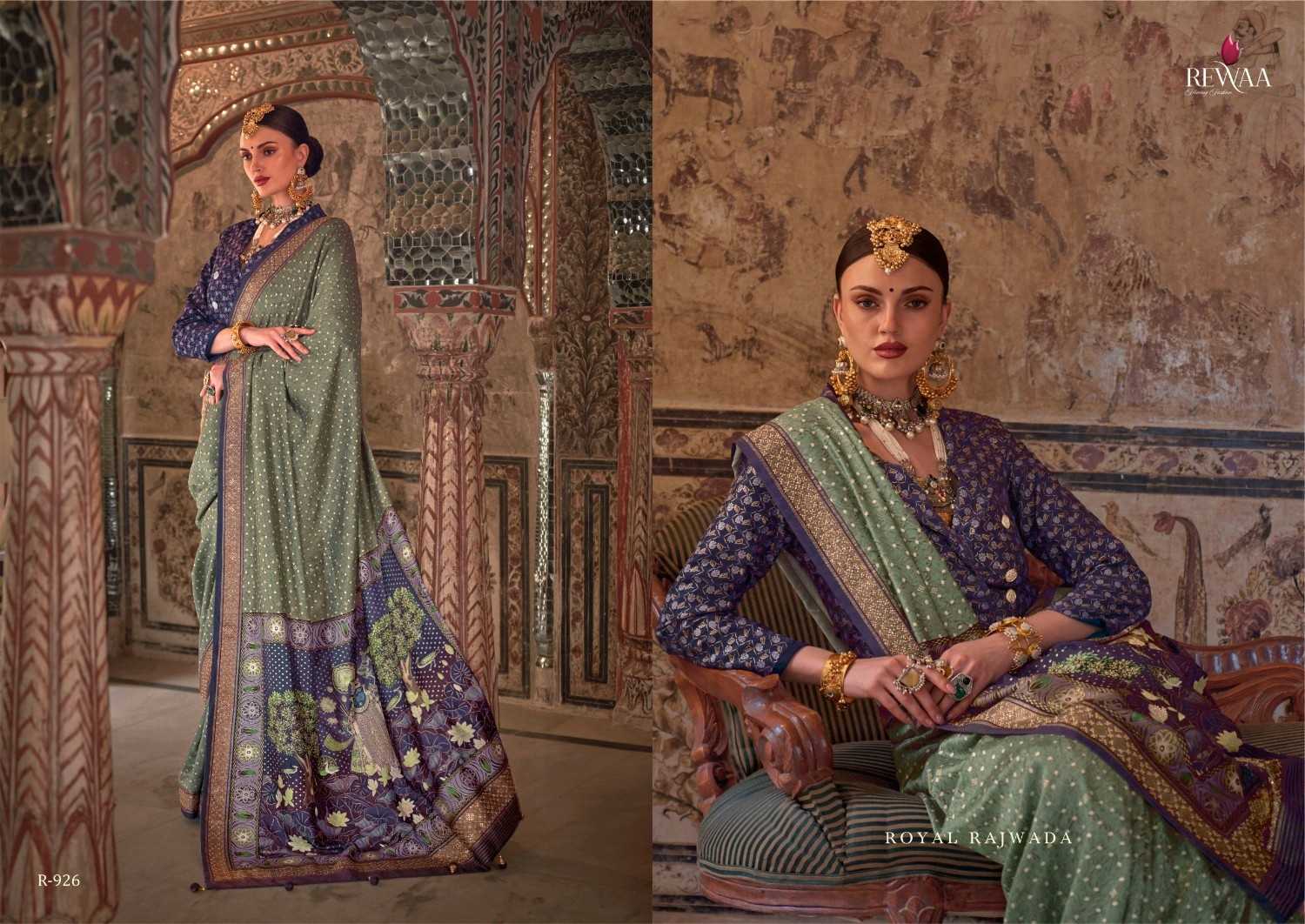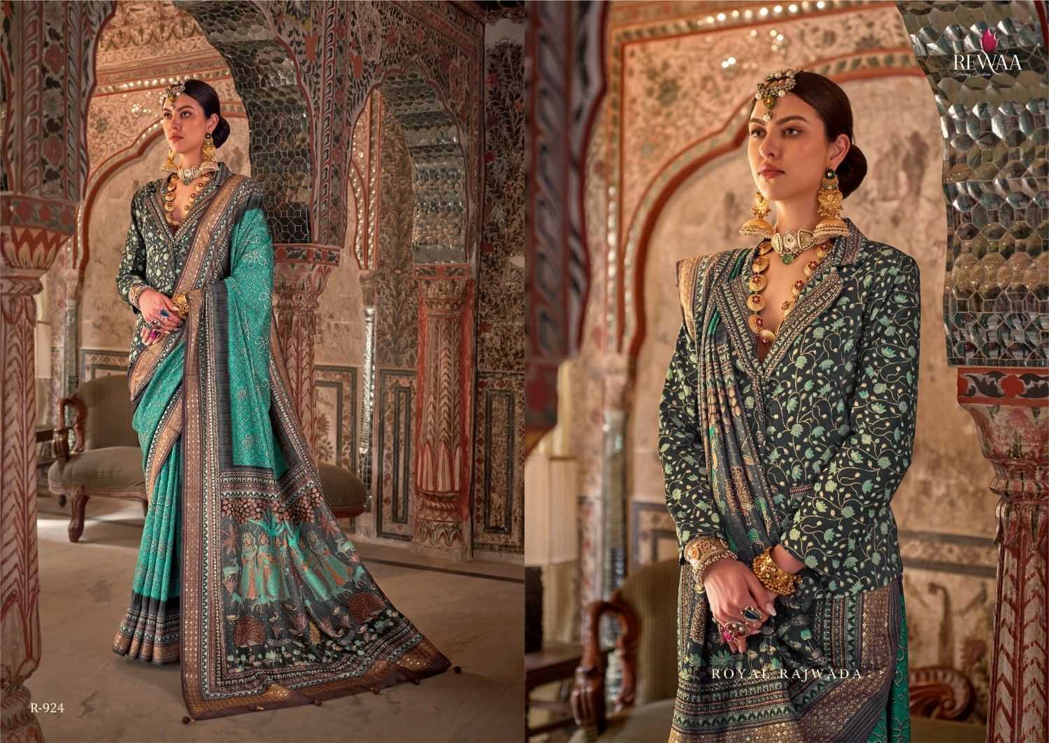Make a regal statement with this breathtaking Royal Rajwadi Dew Drop Work Saree This majestic attire is adorned with intricate dew drop work, Its unique blend of traditional craftsmanship and modern elegance makes it a must-have for appreciates the beauty of royal heritage. 🇮🇳SANJANA DESIGNWEAR Brand : Rewaa Catalog: Padmavat vol -3 Series : 921 To 929 Saree : Poly Viscose Silk With Rajwadi Print & Dew Drop Work With Aqua Finish Blouse: : Poly Viscose Silk Price : 2495/-+5%GST |
