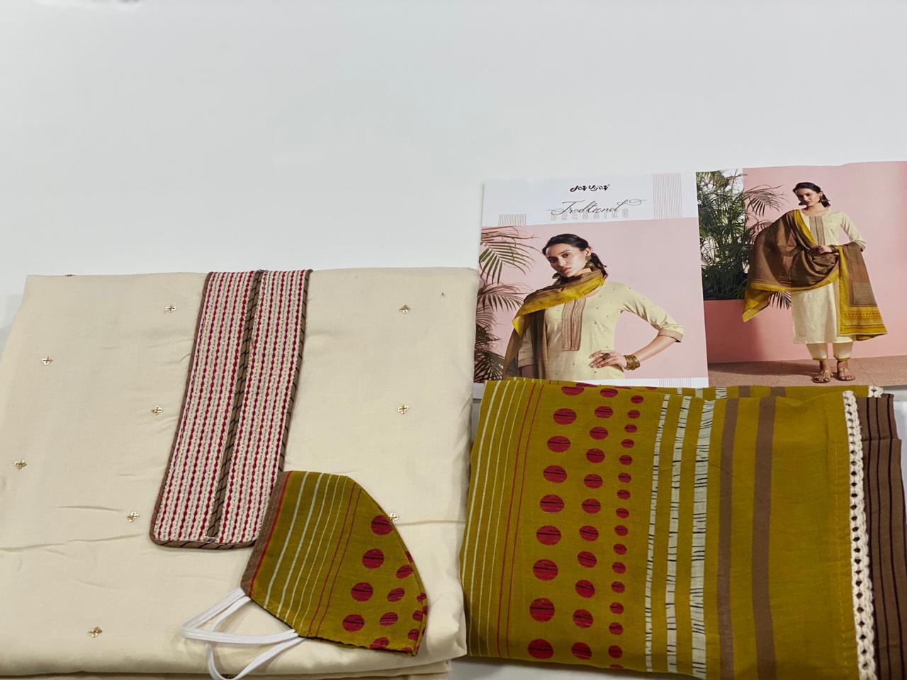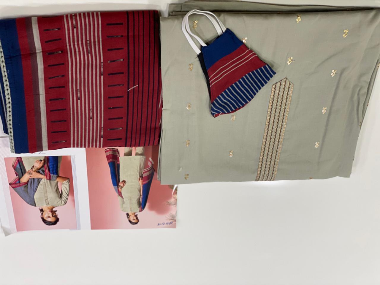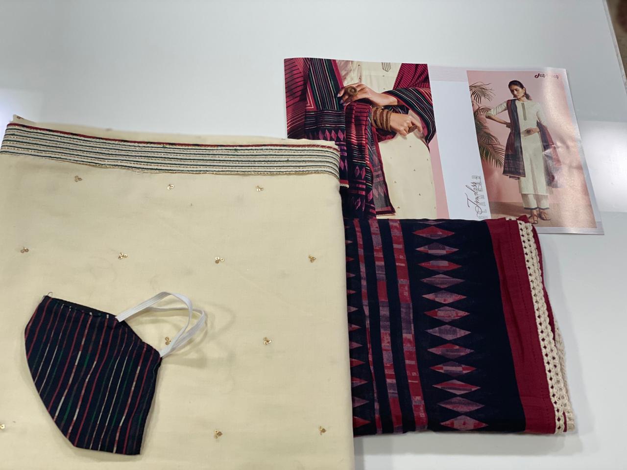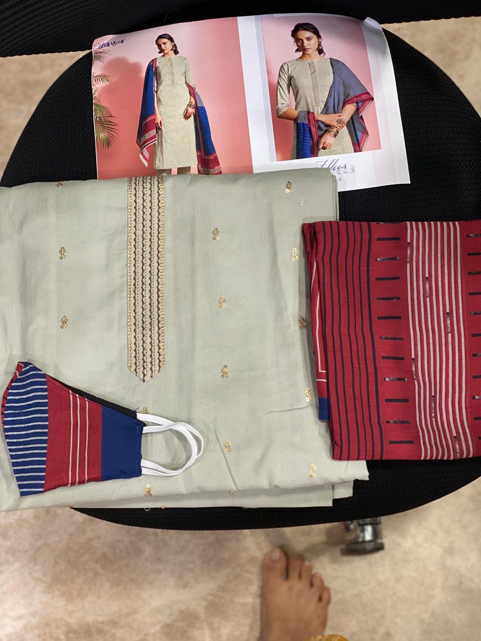 REYNA-a GANGA product Presents its latest catalogue PANACHE Top- cotton cambric print with embroidered neck. Bottom- cotton cambric print. Dupatta- solid bemberg chiffon with 4 side printed border RATE - ASK 5% GST Only set to set. |