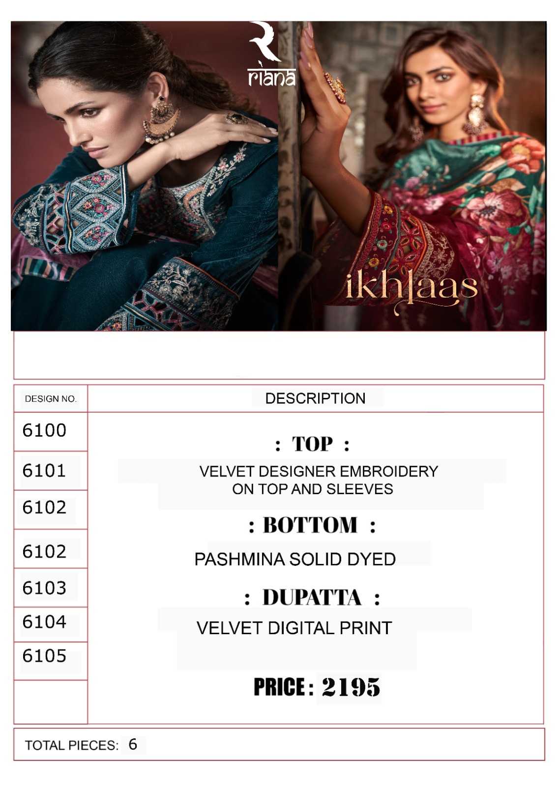 Riana Presents Latest Collection Launched on 13-10-2023. Presenting Beautiful collection of 6 PCS with Unstitched .