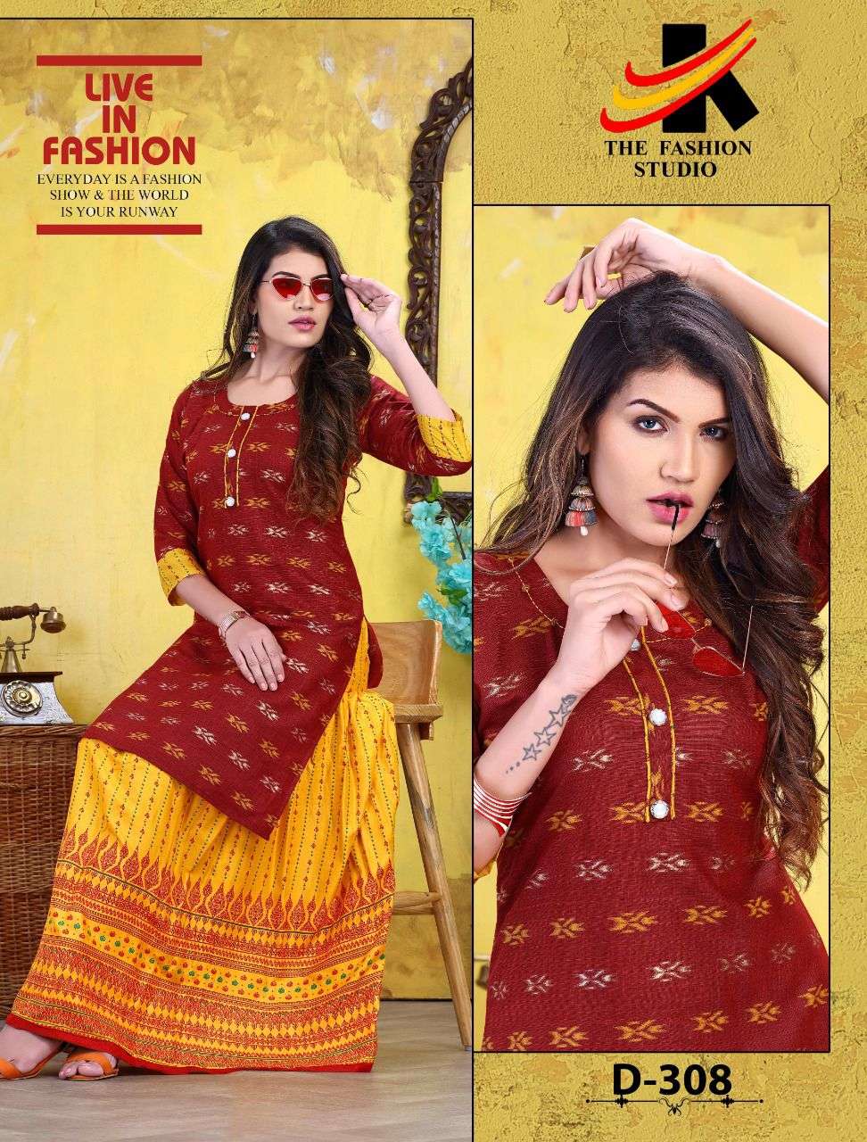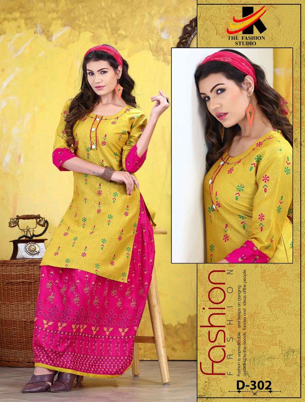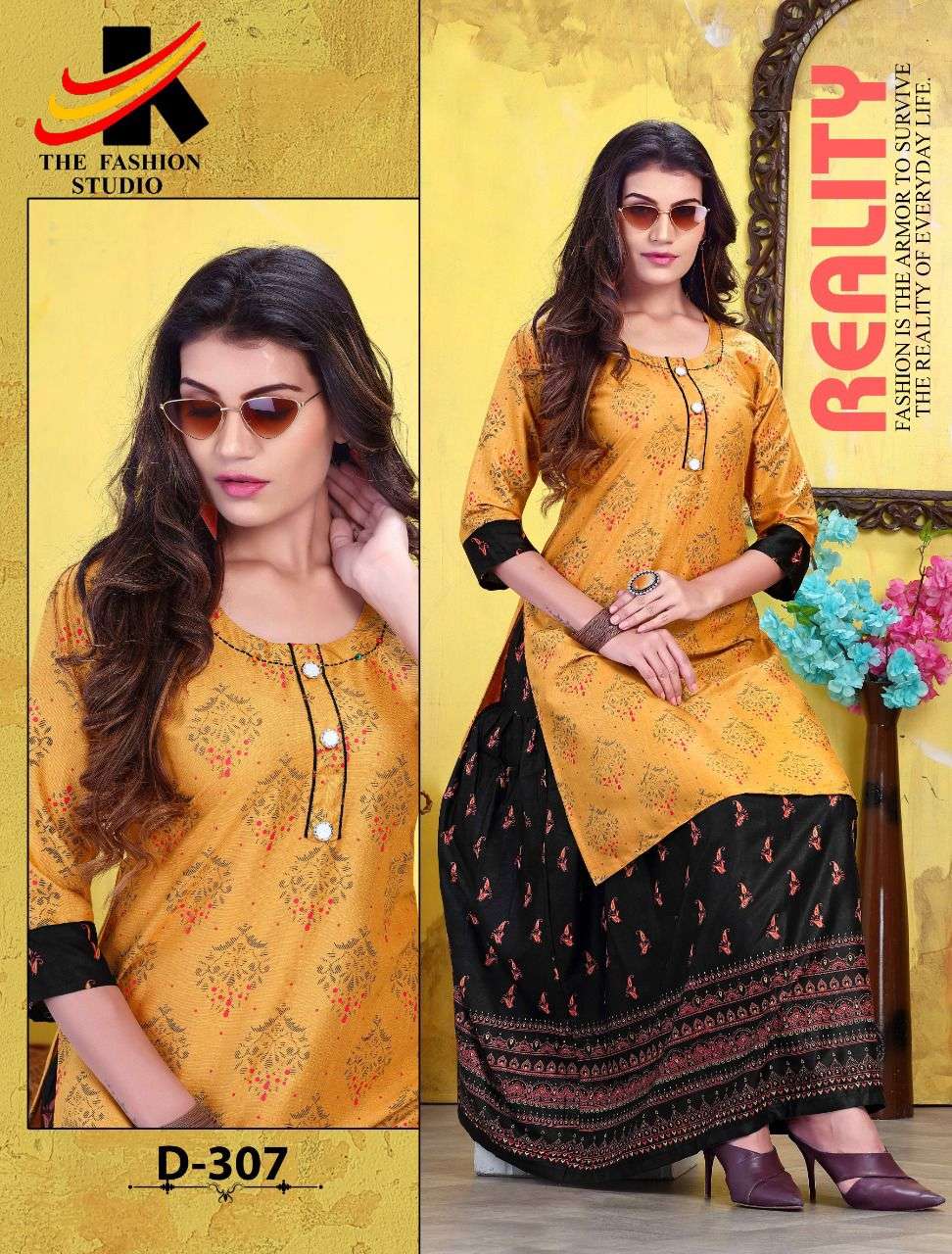 THE FASHION STUDIO Â the premium branded kurtis from THE FASHION STUDIO has launched its new long kurti and skirt set catalog RICH GIRL VOL.2 Top: Rayon two tone with Silai Pattern Foil Gold print Bottom: Rayon skirt with gold print No of Pieces: 8 With pants Rate: 525/- Sizes: L XL XXL |