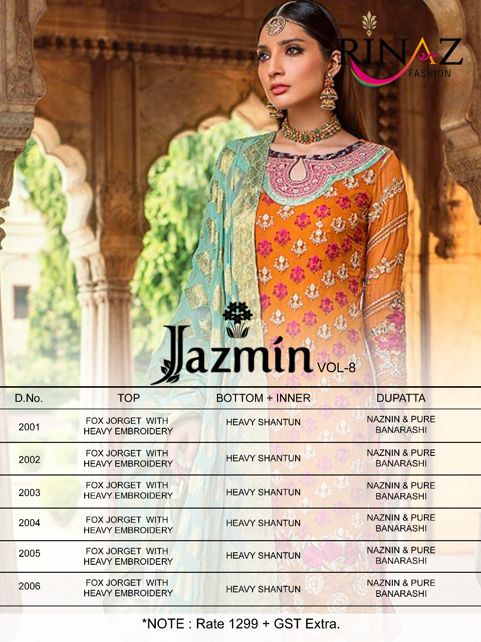 Today RINAZ-FASHION hitting market again with exclusively trending series of pakistani concepts -JAZMIN VOL.-8- Premium Collection Fabric details Top : Fox jorjet with Heavy Embroidery Bottom inner-Heavy Dul shantun Dupatta : Naznin & Banarshi With Heavy embroidery Price : 1299 /+ GST â¤6 pcs |