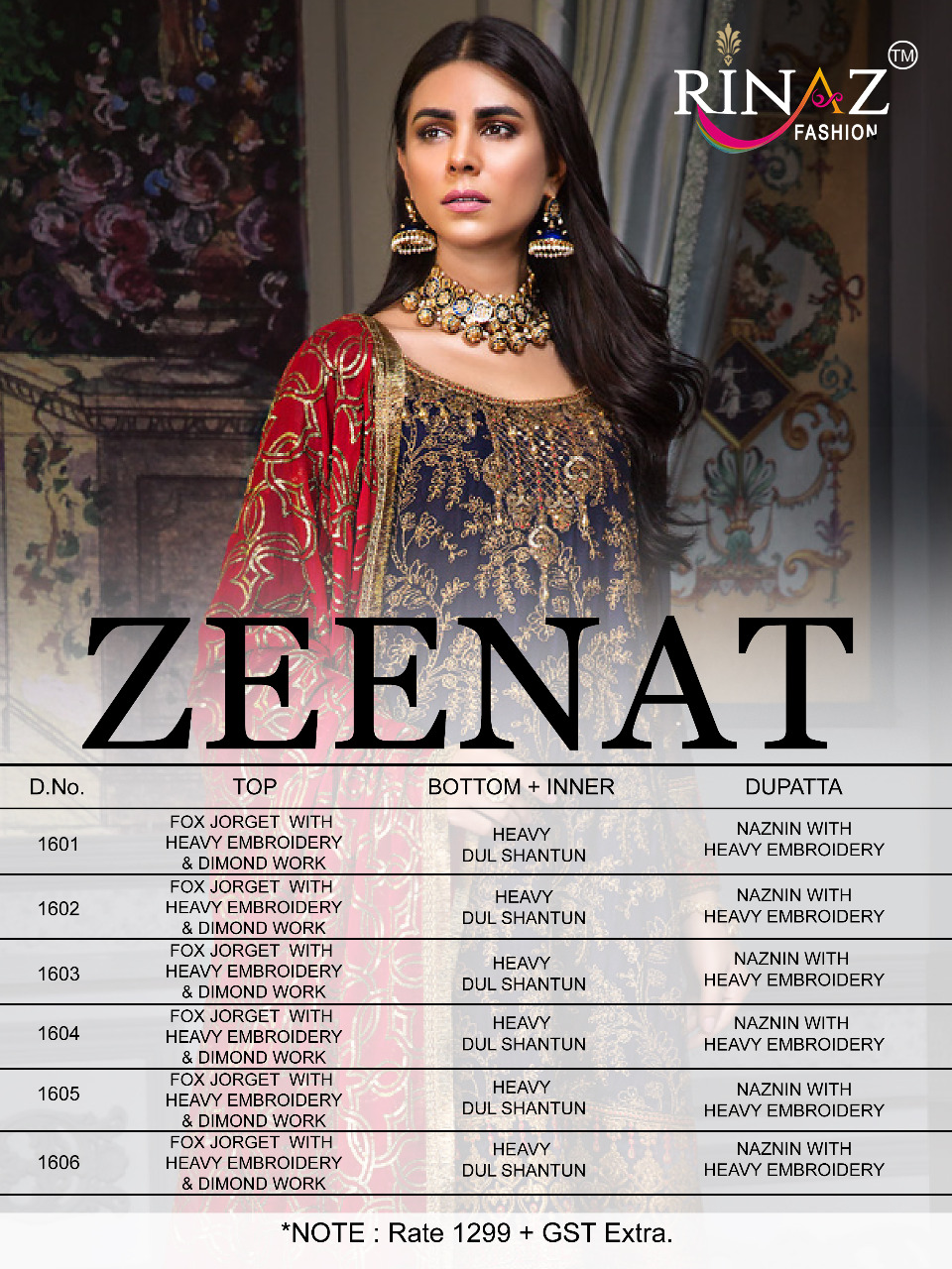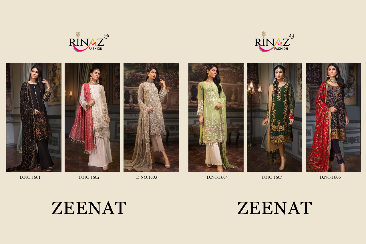 Sir/Madam... Thanks for your support. Today RINAZ-FASHION hitting market again with exclusively trending series of pakistani concepts -ZEENAT- Premium Collection Fabric details Top : Fox jorjet with Heavy Embroidery Bottom inner-Heavy Dul shantun Dupatta : Naznin With Heavy embroidery Price : 1299 /+ GST â¤6 pcs |