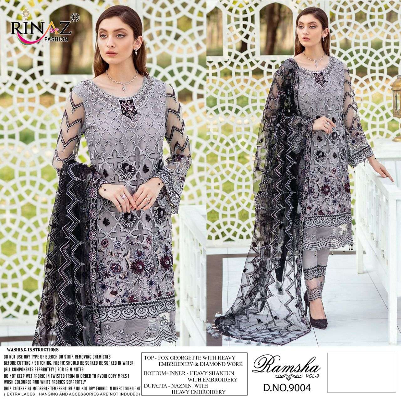 Thanks for your support. Today  RINAZ-FASHION ®*hitting market again with exclusively trending series of pakistani *concepts  Ramsha Vol.-9   Premium collection       Fabric details Top : Fox Jorjet with Heavy Embroidery&Diamond Work Bottom inner- Heavy  Dul Shantun Dupatta :Nazmin With Heavy embroidery Price : 1299/+ GST  Set to set 4 pcs |