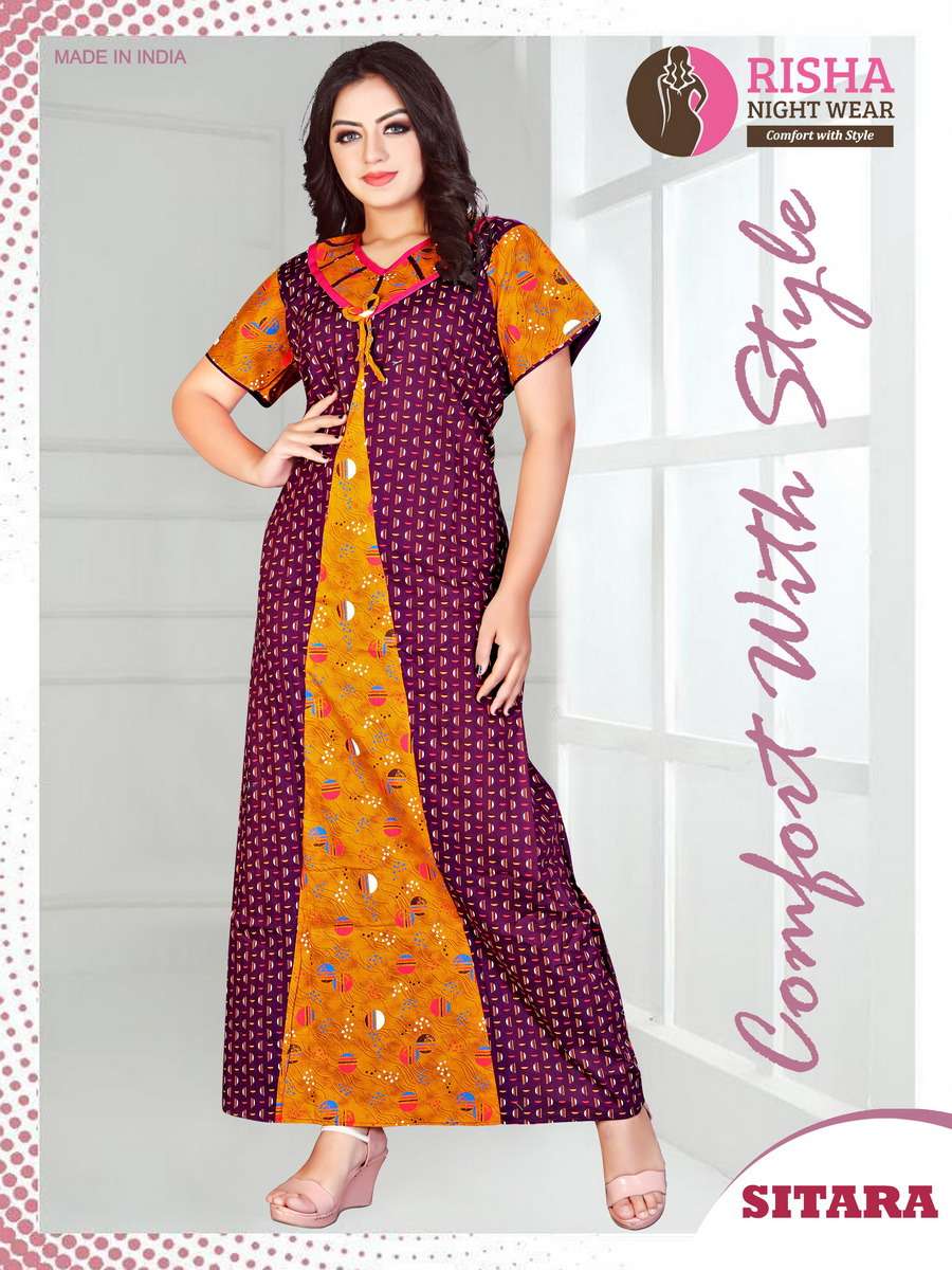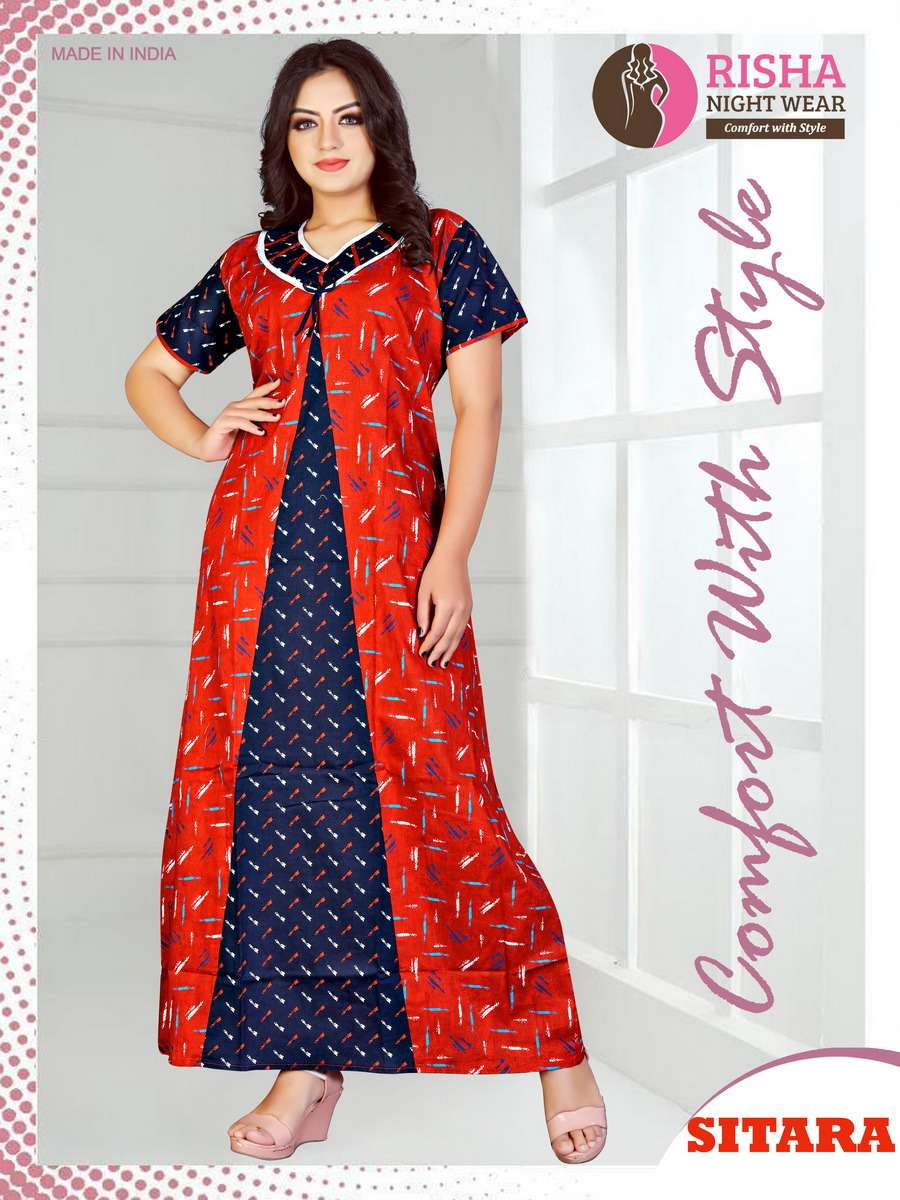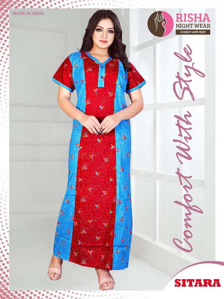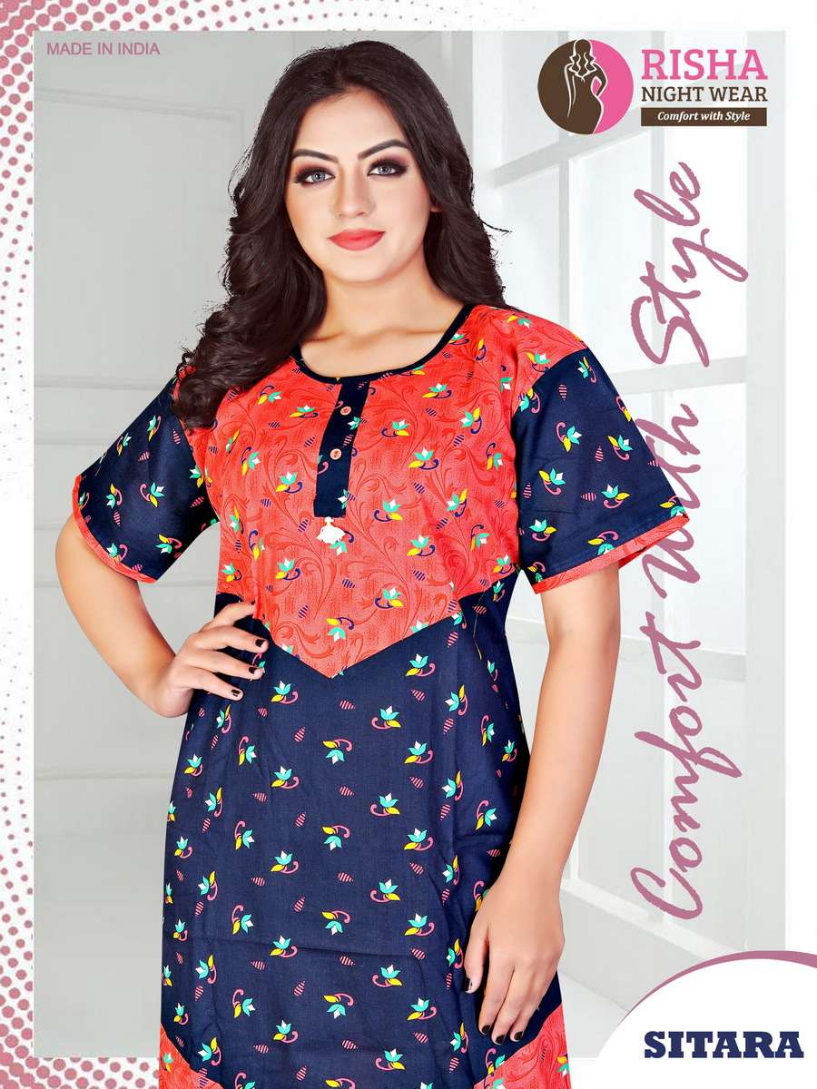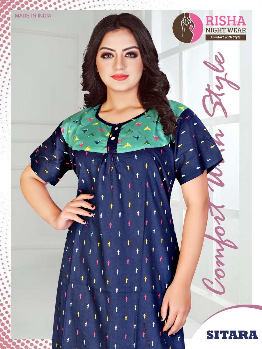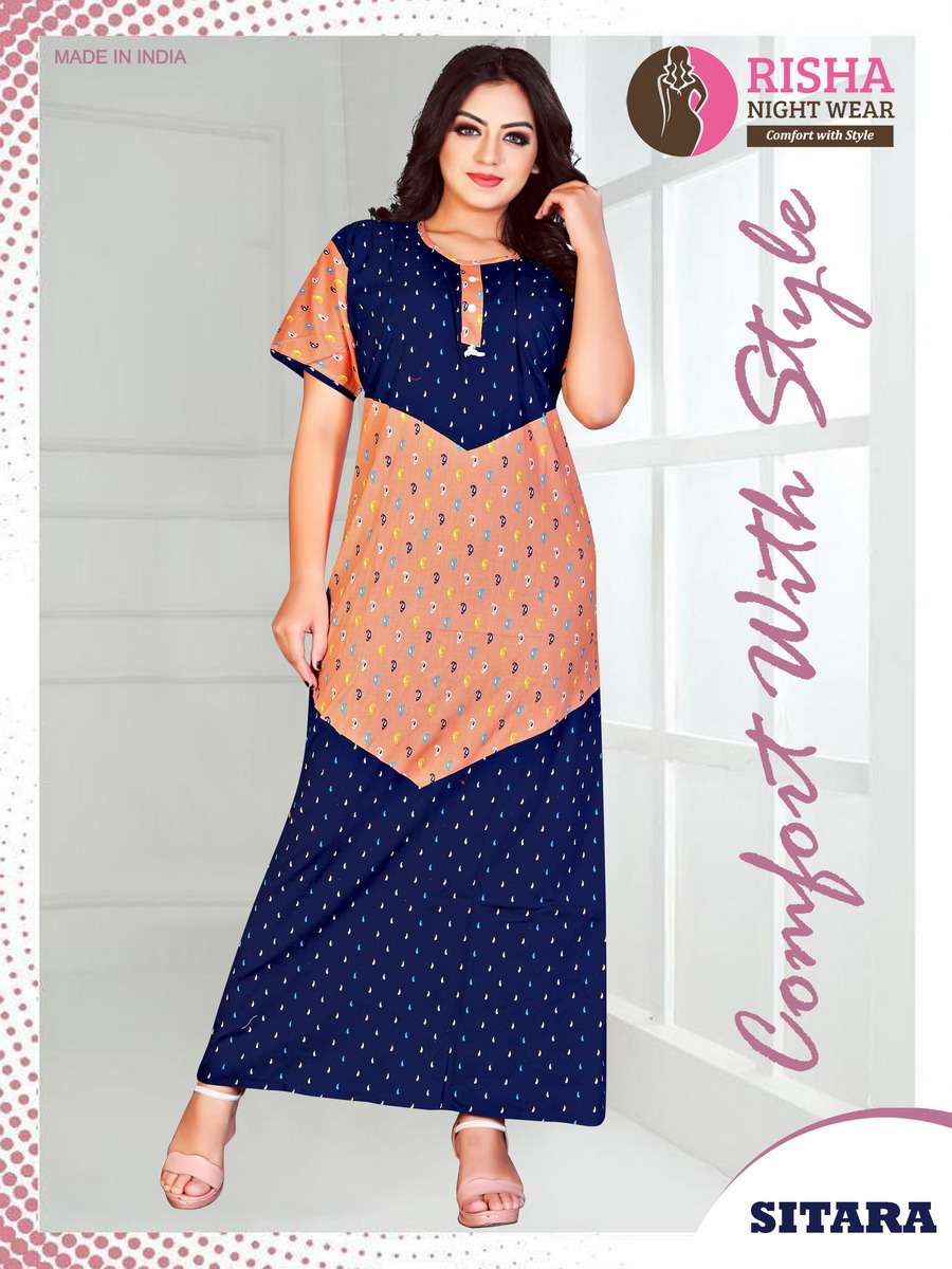 RISHA NIGHT WEAR CATALOG NAME: SITARA 6 NEW DESIGNS CURRENTLY AVAILABLE FREE SIZE RATE IS 275 plus gst |
