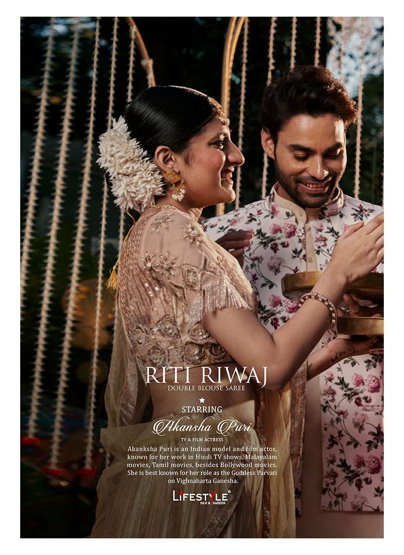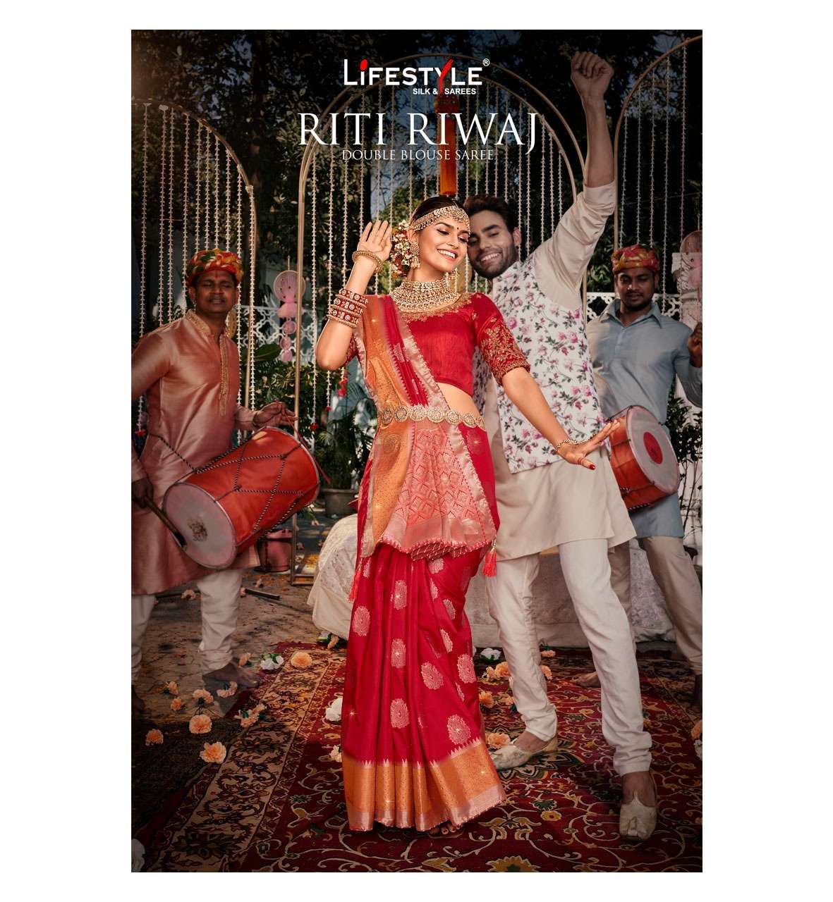 riti riwaz vol 1 by lifestyle raw silk wedding fancy saree with double blouse
