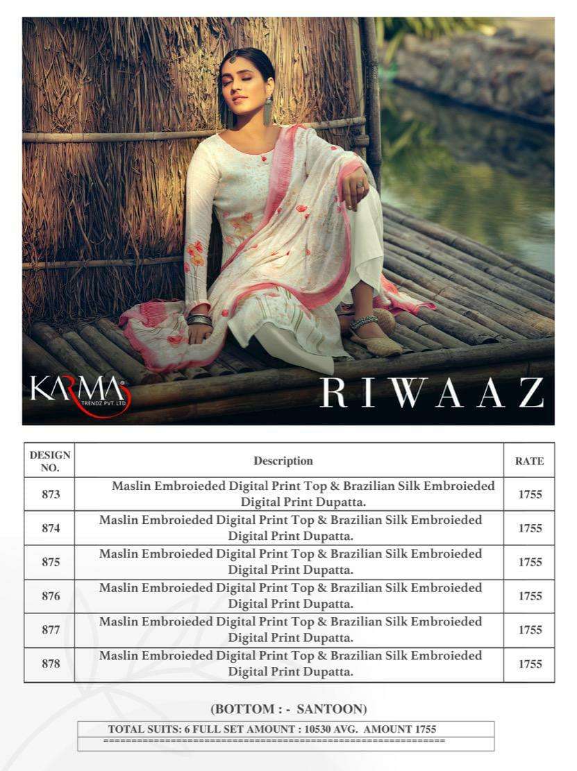 riwaaz 873-878 series by karma maslin embroidery exclusive suits wholesaler