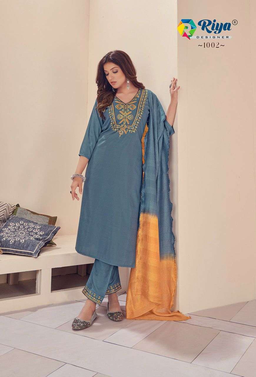 📌 Riya Designer has launched 🔸 Fabric Details 🔸 ▪Top :- Chinon Butty With Embrodairy work ▪Bottom - Chinon Butty with embrodairy work ▪Duptta - Naylone Viscose Dayble (2.40)Cut ▪Total Design :- 05 ▪Rate:- Rs.1075 + Gst