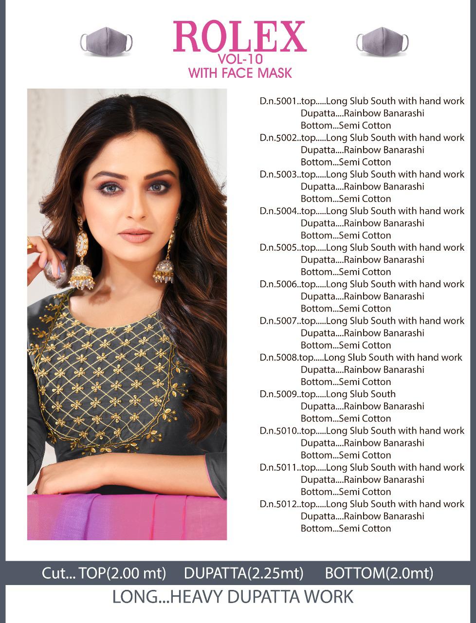 ROLEX VOL. 10 ( with mask ) TOP- LONG SLUB BOTTOM-COTTON DUPATTA-RAINBOW PCS.-12 Complimentary MASK Rate 675 |