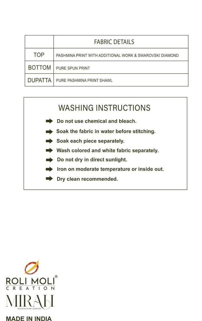Brand - Roli Moli Creation "WINTER COLLECTION" MIRAH Stylish Printed Top 8 Feel Good Designs Fabric Details Top - Pure Pashmina Print with Additional Work And Swarovski Diamond Bottom - Heavy Spun Print Dupatta - Twill Printed Shawl Cut 2.25 Mts approx Leather Bag Pack TEAM - ROLI MOLI CREATION |