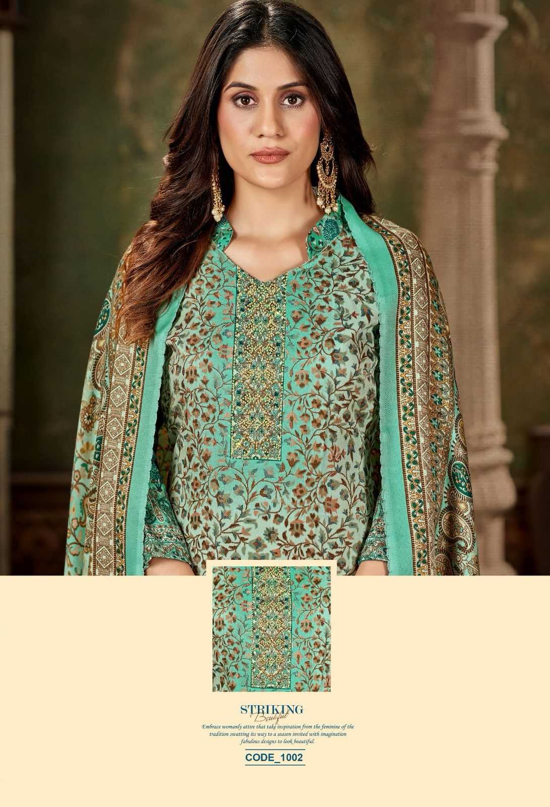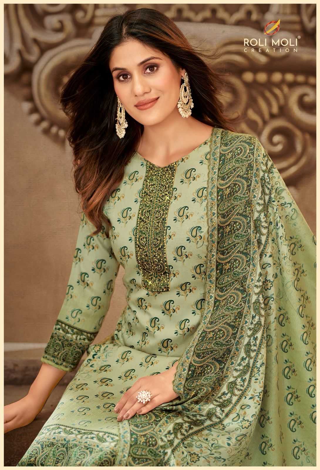 Brand - Roli Moli Creation "WINTER COLLECTION" KHUSHBOO Stylish Printed Top 8 Feel Good Designs Fabric Details Top - Pure Pashmina Printed with Swarovski Diamond Work Bottom - Heavy Spun Dupatta - Twill Printed Shawl Cut 2.25 Mts approx Leather Bag Pack TEAM - ROLI MOLI CREATION |