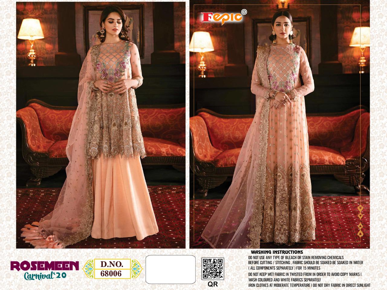 ROSEMEEN * CARNIVAL 20â * Fabric details Top : GEORGETTE/NET Bottom : SANTOON INNER- SANTOON Dupatta : NAZMEEN/ NET Price : 1199/-+ GST ⤠6 pcs Hurry up... LIMITED STOCK pre booking only book your order fast Limited stock DISPATCH STARTS ON Wednesday Regards FEPIC |