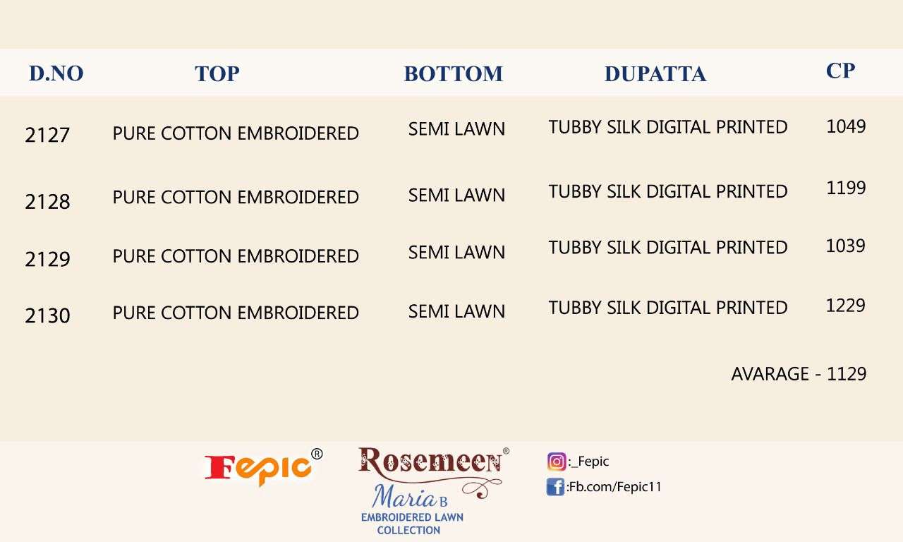 FEPIC Thanks for your support. Today we are launching Pakistani  Concept... Catalogue Name:-  * ROSEMEEN MARIA B * ( EMBROIDERED LAWN COLLECTION )    Fabric details Top : PURE COTTON EMBROIDERED Bottom  :SEMI LAWN â Dupatta : TUBBY SILK DIGITALY PRINTED  ©Company average Rate :1129/- |