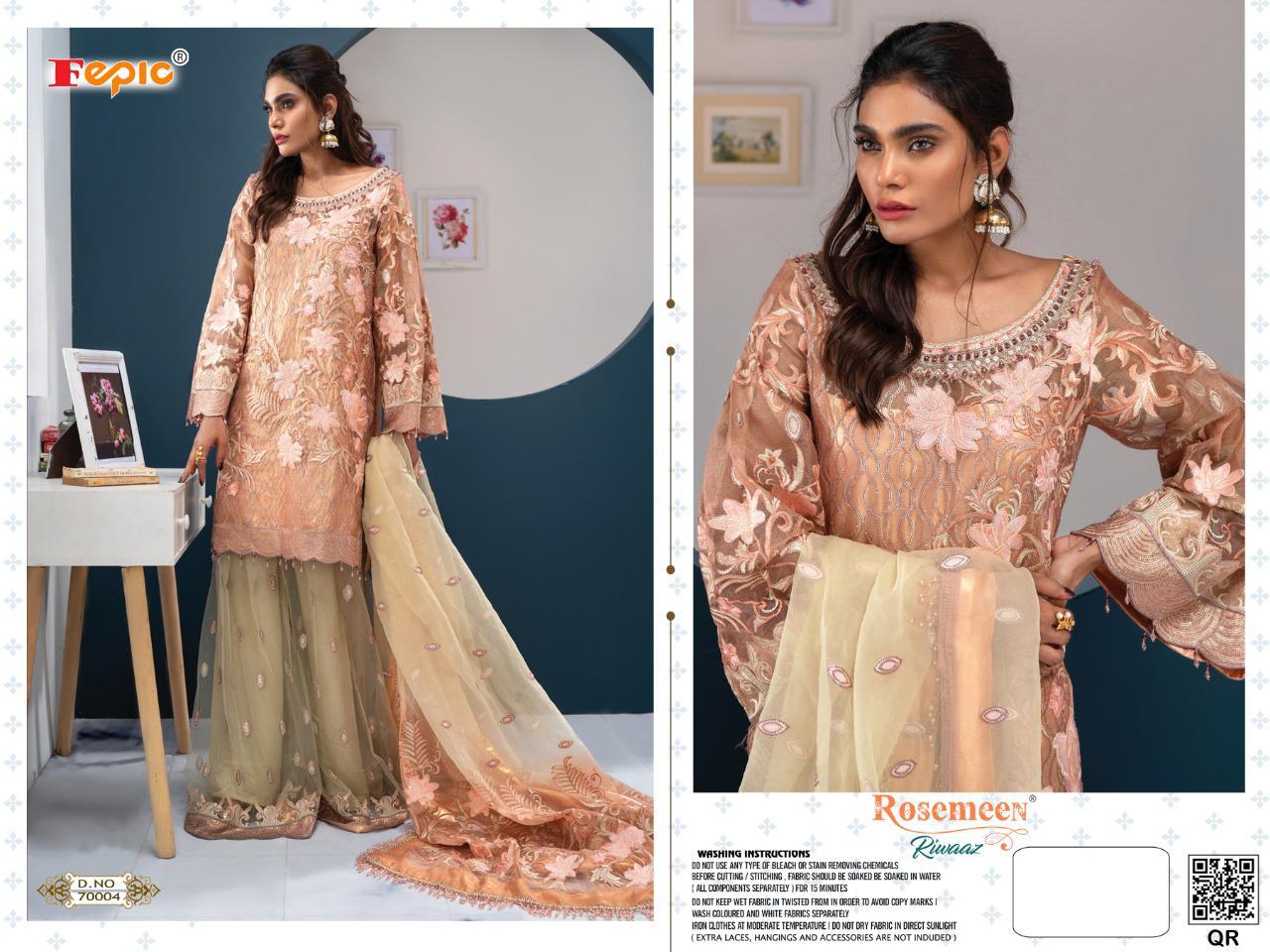 👇🏻Fabric details 👇🏻 👗 Top : GEORGETTE/ORGANZA/NET 👖Bottom : SANTOON 🔺Dupatta : NET/ORGANZA/NAZMEEN 🍫Inner : SANTOON ❤️PRICE : 1199💸 /-+ GST DISPATCH STARTS 4-5 days . Series - 70001 to 70005. Regards FEPIC |