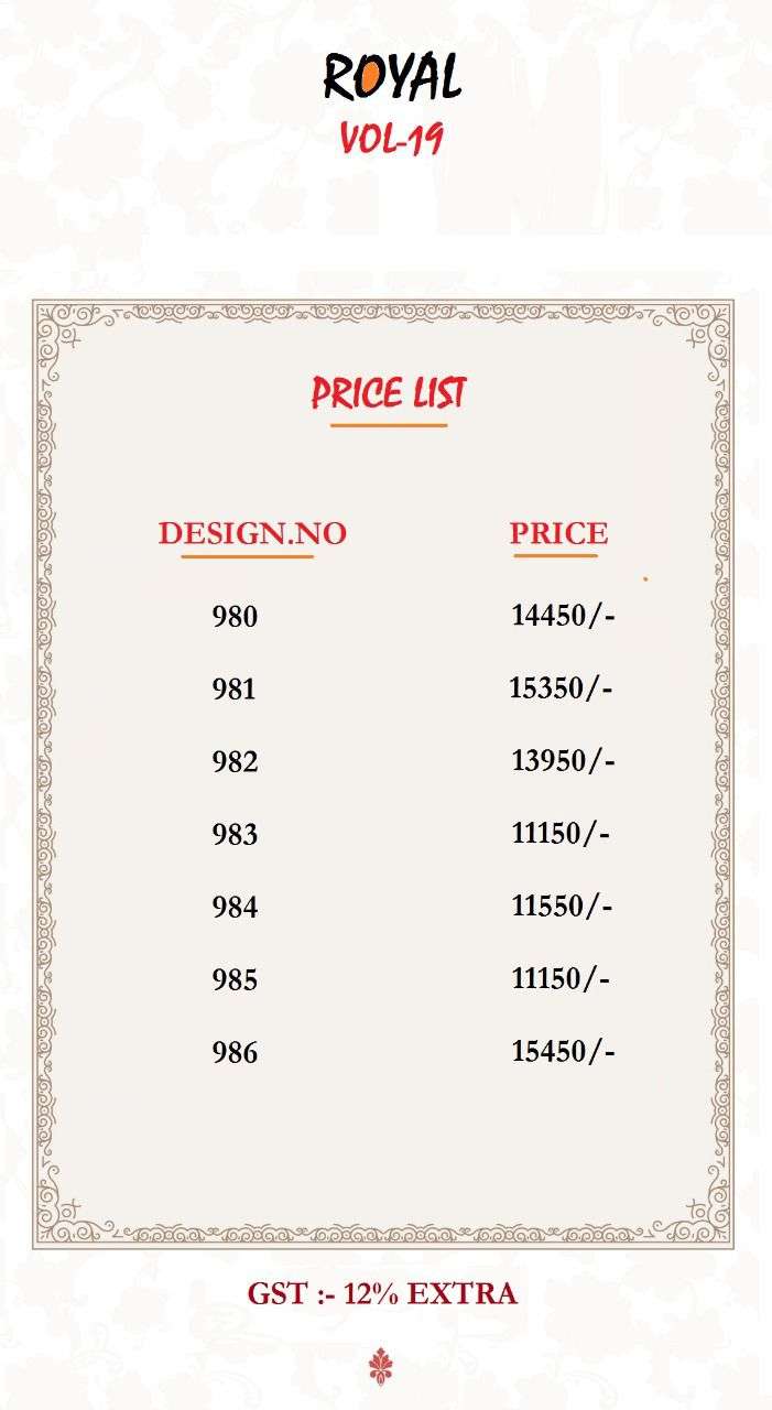 Brand - Royal . Type - Lehnega . Series - 980 to 986. PRICE LIST HAS ATTACHED GST 12 Percent Extra. Delivery from tomorrow |