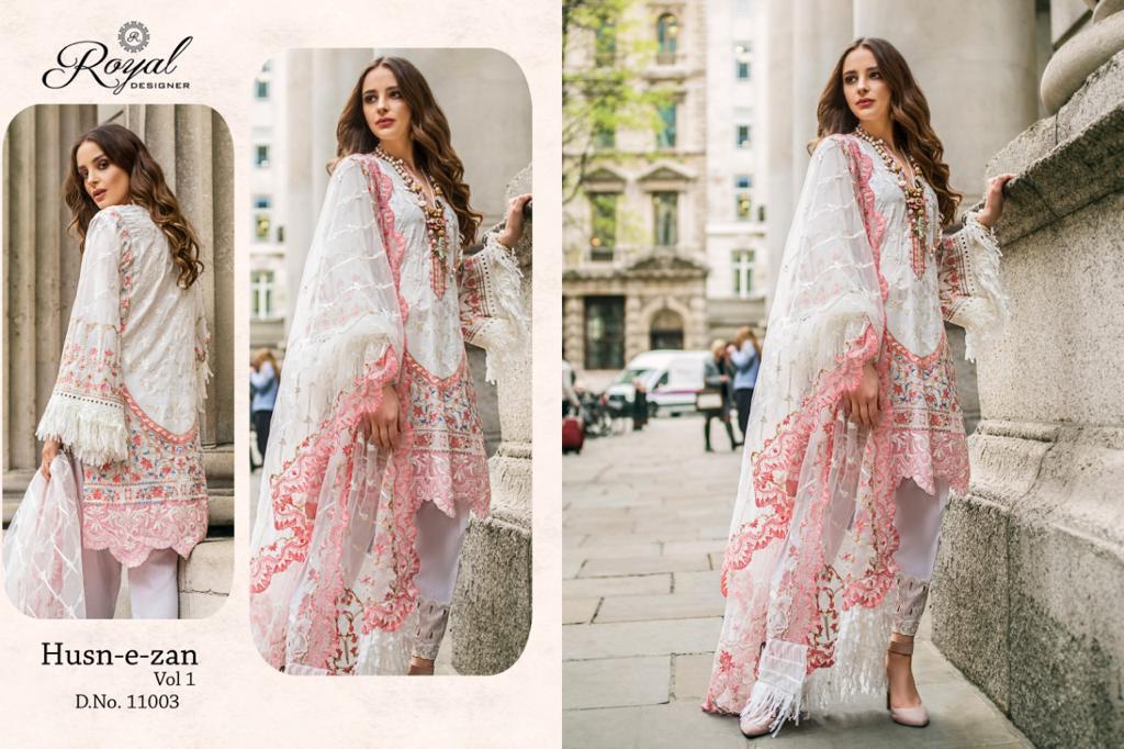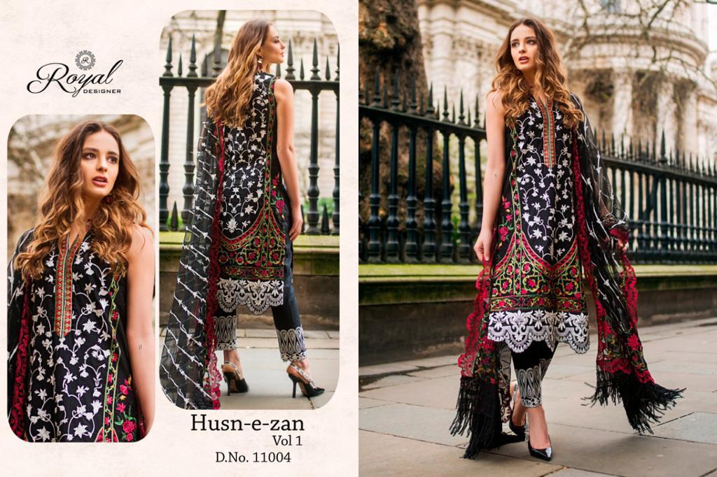Dear Sir/Madam... Thanks for your support. Today ROYAL DESIGNER hitting market again with exclusively trending series of pakistani catlogs âÂÂHUSN-E-ZAN Fabric details Top : cambric cotton with heavy / Sifly embroidery work Bottom :- semi lawn printed Dupatta :NET Havey embroidery work/ silver siffon printed Price : 899/-+ GST â¤6pcs Hurry up... LIMITED STOCK pre booking only book your order fast Limited stock |