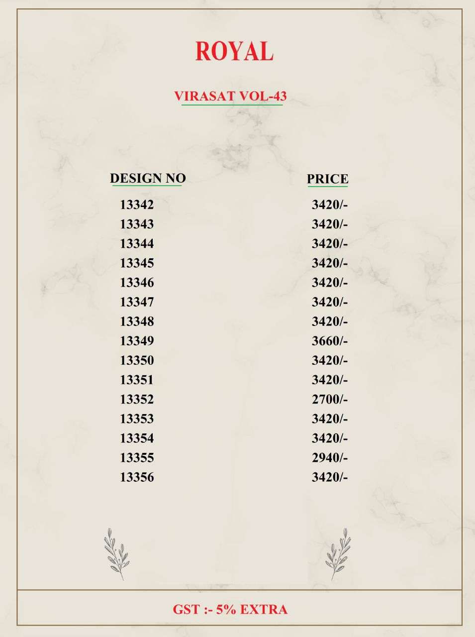 Brand - Royal . Catlog name - Virasat Vol -43. * set to set * Delivery 2 days . Fabric- P silk . |