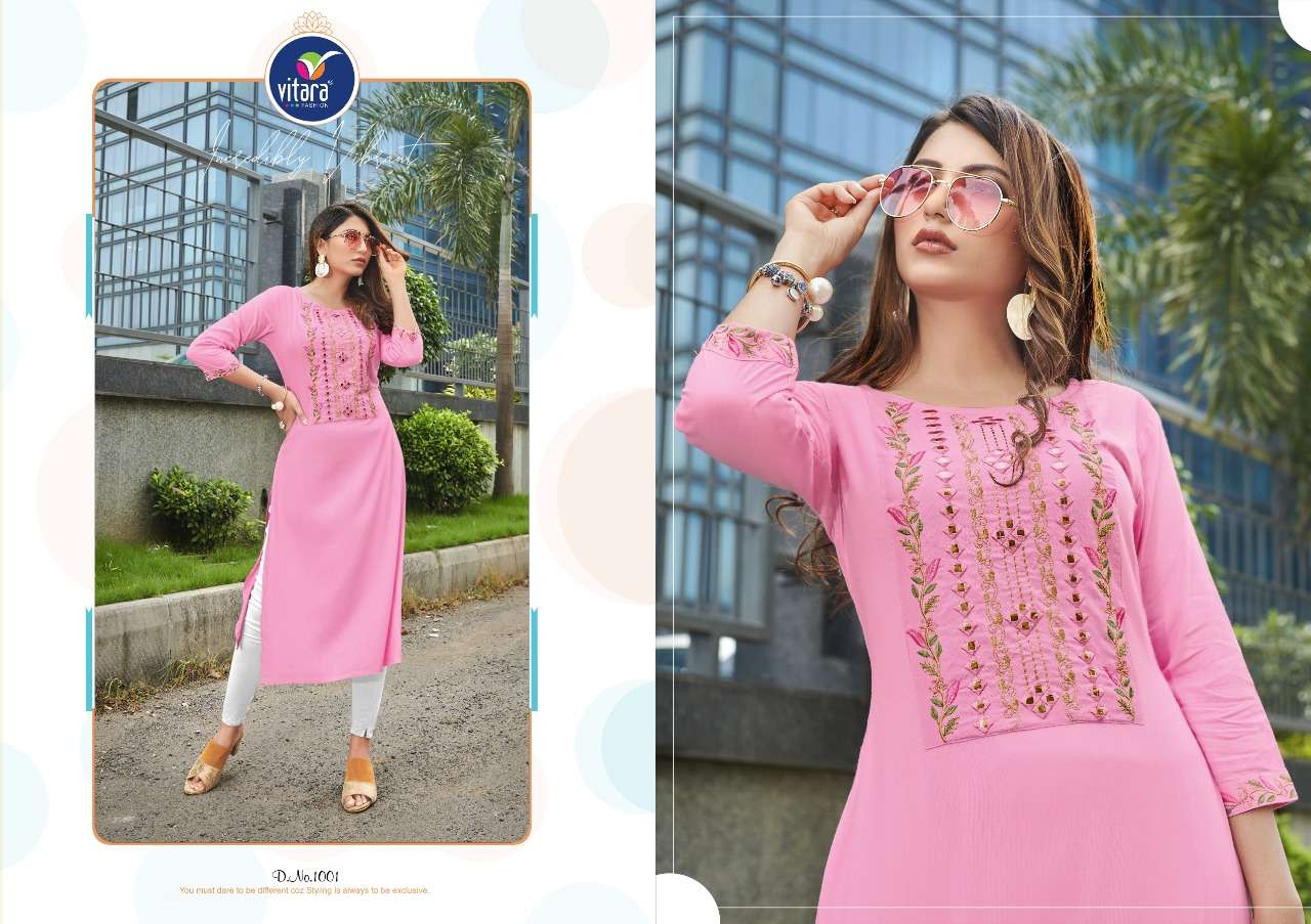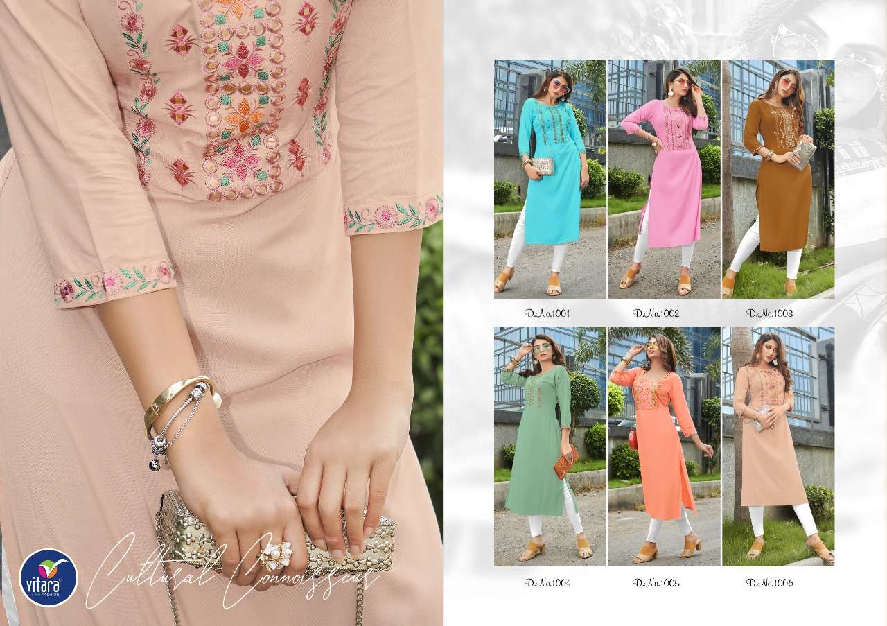 vitara fashion  launches exclusive designer  kurti       Catalogue name-  ROYALTY        fabric heavy airjet reyon with embroidery size-m(38),L(40),xl(42),xxl(44)   Length TOP - *48 * Designs- 6 Rate:- 499/- GST +5% ADD ON BILL AMT regard shree karni impex |