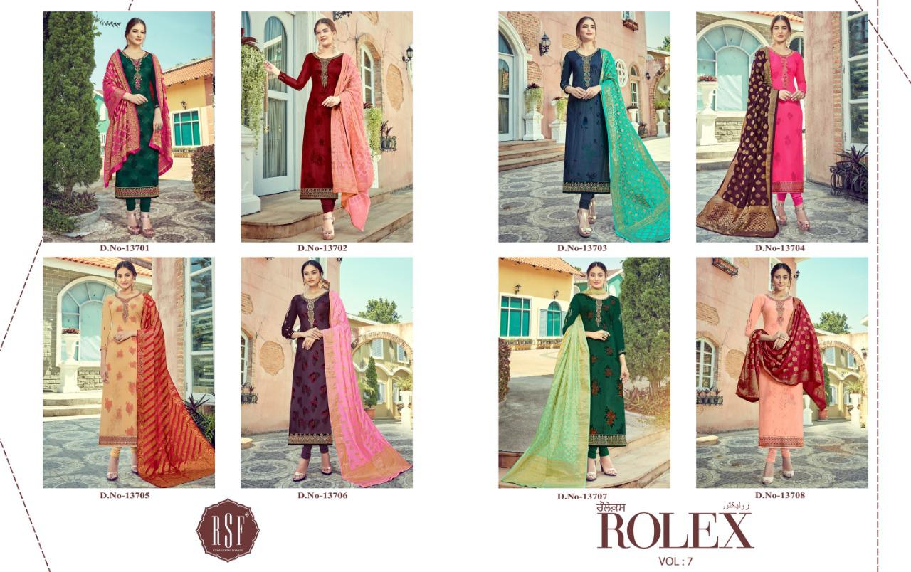 Description-Rolex vol 7 1-TOP:-Gorgette long suit With hand work 2-INNER:-Print crape inner 3-Bottom:- japan santun 4-Dupatta:-Banaras jacard 5-Special:- Print inner & Banarasi jacard dupatta✅ 6-Design:- 8 Pcs 7-Rate:-995/- 8-Dispatch:- 4 December19 Having limited stock One shot dispatch Please order now Regards:- Riddhi siddhi fashion Rsf® surat |