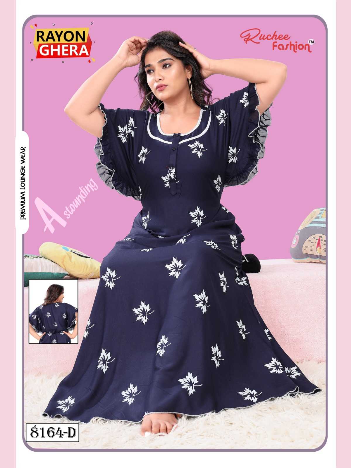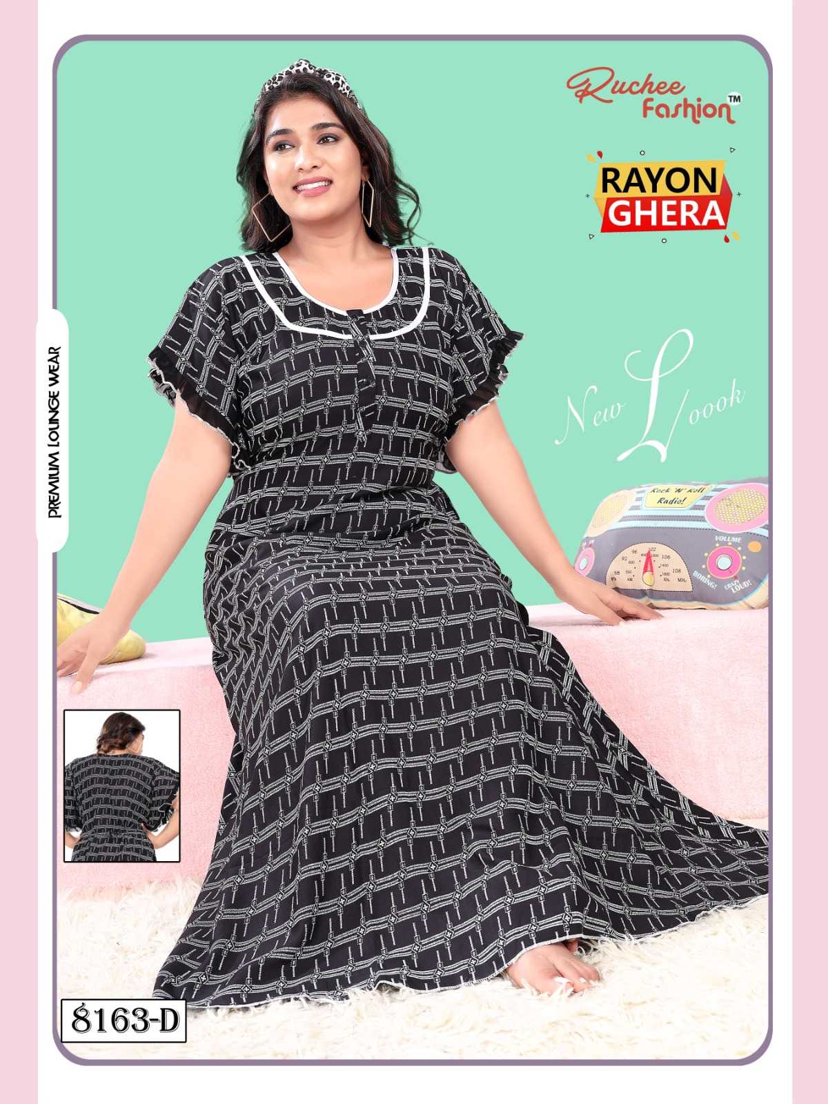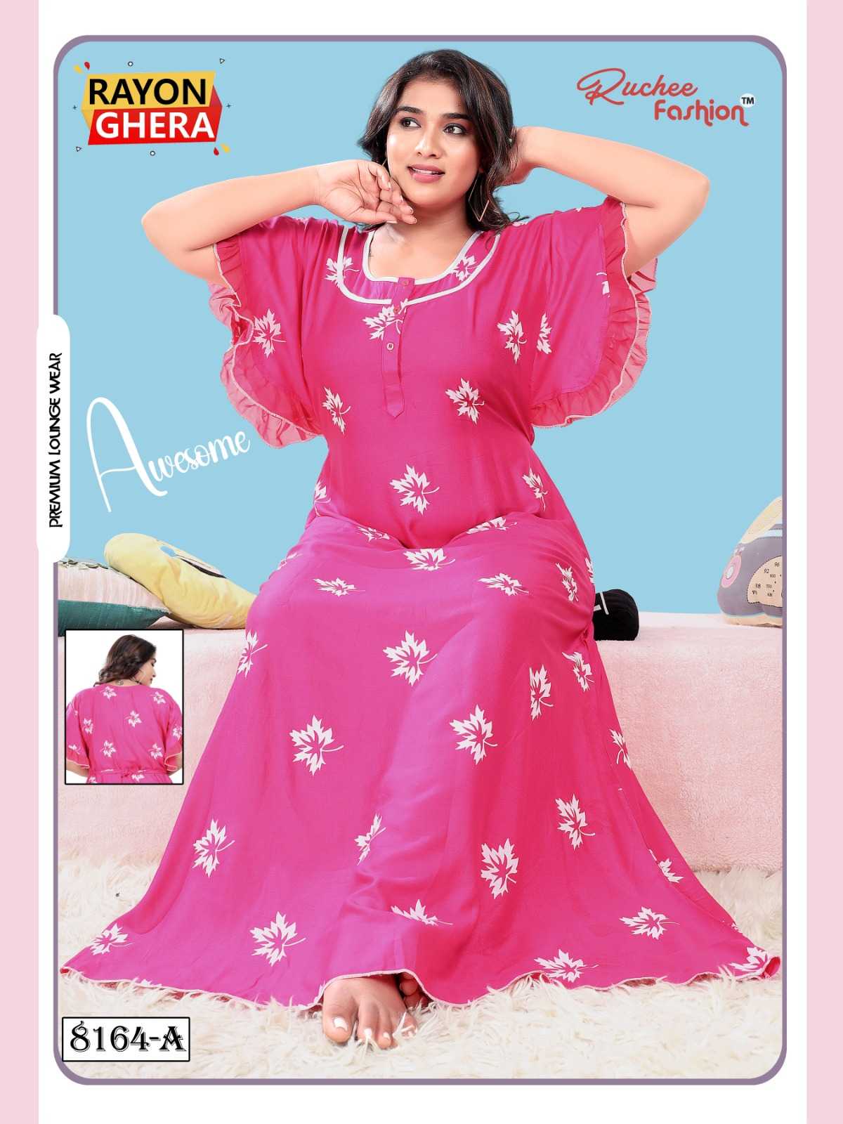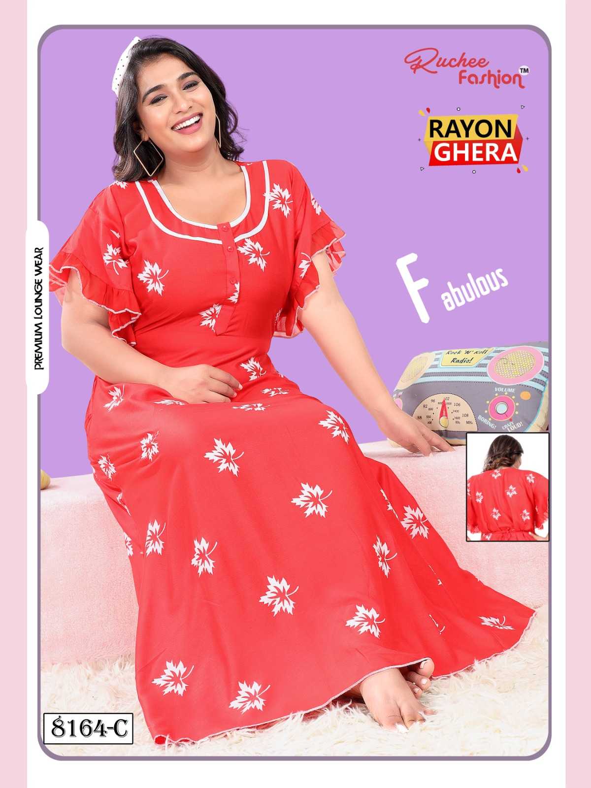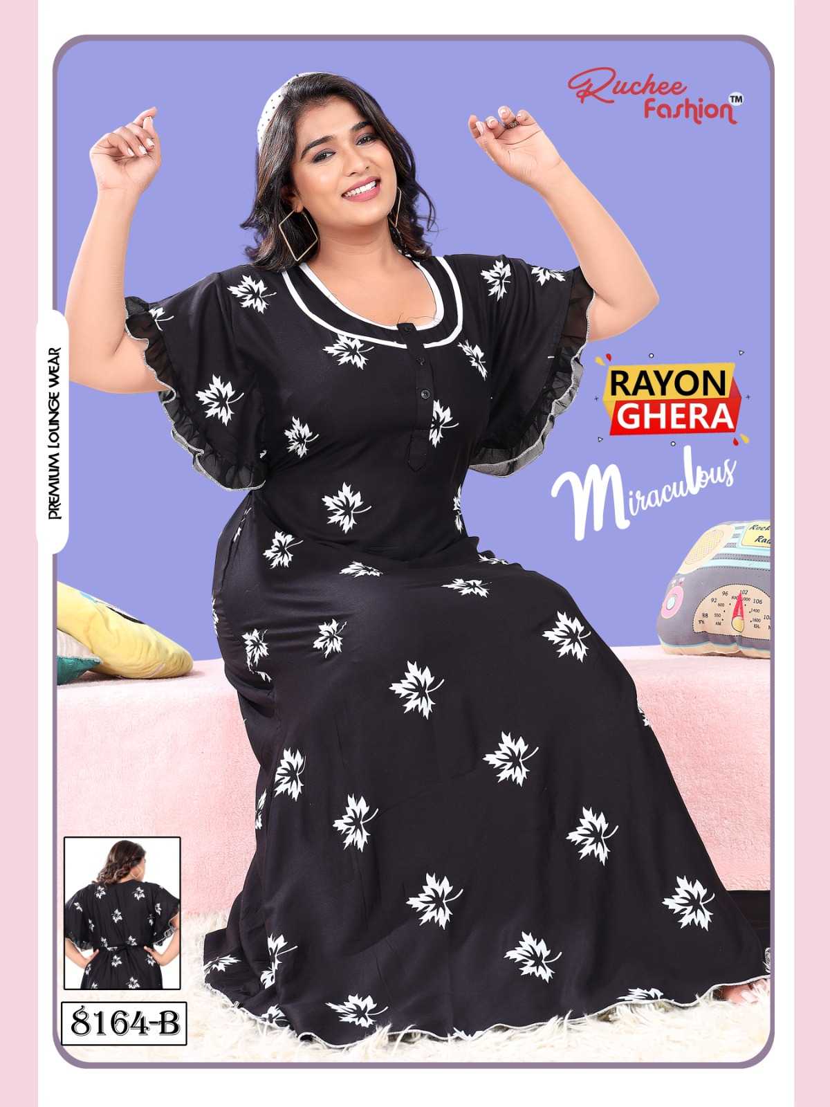 RUCHEE FASHION DESIGN 8159, 8163, 8164 RAYON GHERA FANCY SLEEVES WOMEN NIGHTY SIZE- FREE SIZE PCS :- 12 |