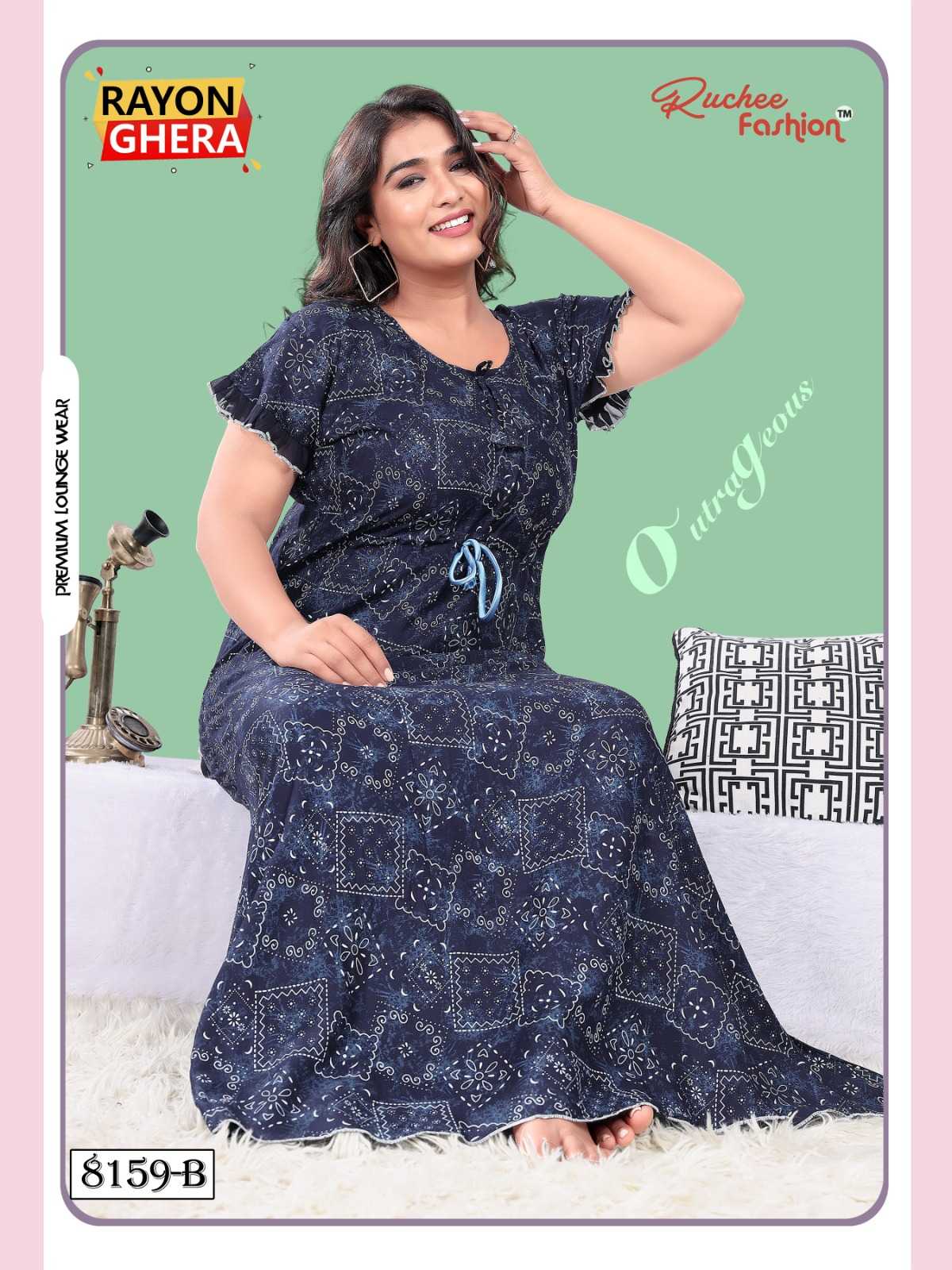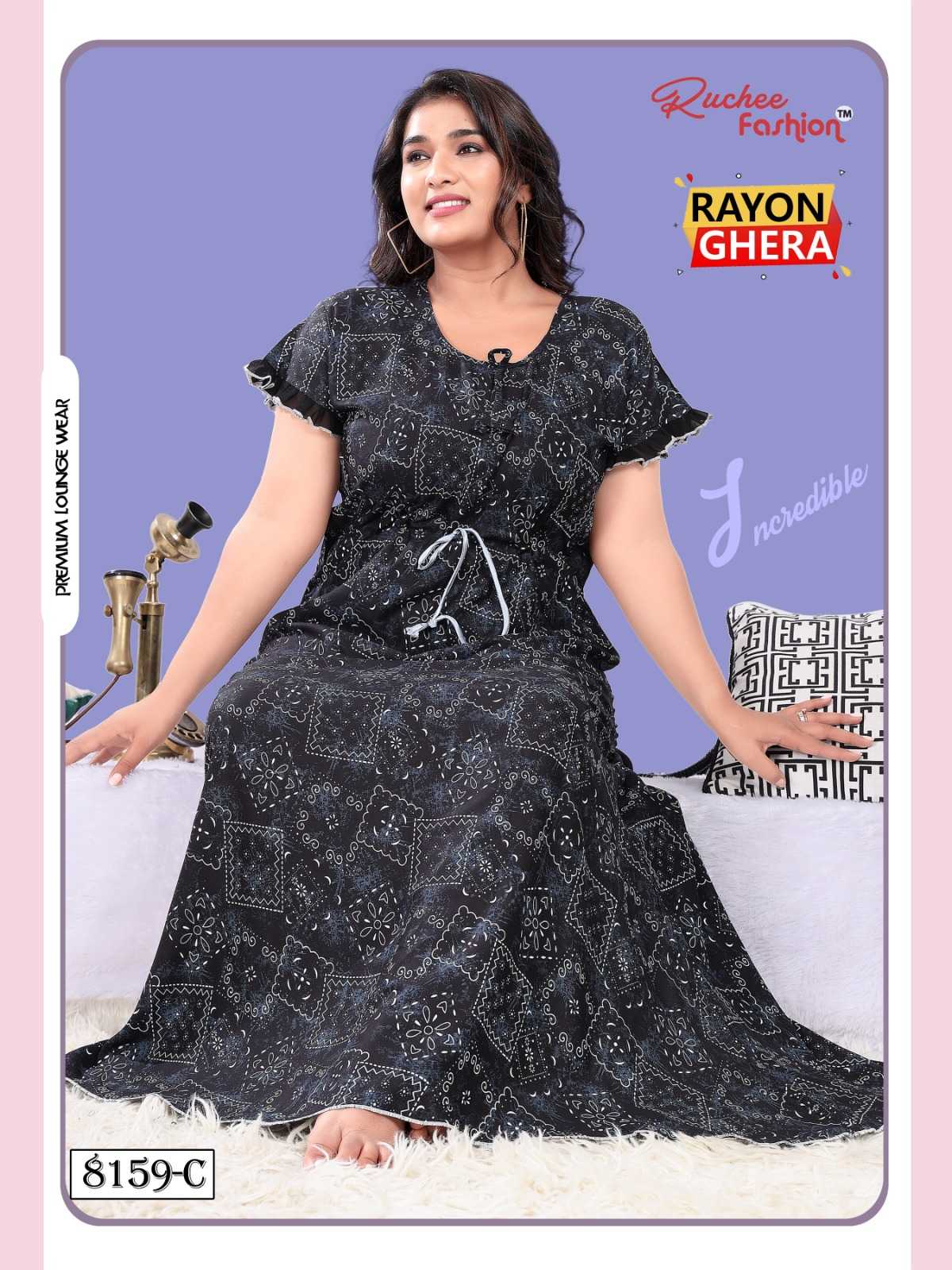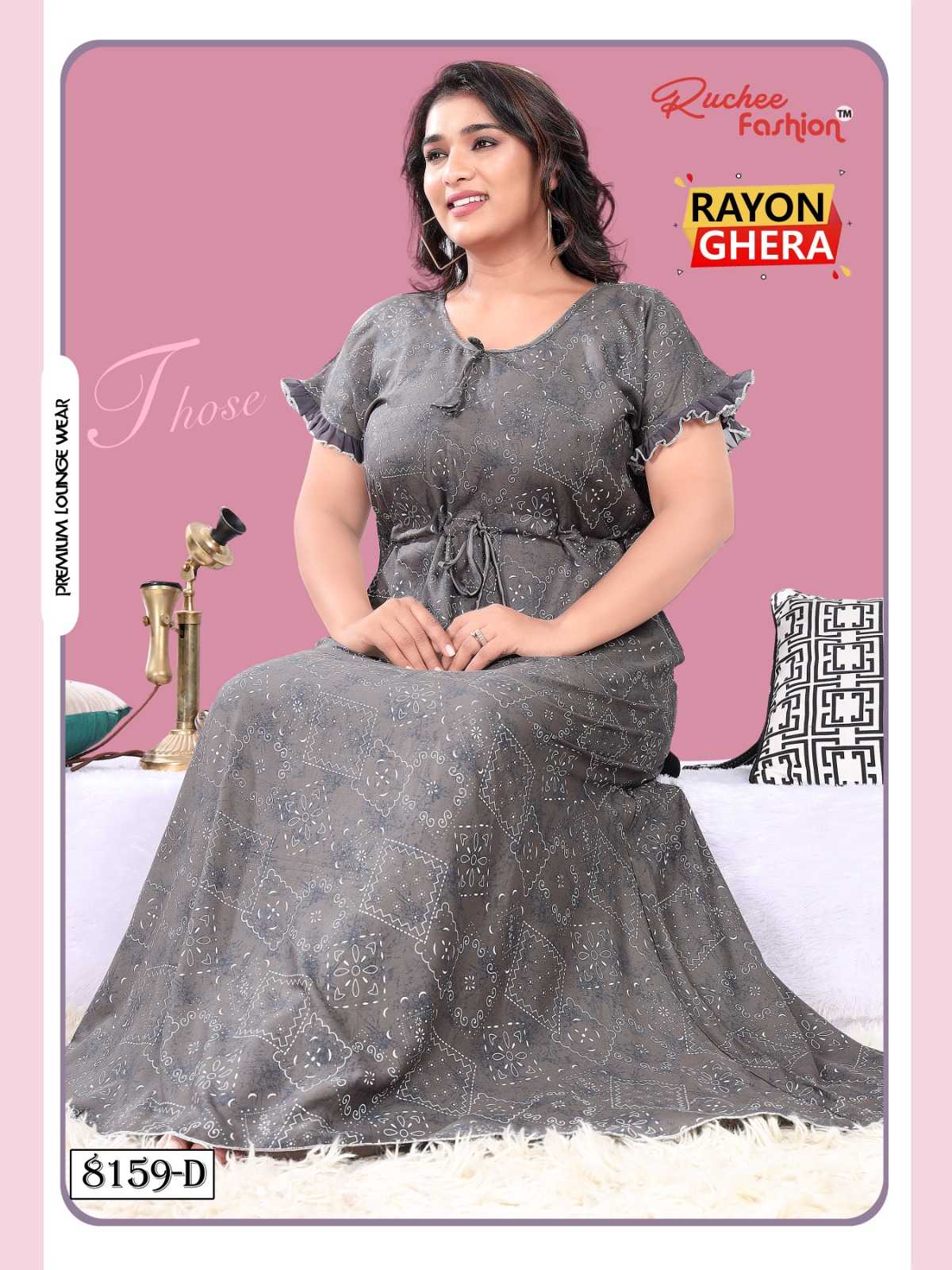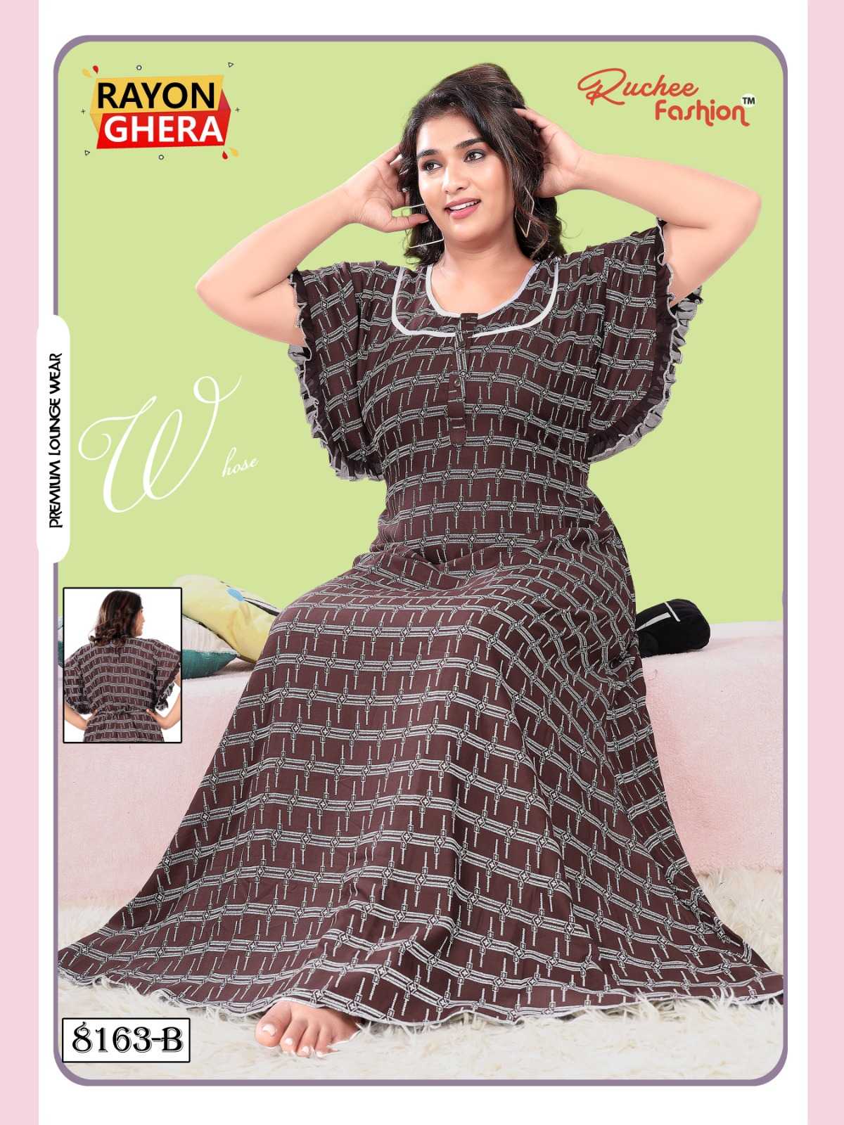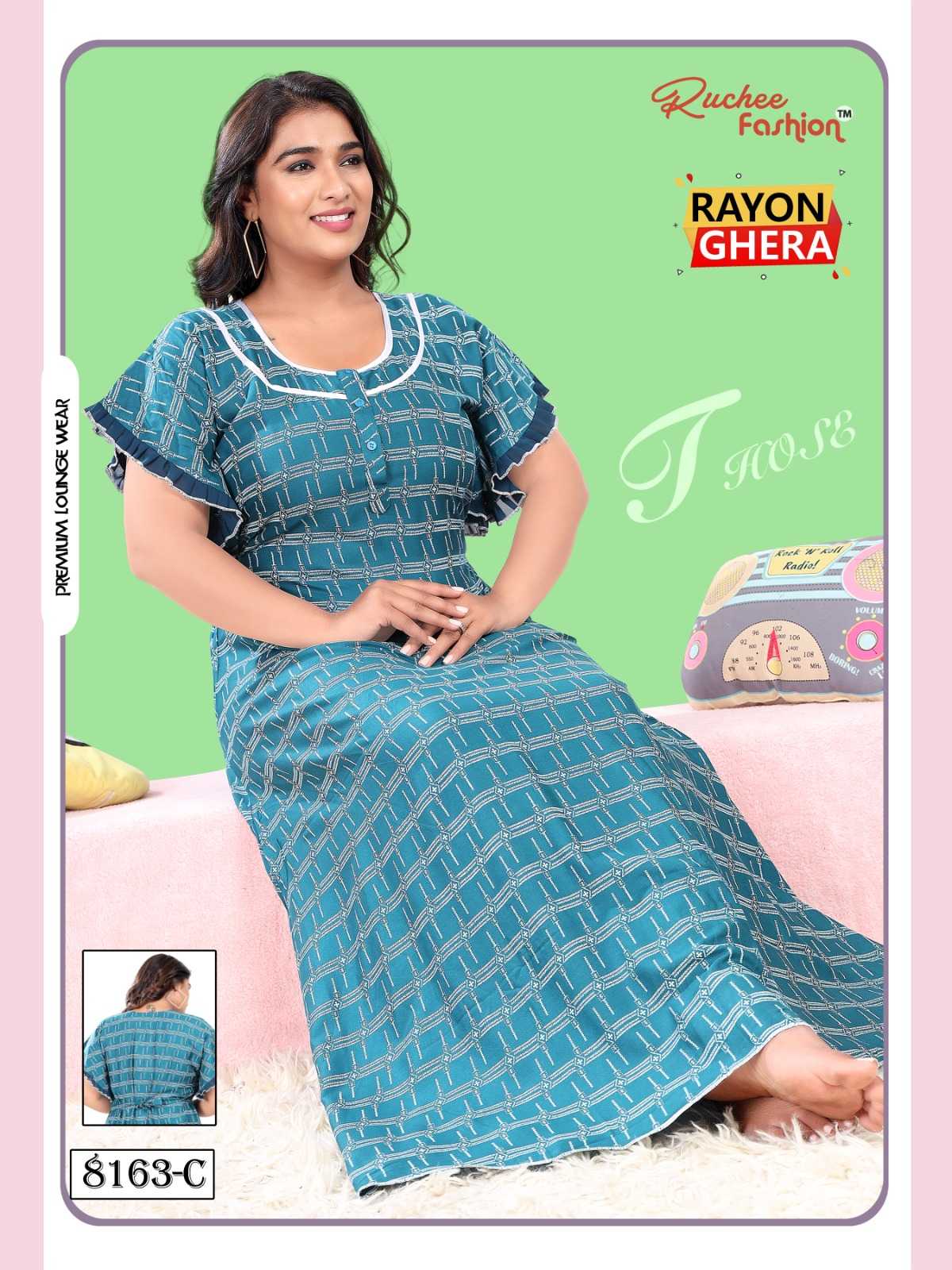 RUCHEE FASHION DESIGN 8159, 8163, 8164 RAYON GHERA FANCY SLEEVES WOMEN NIGHTY SIZE- FREE SIZE PCS :- 12 |