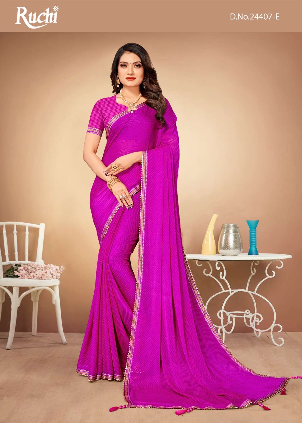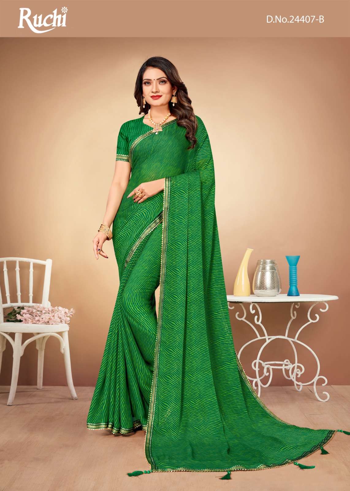 RUCHI SAREES CATALOG - Jalpari LEHRIYA - 10. PCS. - 06. FABRIC - CHIFFON SAREE WITH ATTACHED BANARSI BORDER & TASSELS. WEIGTH - 450 GRAMS APPROX. |