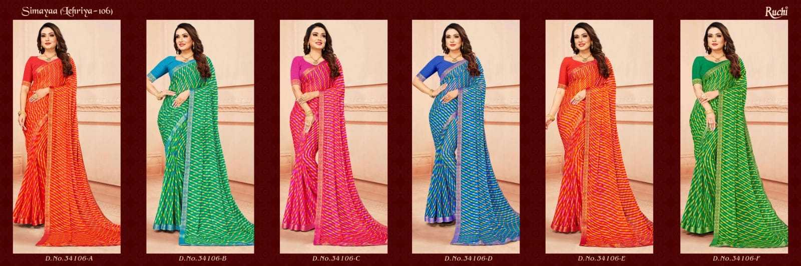 Hello, Ruchi Sarees Folder - Simayaa Lehriya. 106 Fabric - Chiffon Saree with attached border. Packing - Setwise only. Price - 528/- per pcs GST EXTRA Set to set |