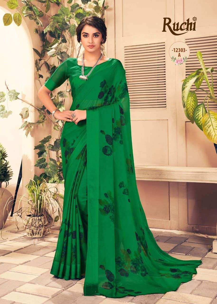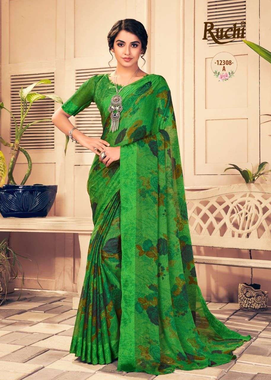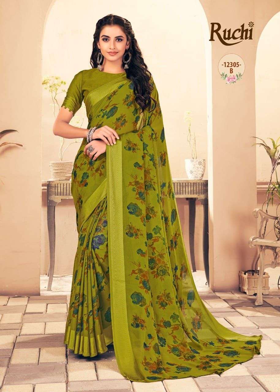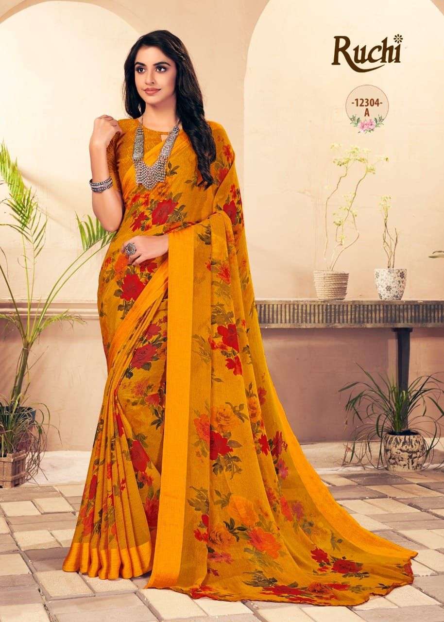 Ruchi Sarees. 1). Catalog - STARWBERRY 18th Edition. 2). Fabric - Chiffon Sartin Border. 3). Pcs.- 20 4). Packing - Setwise. 5). Rate- 460/- per pcs Set to set. GST 5 Percent Extra. Delivery 2 days |