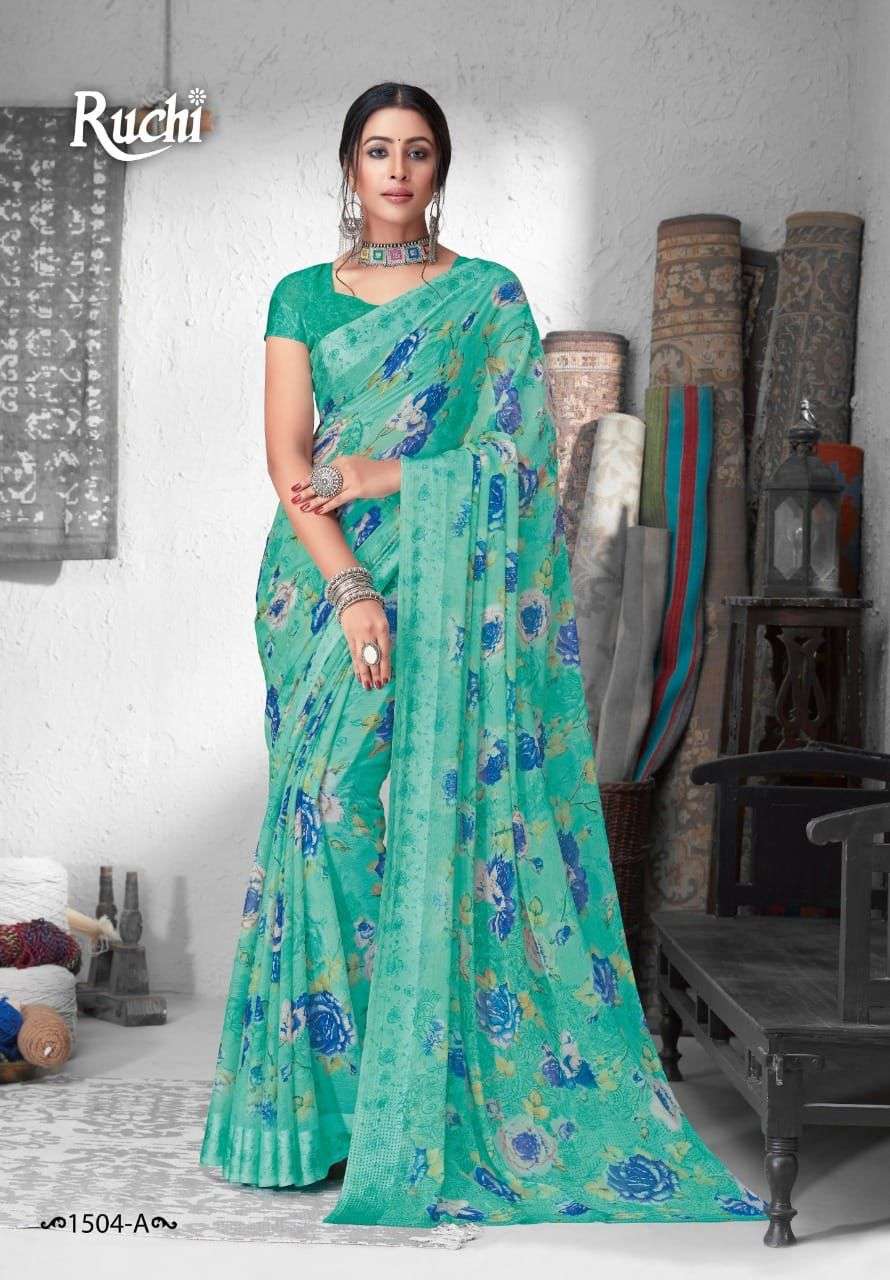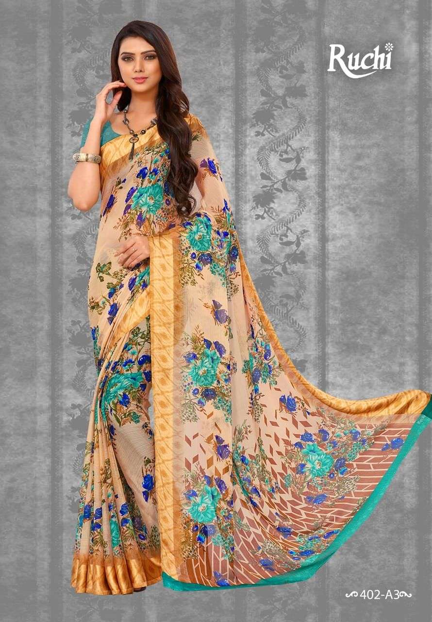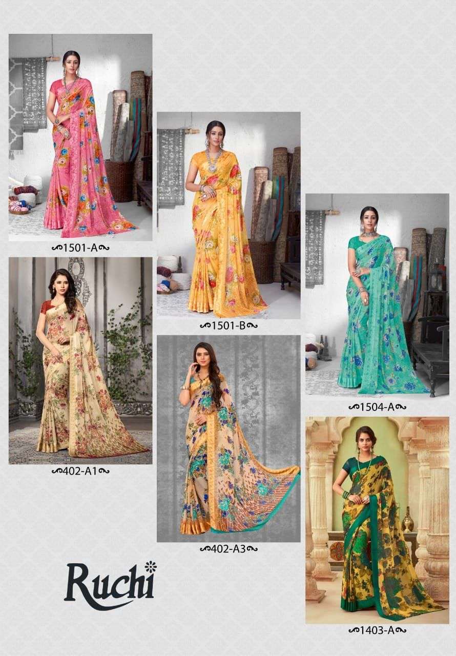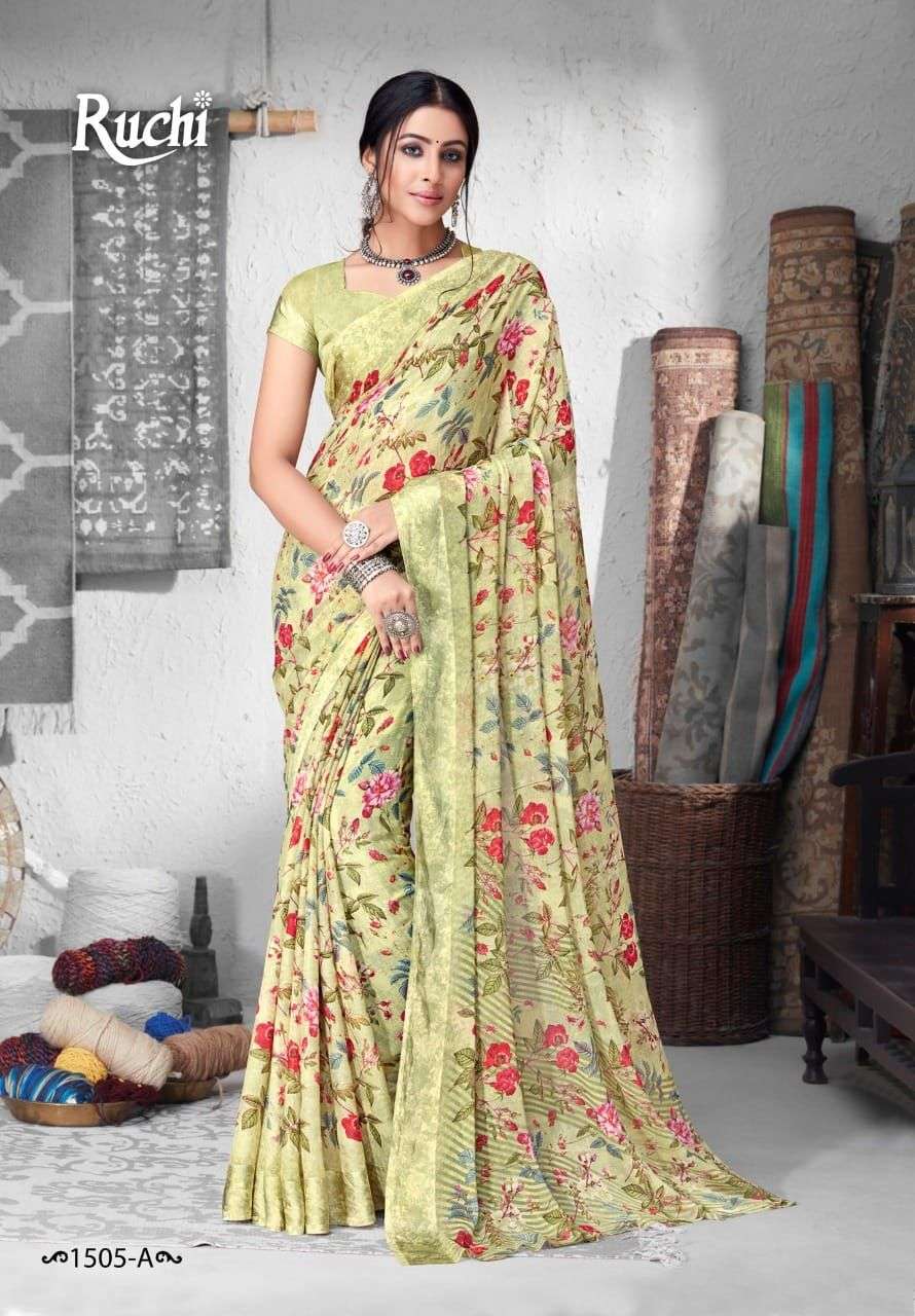 RUCHI SAREES 1. CATALOG - STRAWBERRY 19. 2. FABRIC - CHIFFON SAREE WITH SARTIN WEAVE BORDER. 3. PCS. 12. 4. WEIGHT - 450 GRAMS APPROX. Rate- 460 per pcs . Delivery from today |