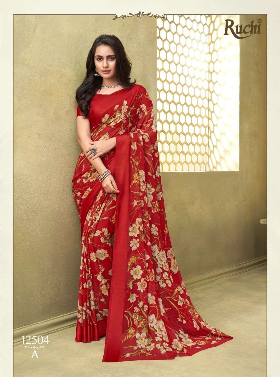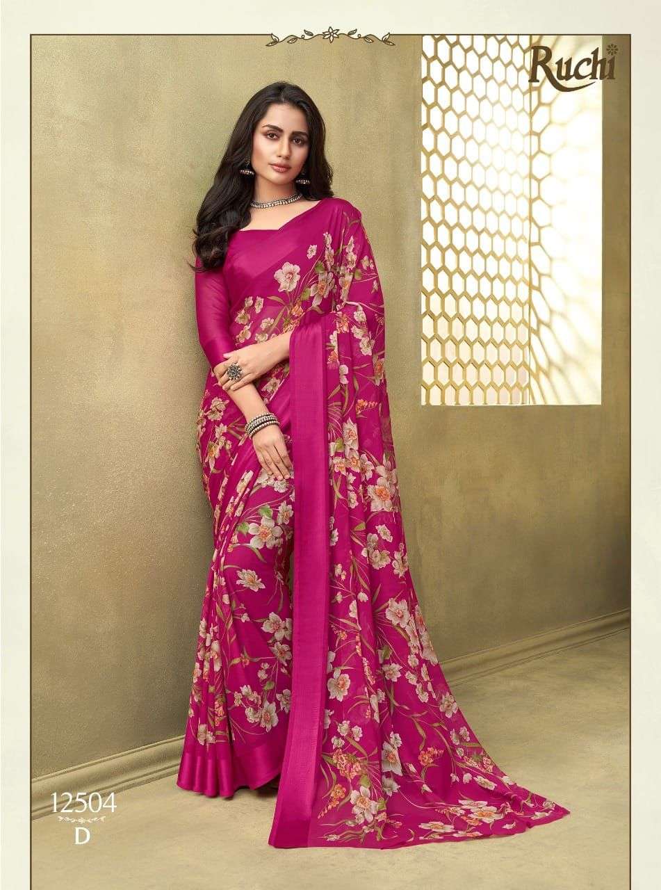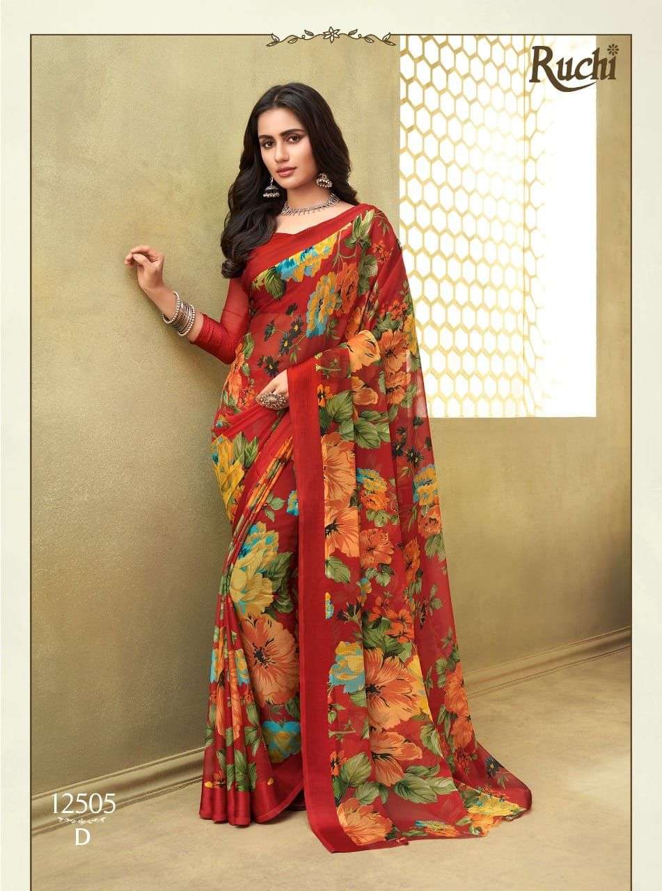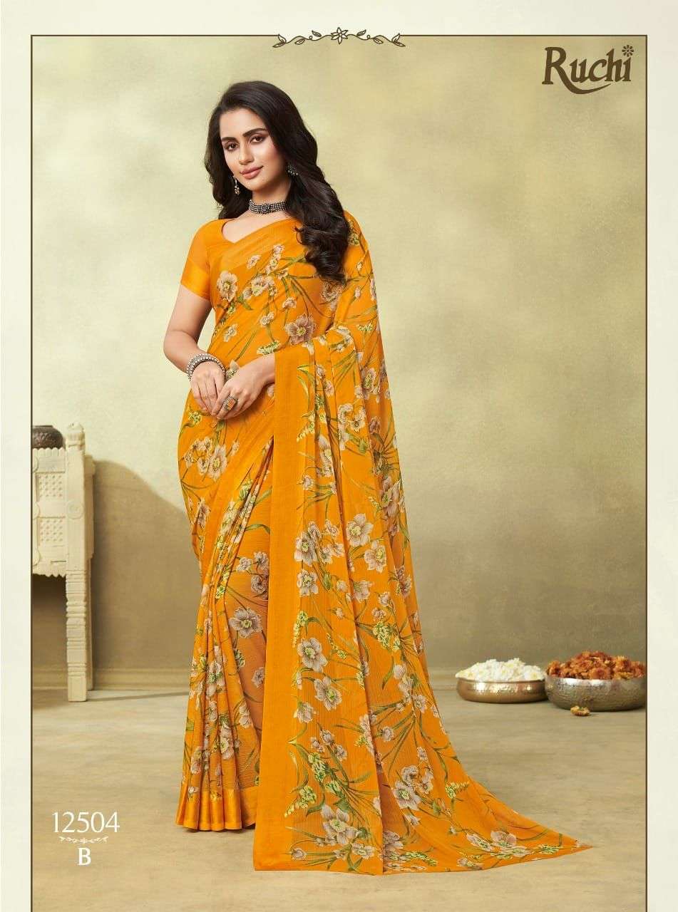 Ruchi Sarees. 2). Fabric - Chiffon Saree with weaved Sartin Border. |