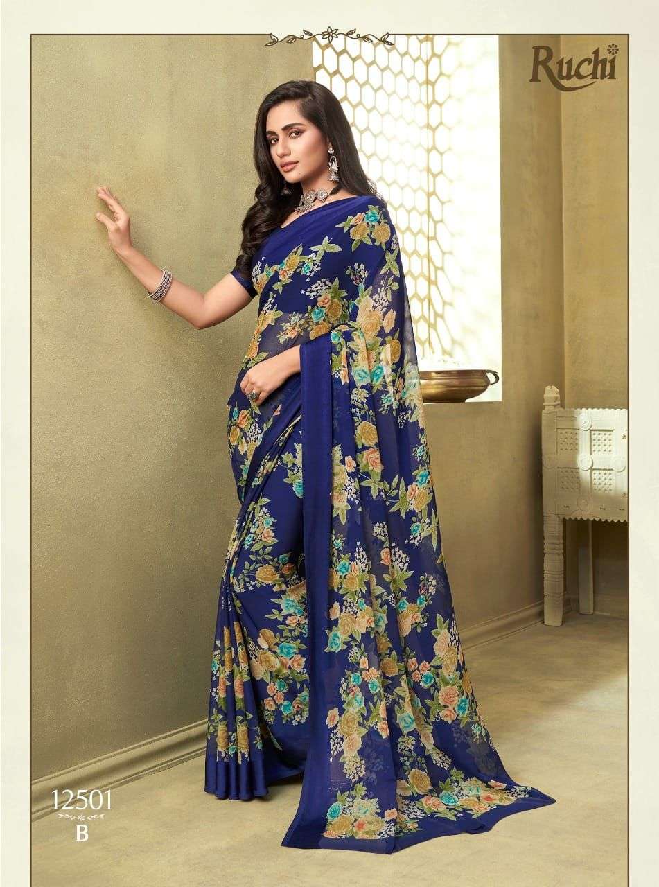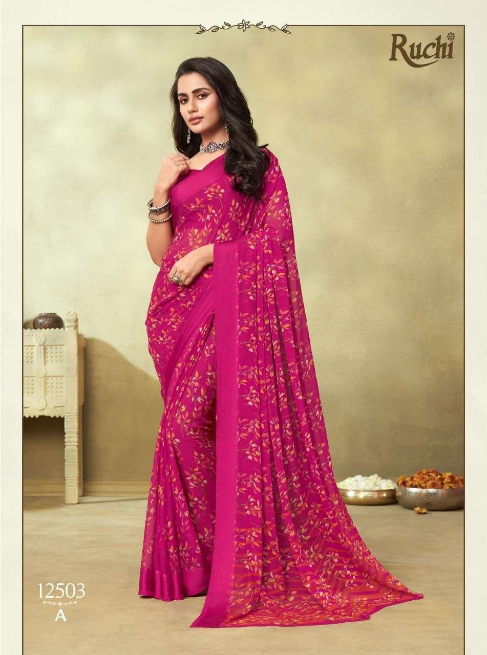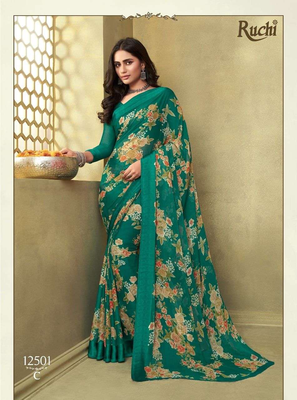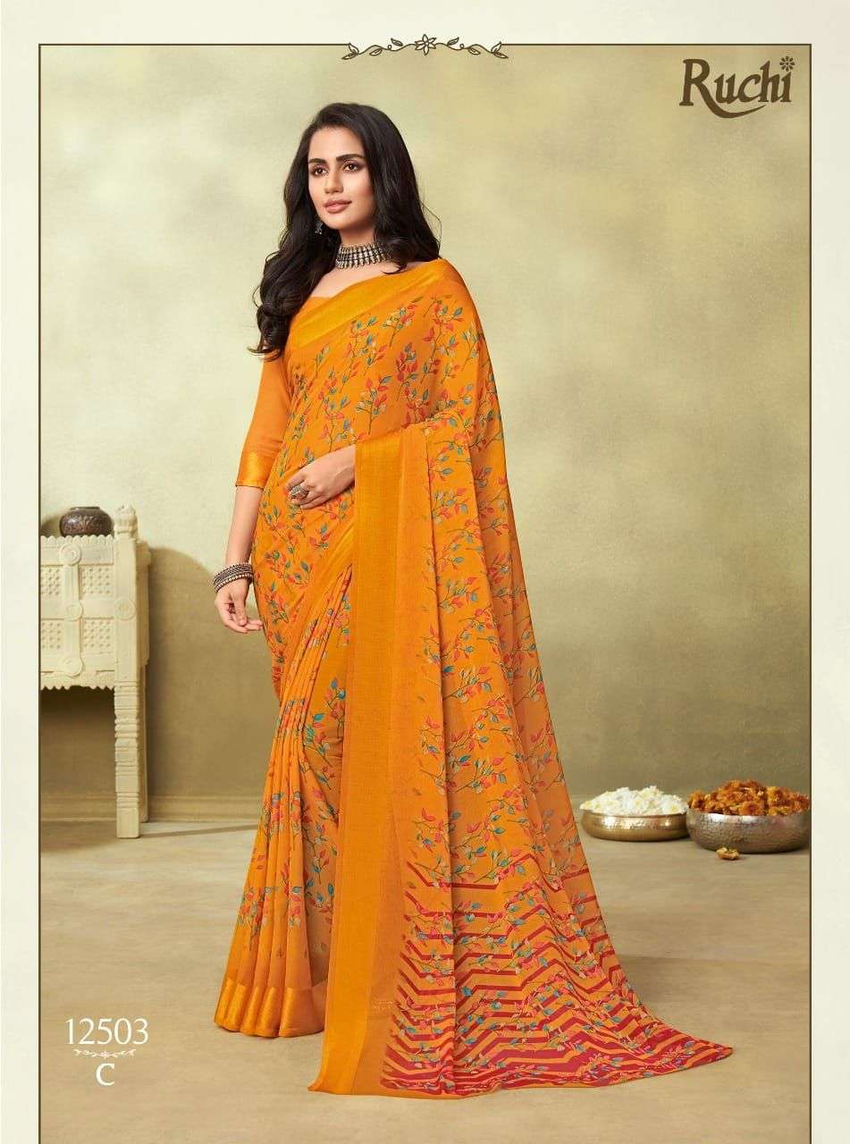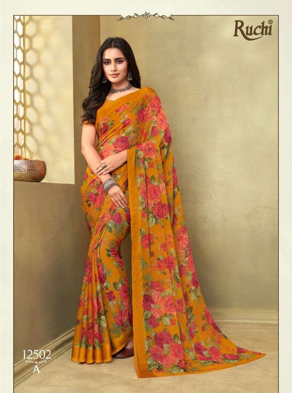 Ruchi Sarees. 2). Fabric - Chiffon Saree with weaved Sartin Border. |