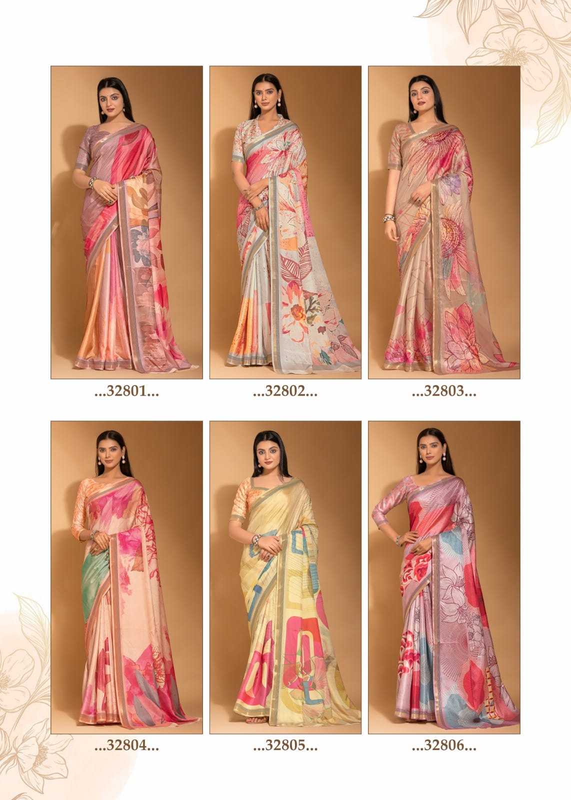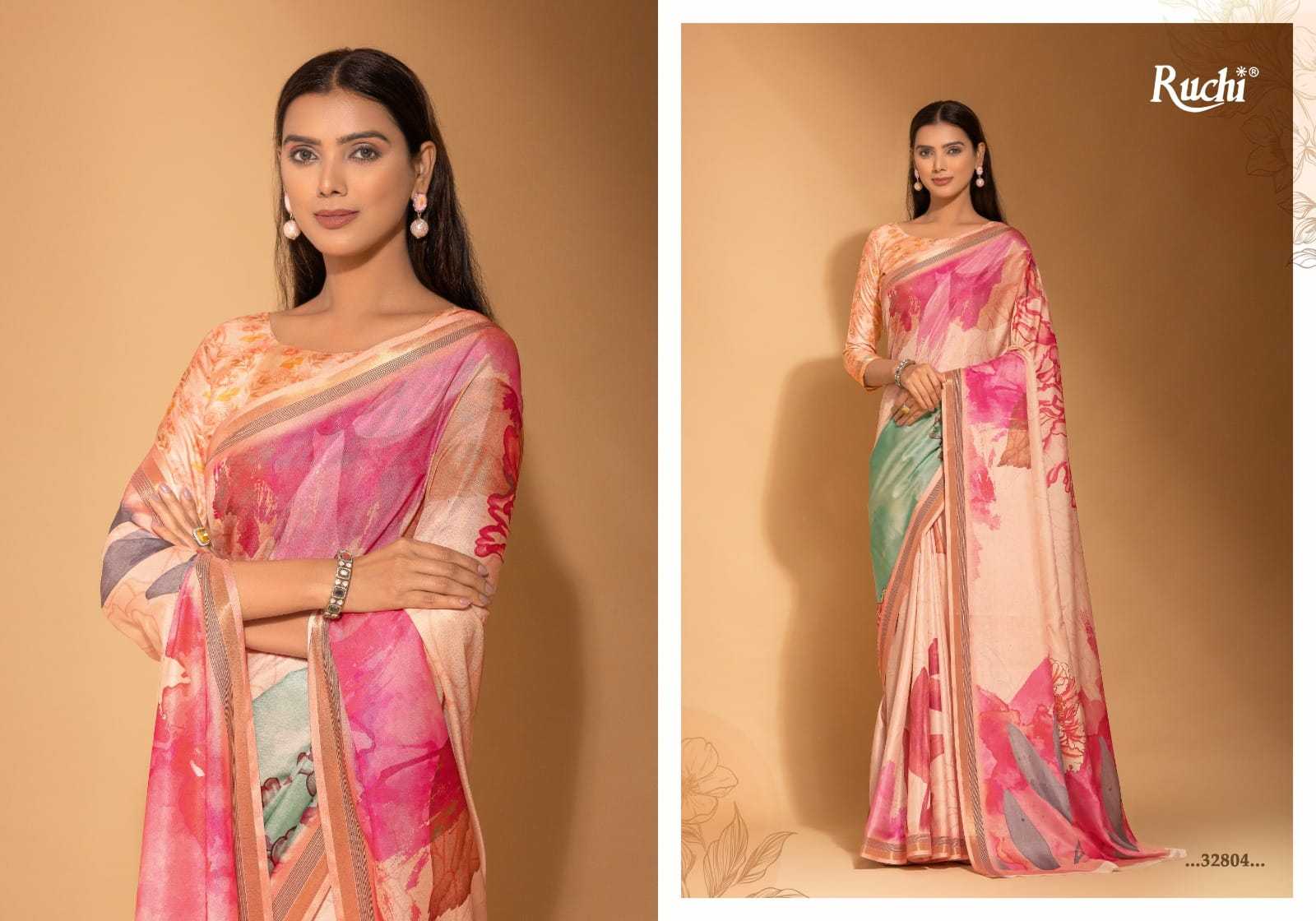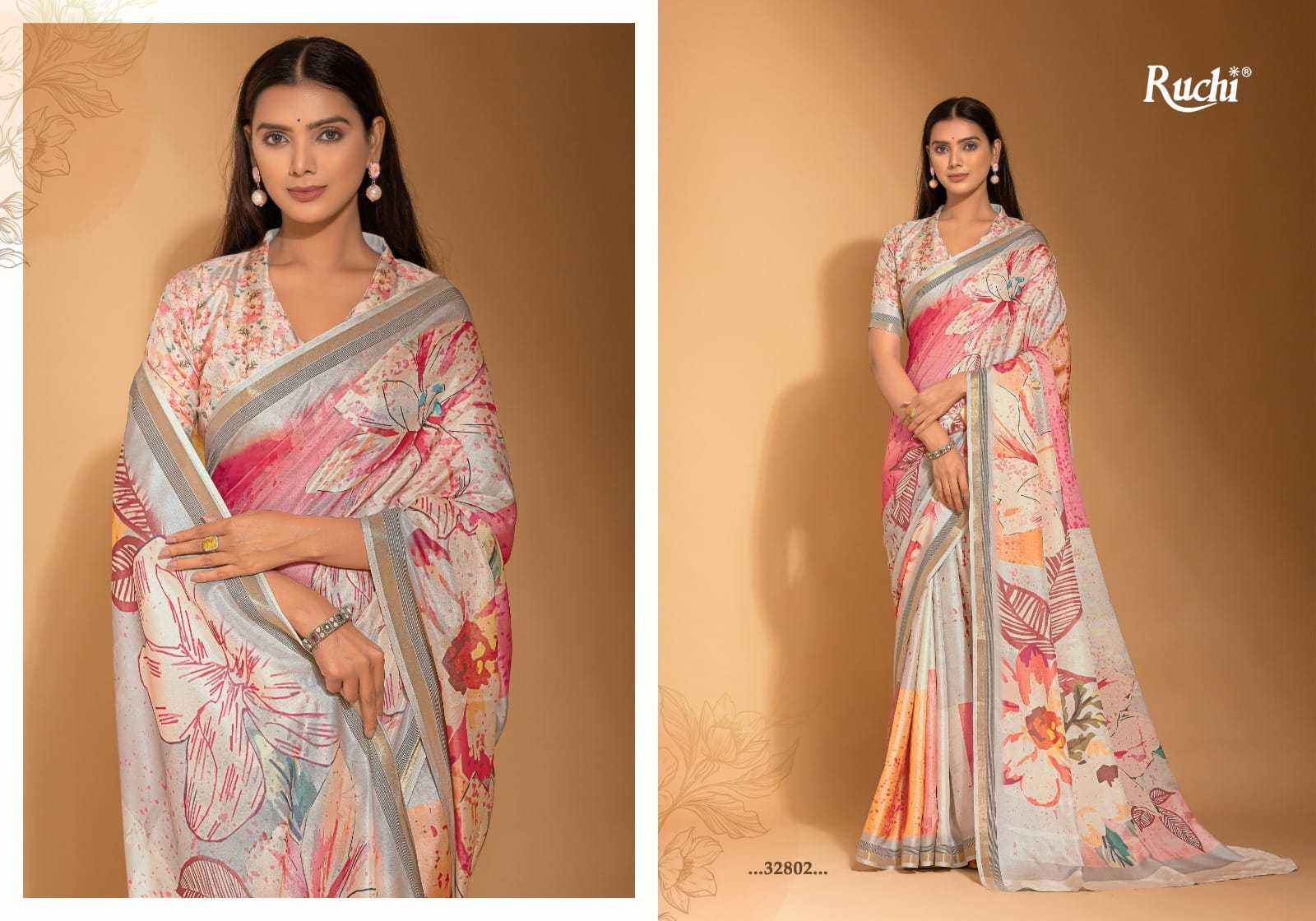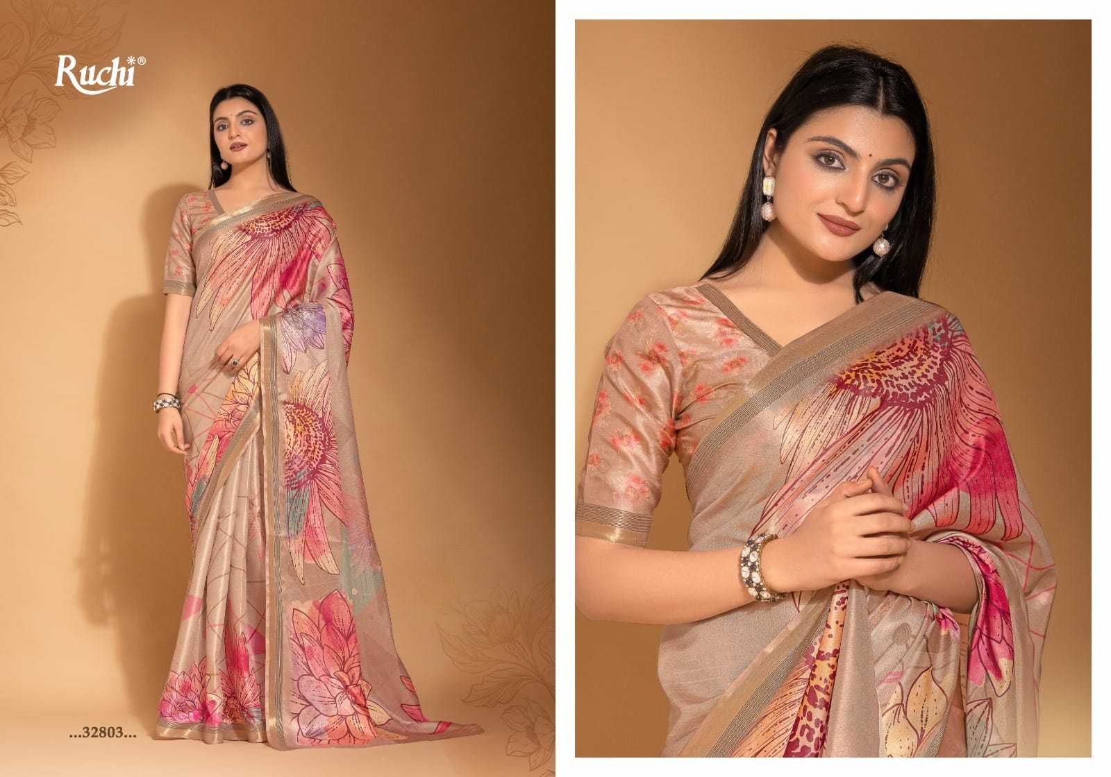Hello, Ruchi Sarees 1. CATALOG - Taapsi 3. Fabric - Digital Print Tussar Silk Saree with Gold Weaved Boder. Rate- 839/- per pcs GST EXTRA set to set |